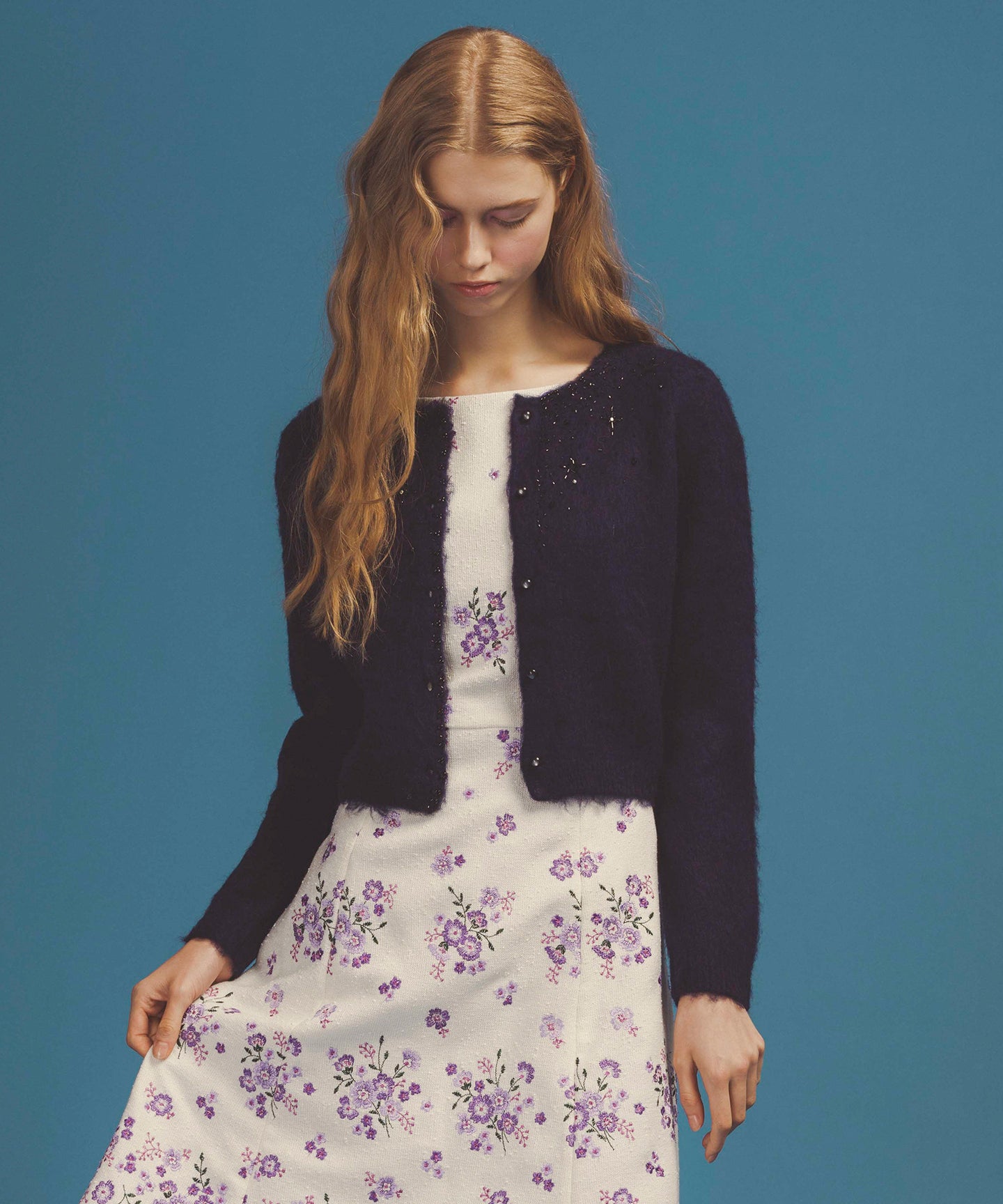 ふんわりと柔らかなモヘア素材ふんわりと空気を含んだような軽やかさと、柔らかく包み込まれるような肌ざわりが魅力のモヘア素材に、繊細なビーズ刺繍を一粒一粒丁寧にあしらった、ロマンティックな表情のニット。