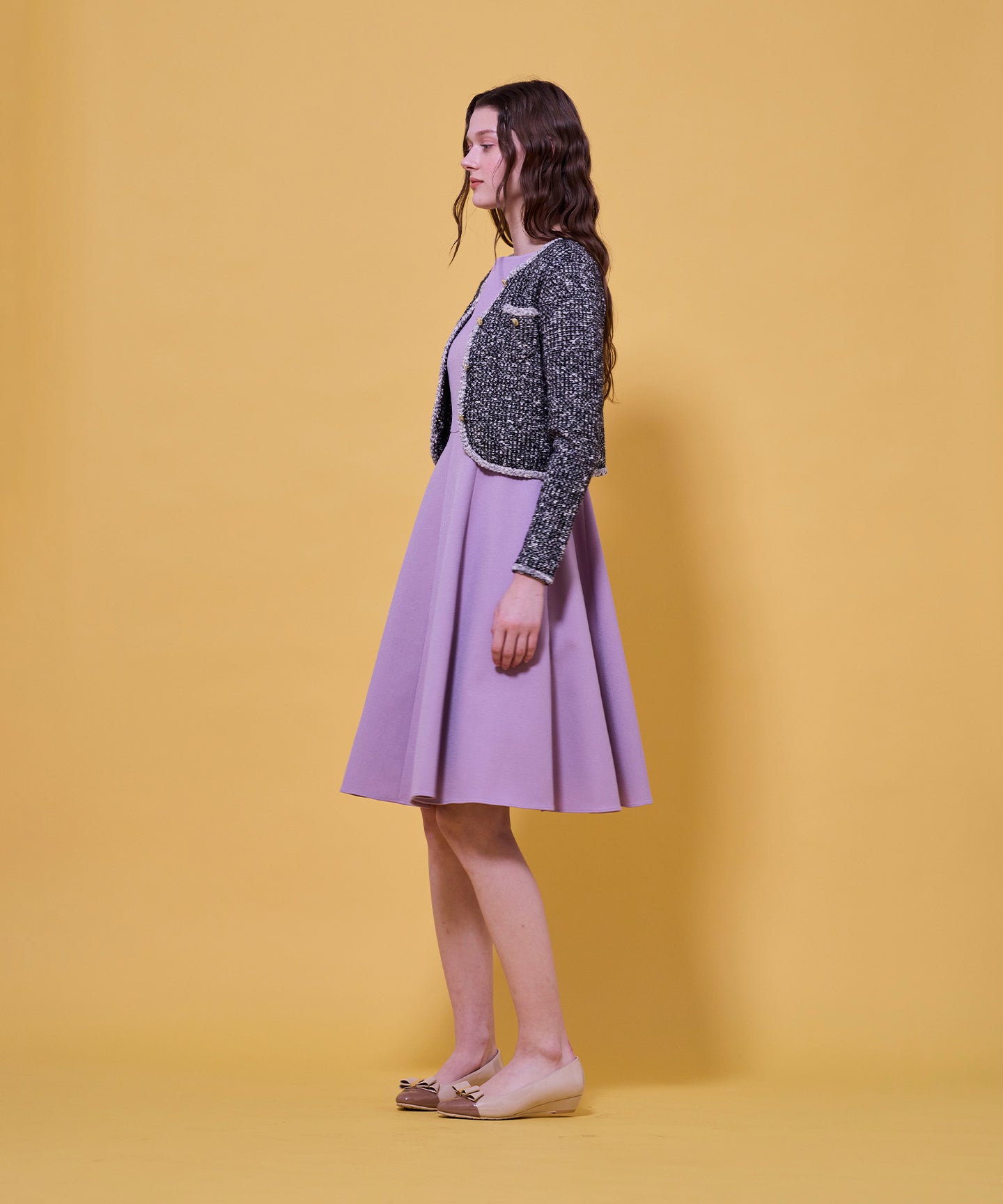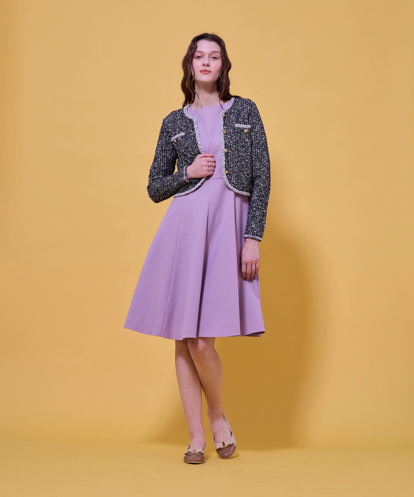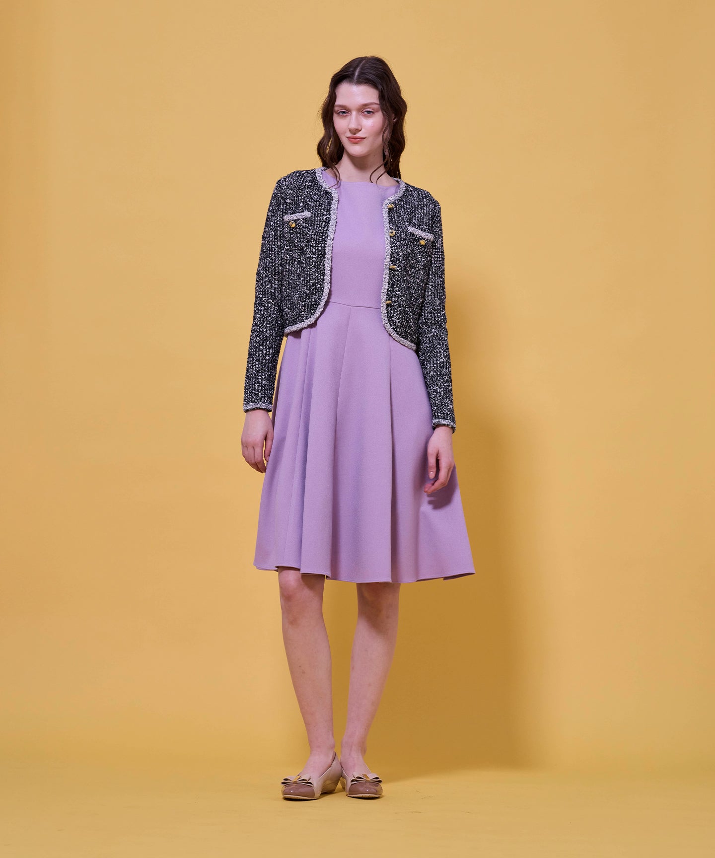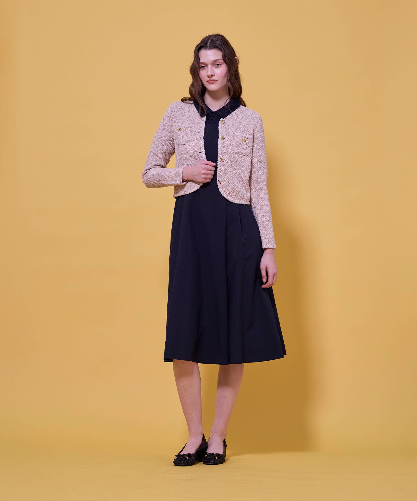 繊細な表情を持つミックスツイードの様に編み立てた、上品なニットジャケット。 リュクスな風合いが漂いながらも、軽やかに羽織れるのが魅力の一着です。コンパクトなシルエットと、ポイントになる縁取りやゴールドボタンなどのディテールが程よいアクセントとなり、きちんと感の中に華やかさと女性らしさをプラス。ショート丈のバランスはワンピースやスカート、ハイウエストボトムとの相性も抜群で、自然とスタイルアップを叶えます。 フォーマルからデイリーまで幅広く活躍し、コーディネートを洗練された印象へと導いてくれる万能なジャケット。 シックで大人なブラックミックス、フェミニン度たっぷりの可愛らしいピンクミックス、きちんと感や清楚な雰囲気があるオフミックスの3色展開です。