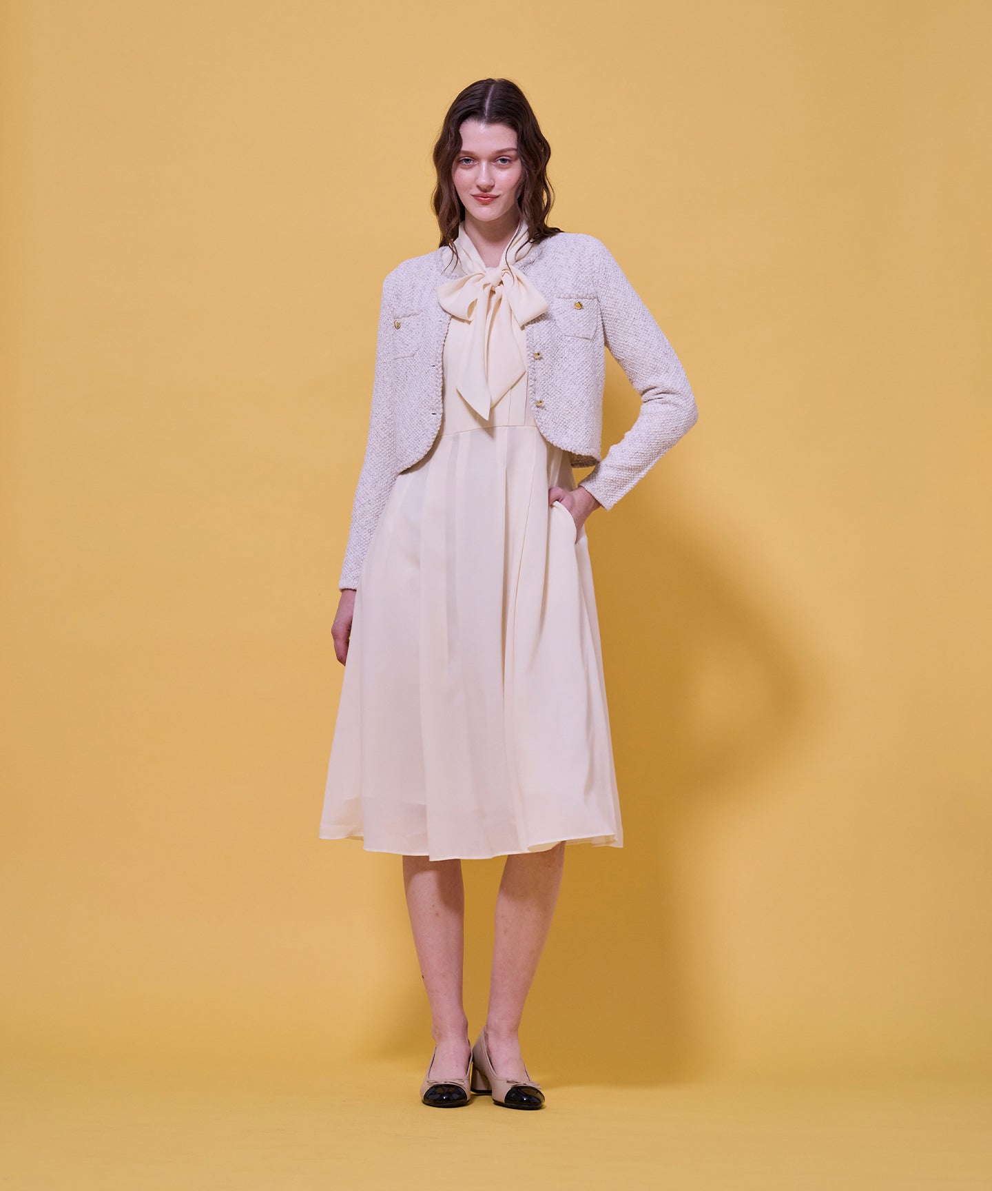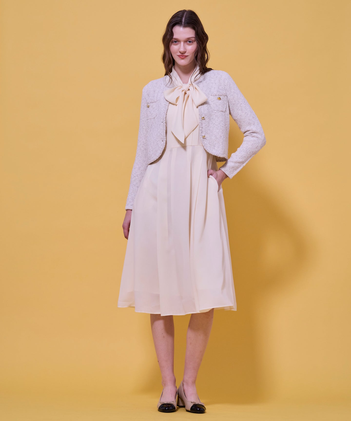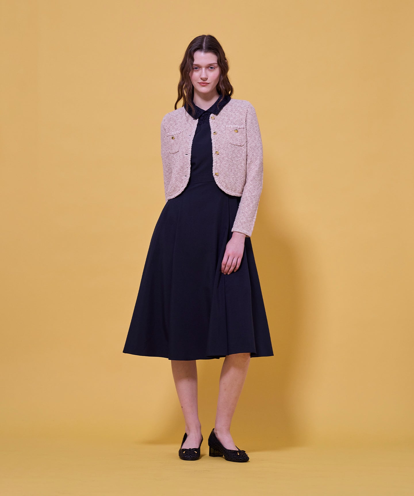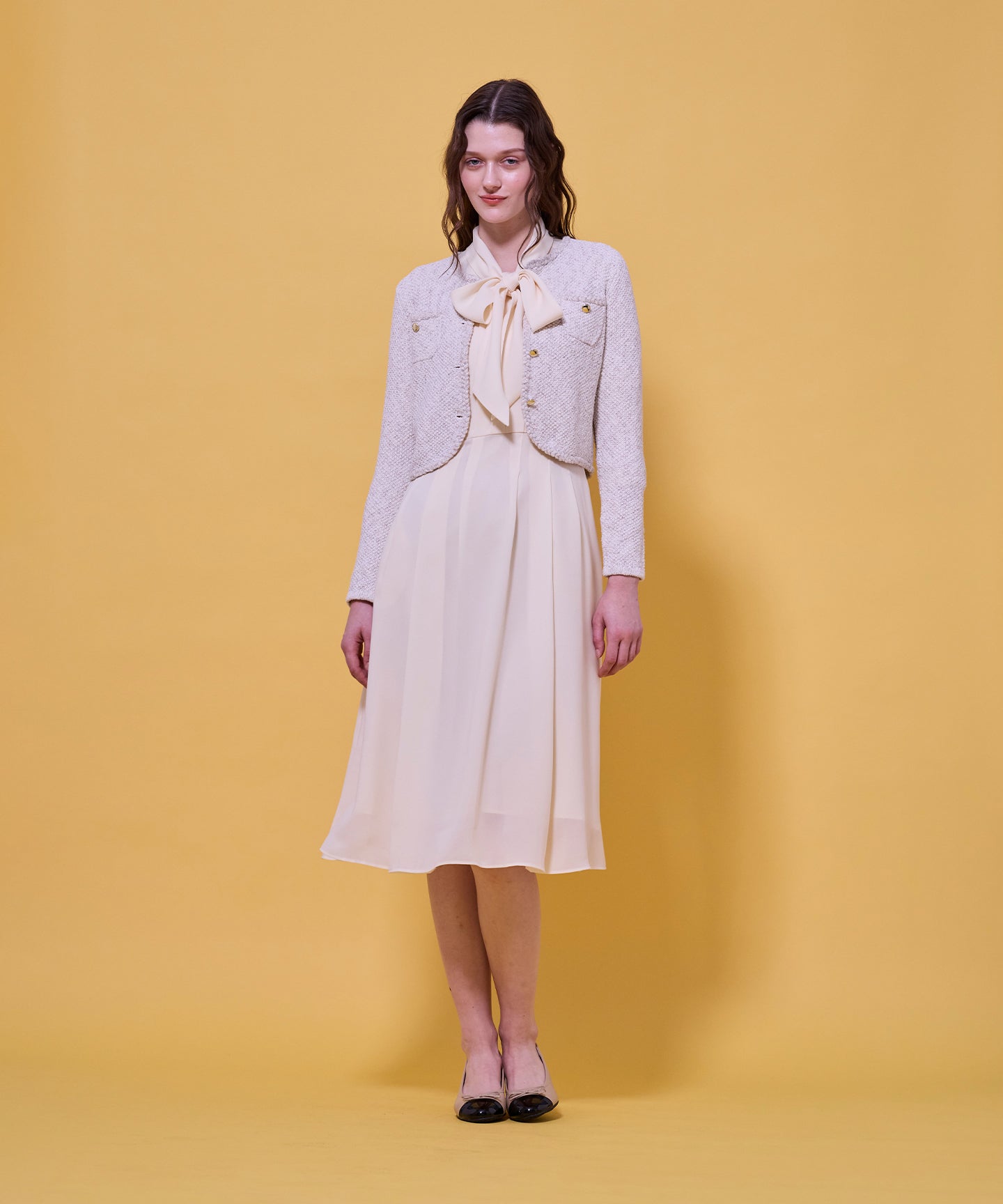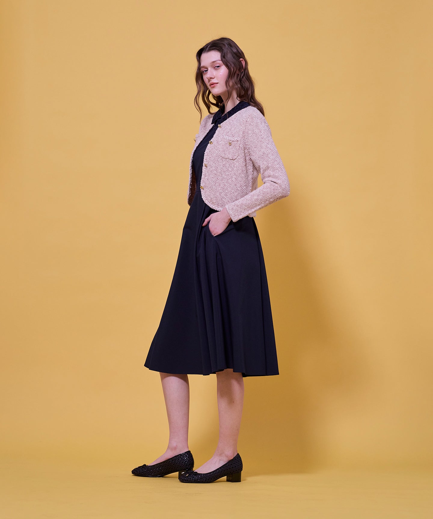 繊細な表情を持つミックスツイードの様に編み立てた、上品なニットジャケット。 リュクスな風合いが漂いながらも、軽やかに羽織れるのが魅力の一着です。コンパクトなシルエットと、ポイントになる縁取りやゴールドボタンなどのディテールが程よいアクセントとなり、きちんと感の中に華やかさと女性らしさをプラス。ショート丈のバランスはワンピースやスカート、ハイウエストボトムとの相性も抜群で、自然とスタイルアップを叶えます。 フォーマルからデイリーまで幅広く活躍し、コーディネートを洗練された印象へと導いてくれる万能なジャケット。 シックで大人なブラックミックス、フェミニン度たっぷりの可愛らしいピンクミックス、きちんと感や清楚な雰囲気があるオフミックスの3色展開です。
