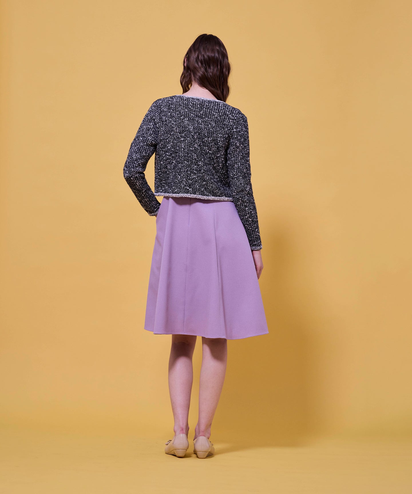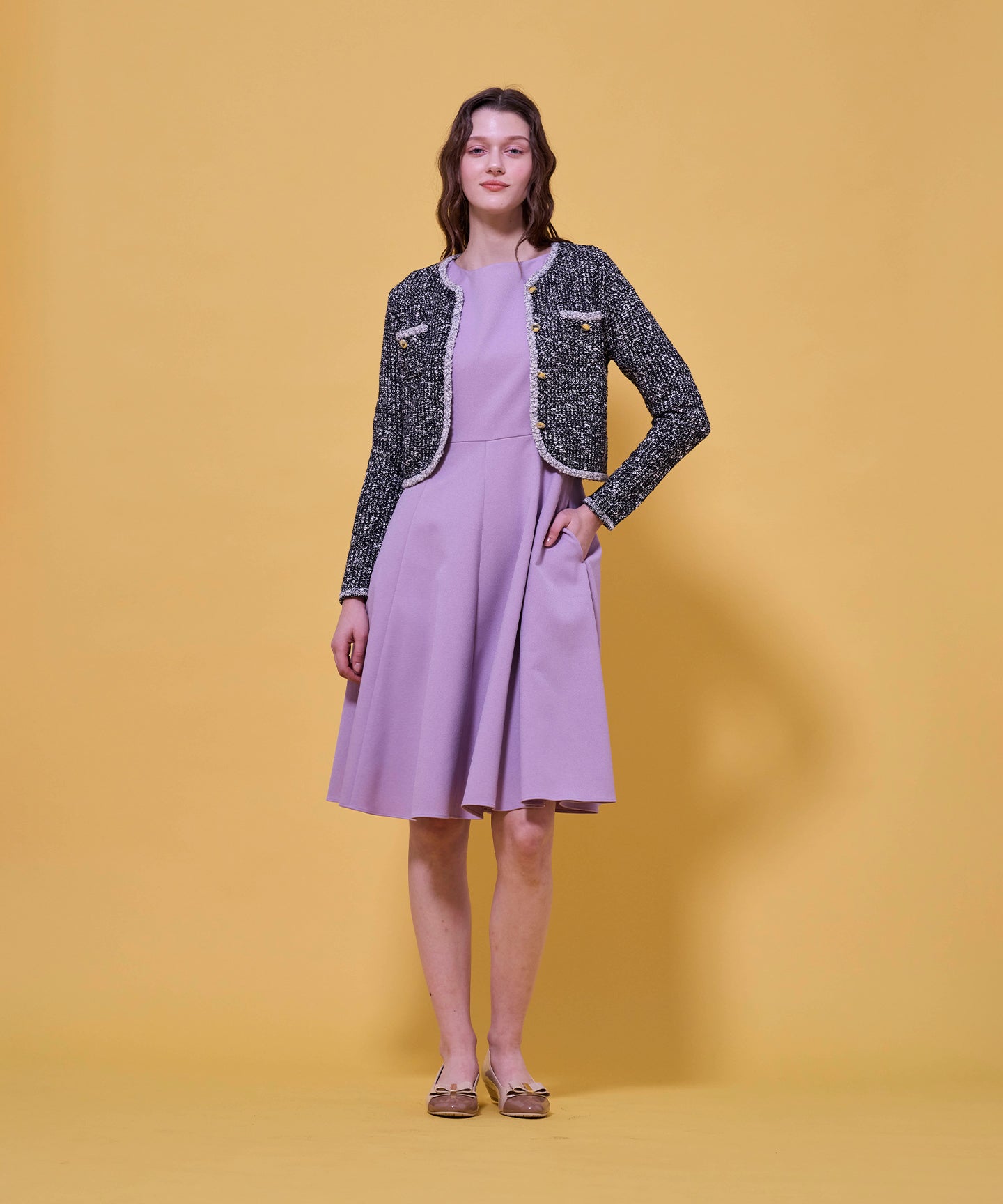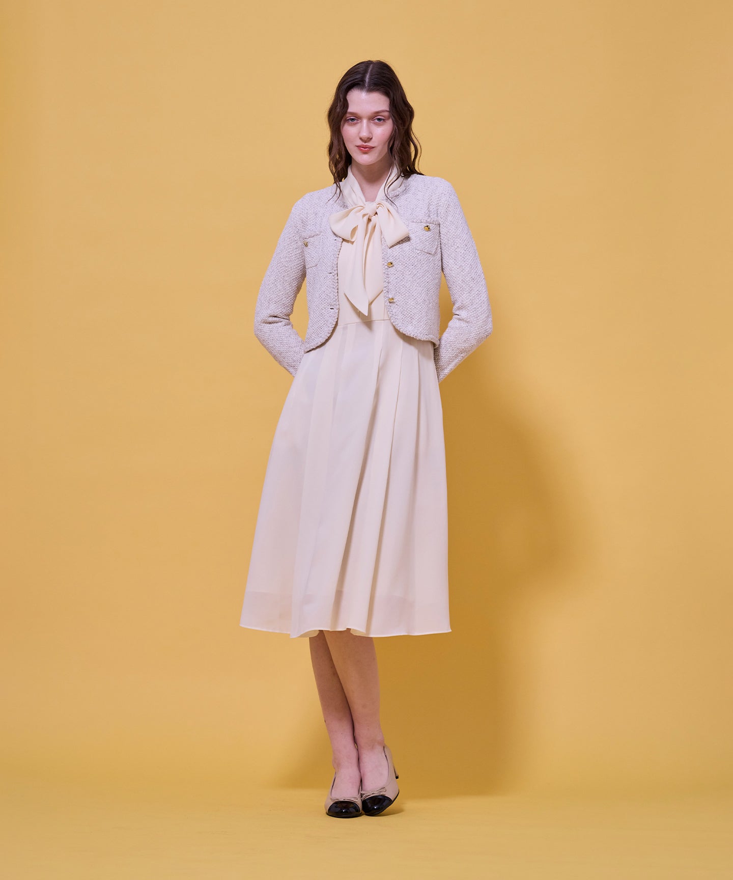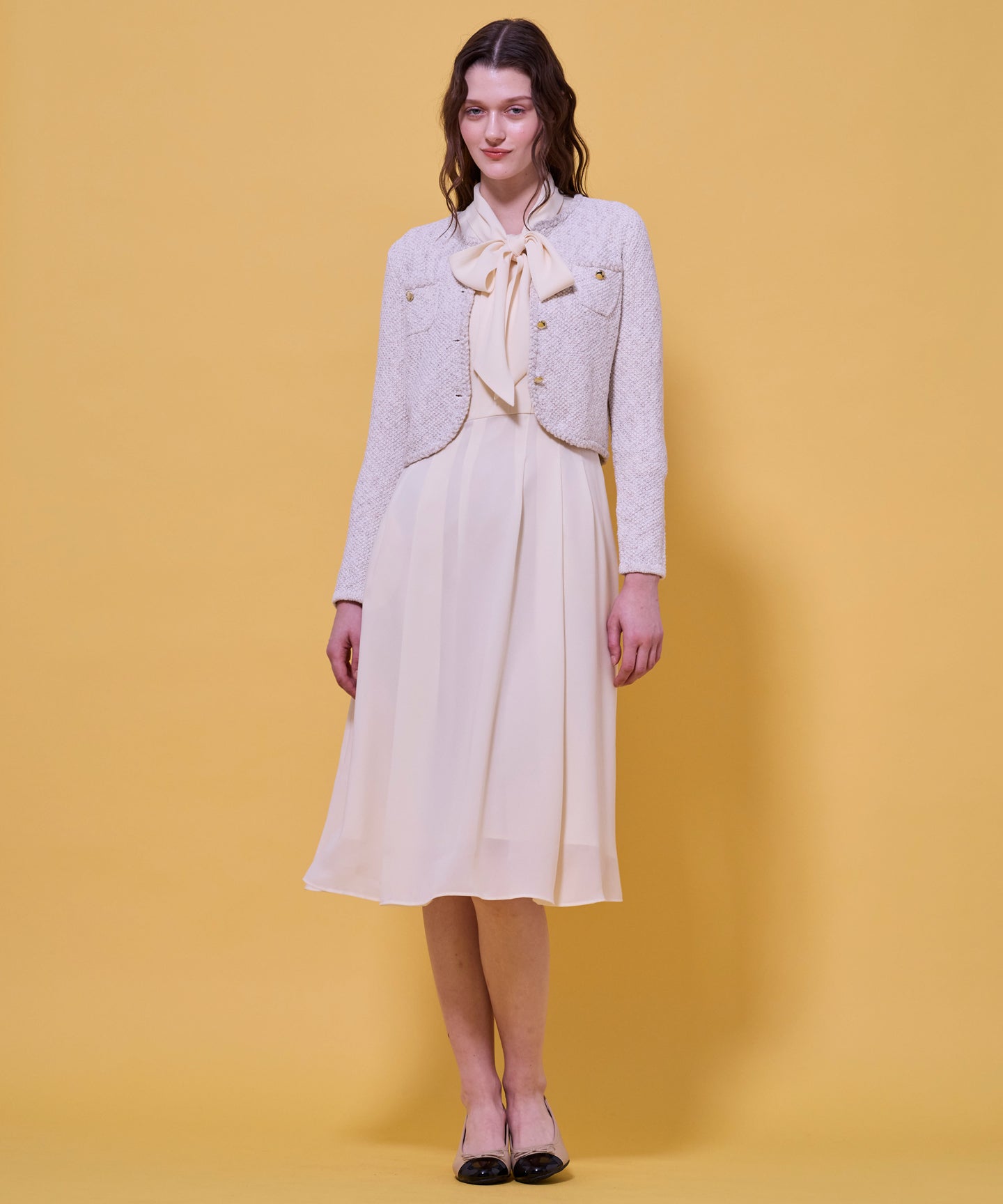 繊細な表情を持つミックスツイードの様に編み立てた、上品なニットジャケット。 リュクスな風合いが漂いながらも、軽やかに羽織れるのが魅力の一着です。コンパクトなシルエットと、ポイントになる縁取りやゴールドボタンなどのディテールが程よいアクセントとなり、きちんと感の中に華やかさと女性らしさをプラス。ショート丈のバランスはワンピースやスカート、ハイウエストボトムとの相性も抜群で、自然とスタイルアップを叶えます。 フォーマルからデイリーまで幅広く活躍し、コーディネートを洗練された印象へと導いてくれる万能なジャケット。 シックで大人なブラックミックス、フェミニン度たっぷりの可愛らしいピンクミックス、きちんと感や清楚な雰囲気があるオフミックスの3色展開です。