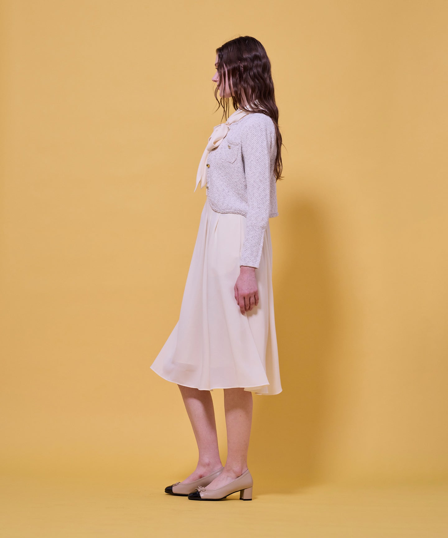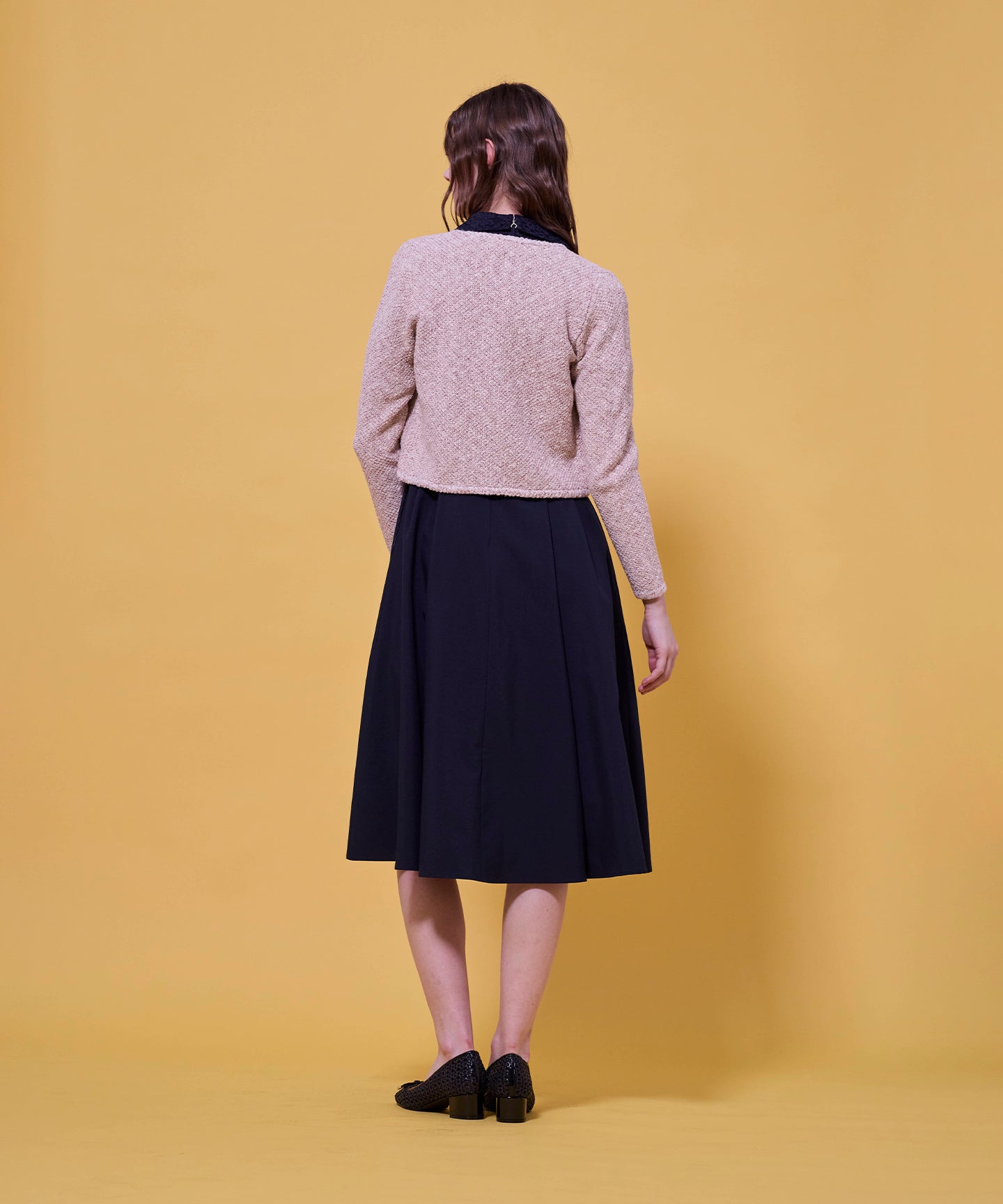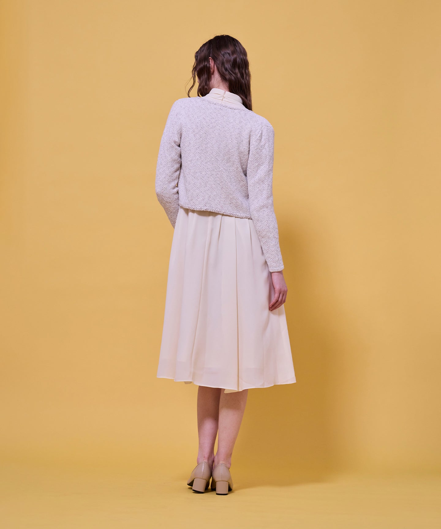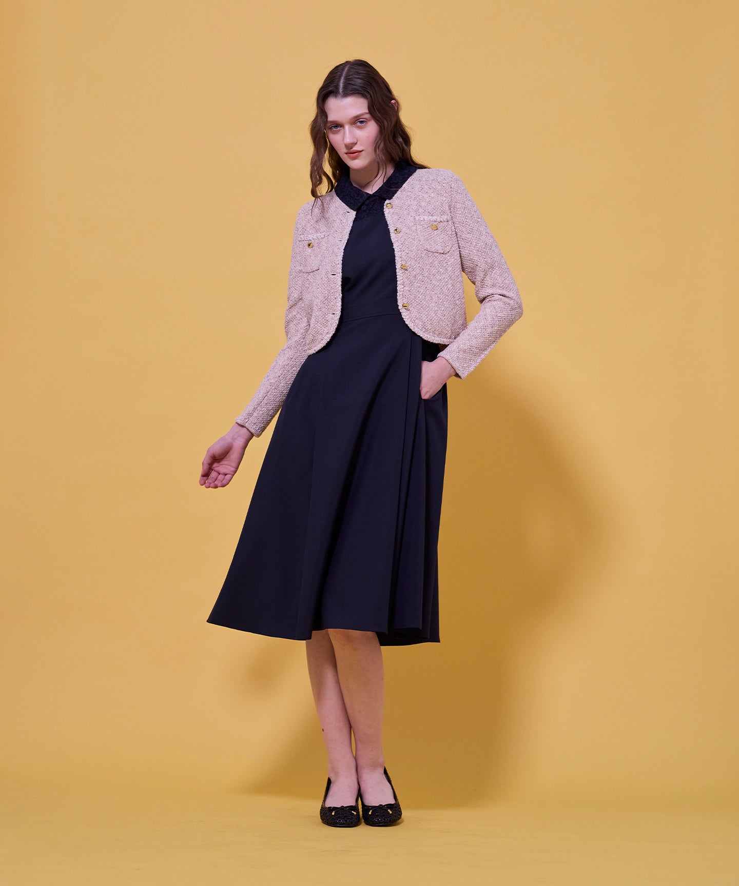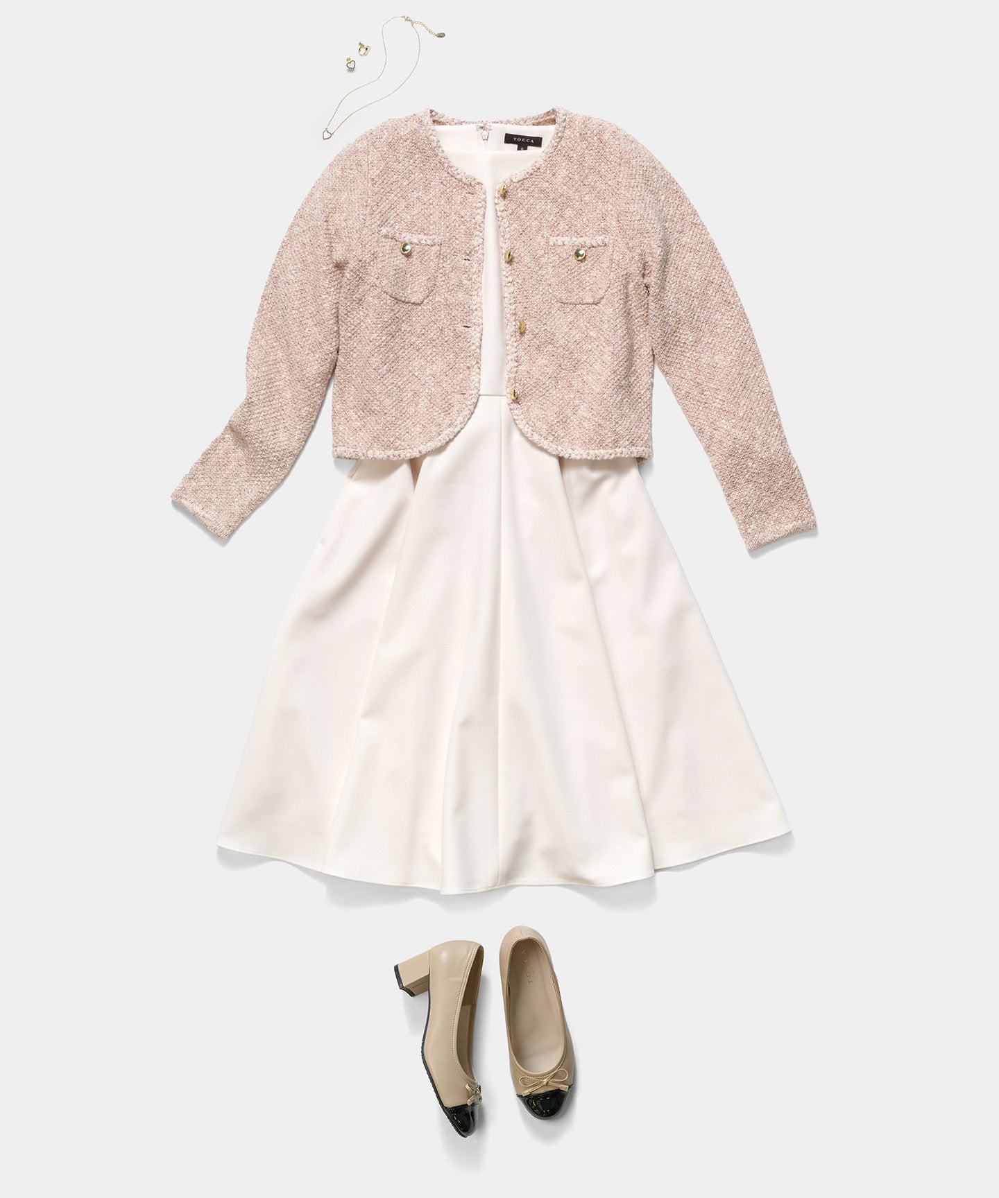 繊細な表情を持つミックスツイードの様に編み立てた、上品なニットジャケット。 リュクスな風合いが漂いながらも、軽やかに羽織れるのが魅力の一着です。コンパクトなシルエットと、ポイントになる縁取りやゴールドボタンなどのディテールが程よいアクセントとなり、きちんと感の中に華やかさと女性らしさをプラス。ショート丈のバランスはワンピースやスカート、ハイウエストボトムとの相性も抜群で、自然とスタイルアップを叶えます。 フォーマルからデイリーまで幅広く活躍し、コーディネートを洗練された印象へと導いてくれる万能なジャケット。 シックで大人なブラックミックス、フェミニン度たっぷりの可愛らしいピンクミックス、きちんと感や清楚な雰囲気があるオフミックスの3色展開です。