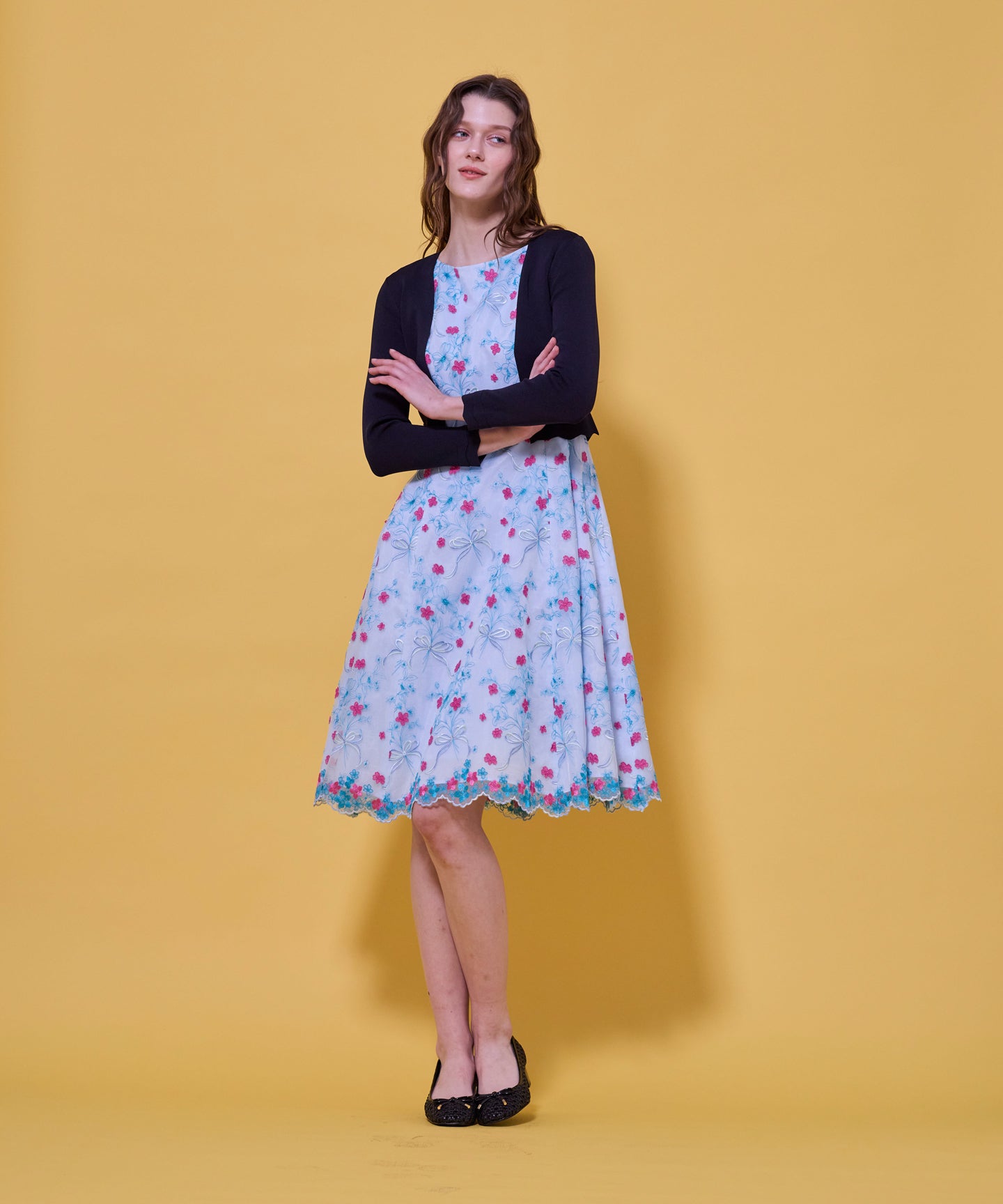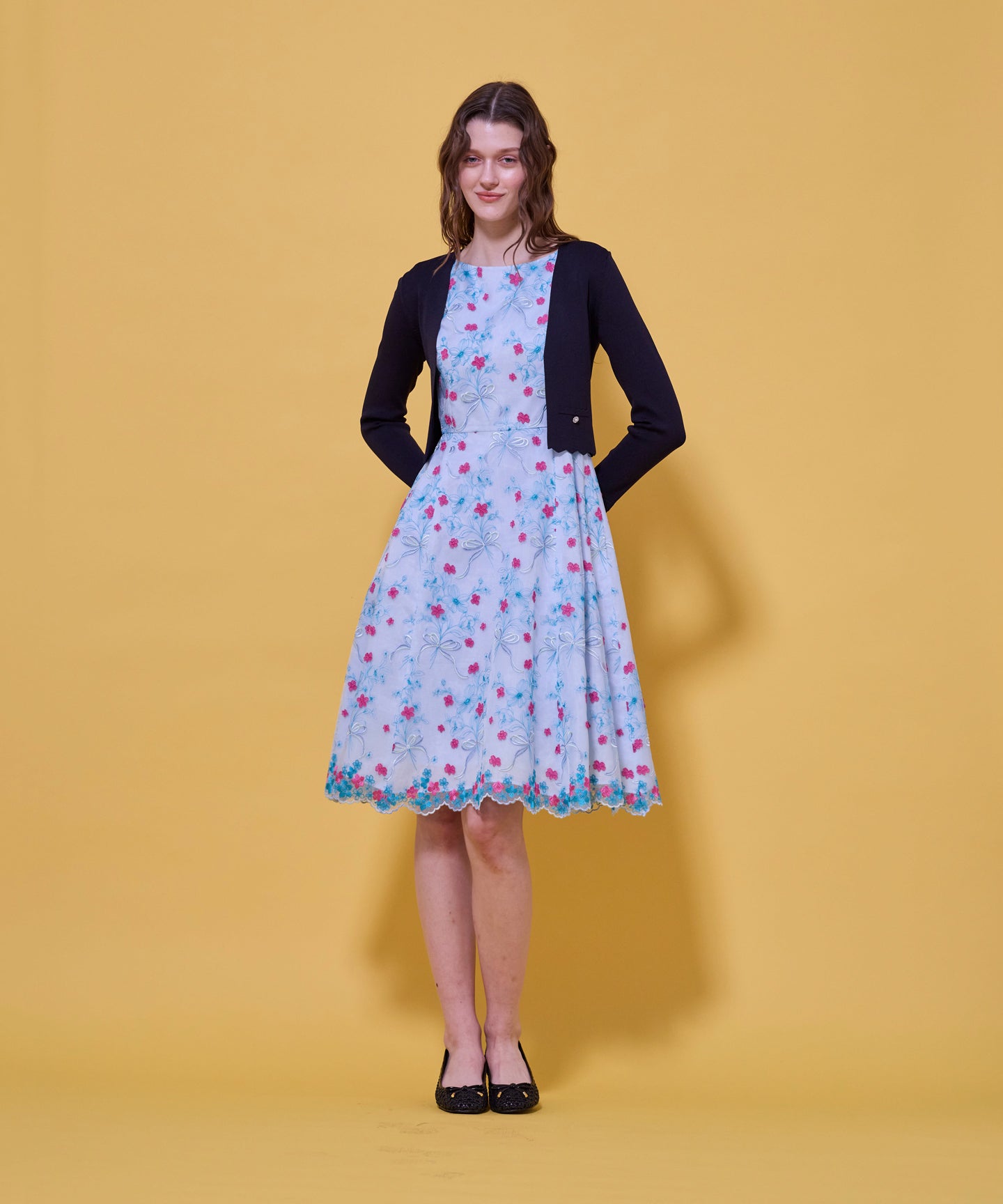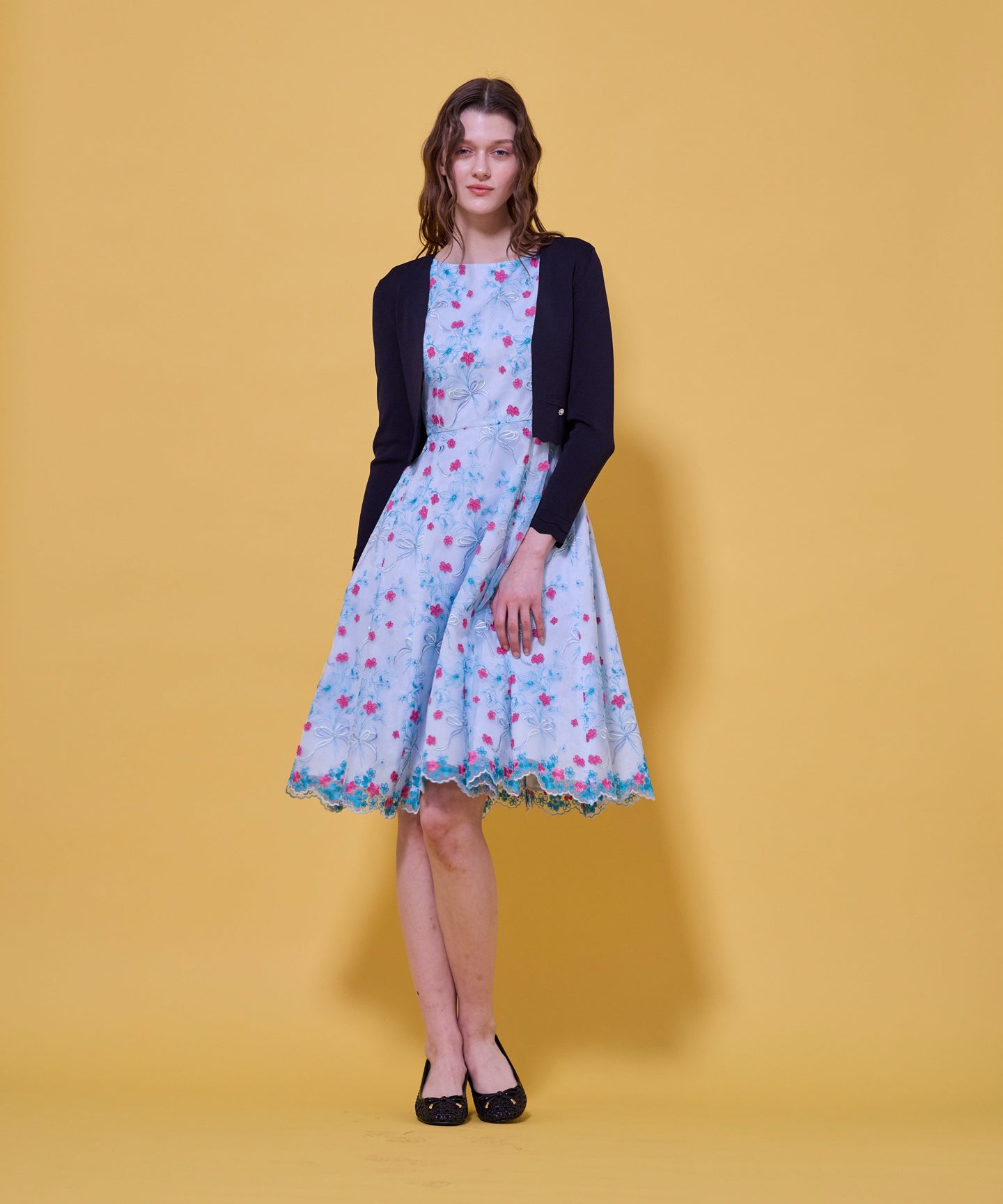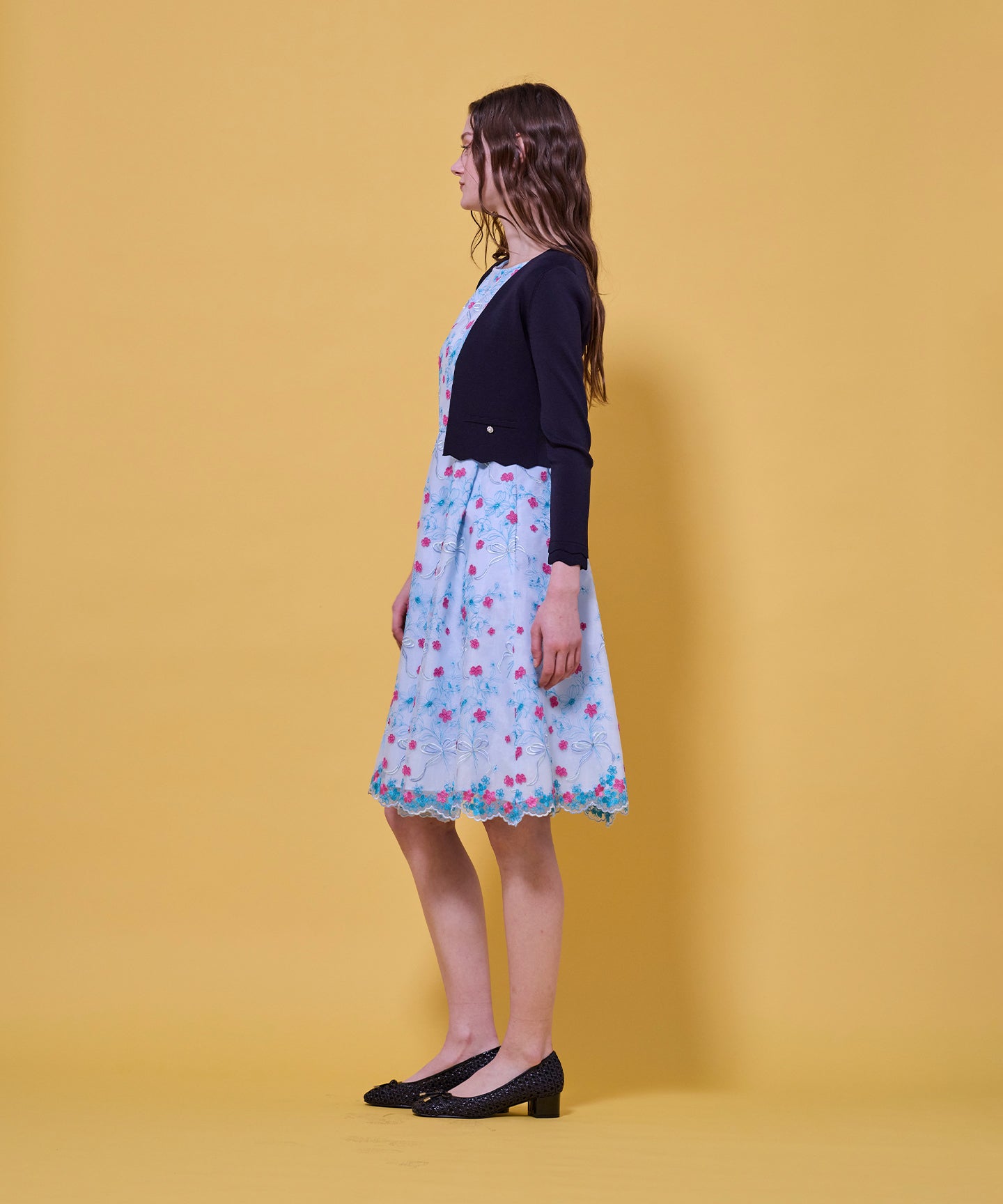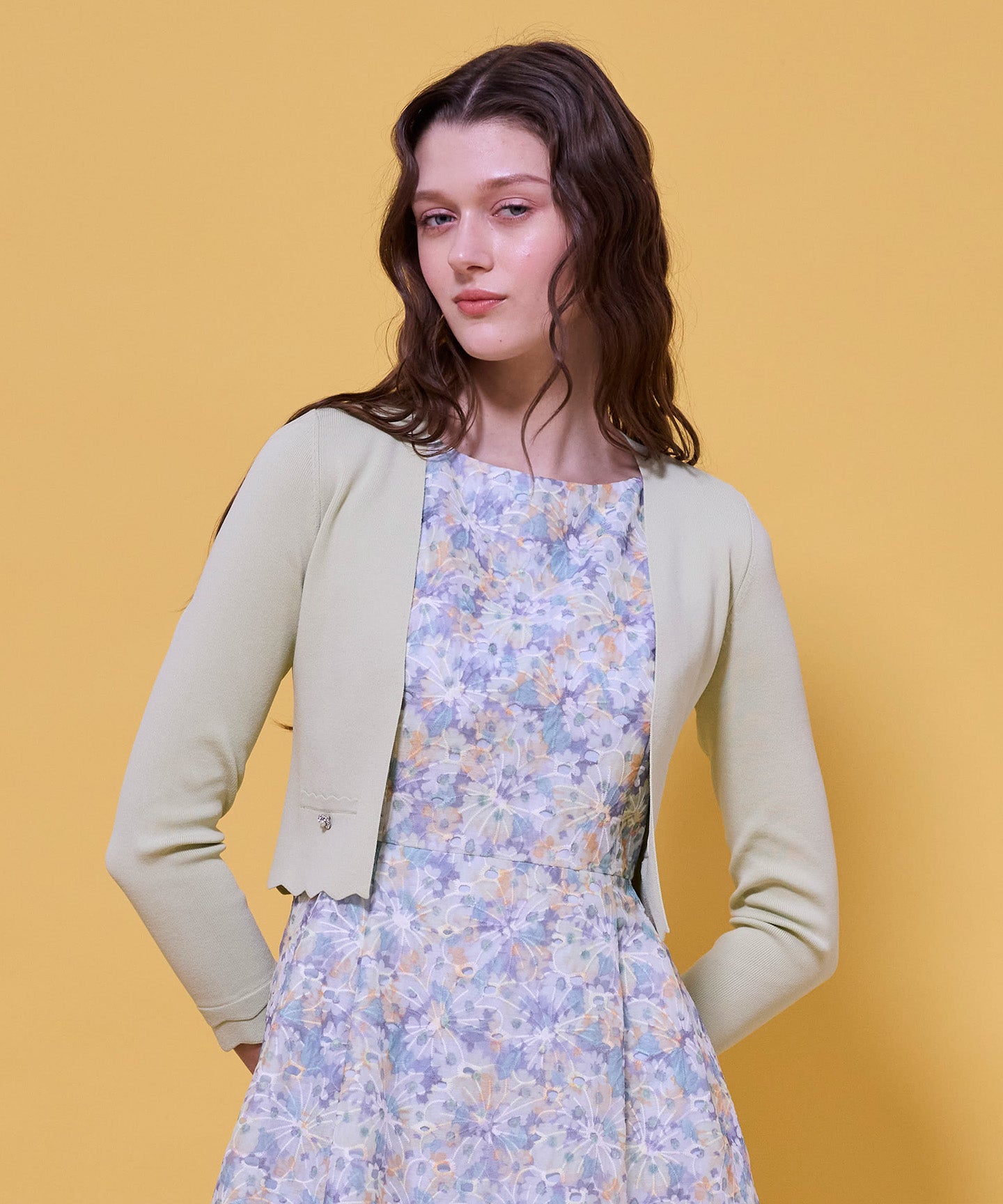 袖口と裾のスカラップデザインが上品さを引き立てるノーカラーボレロ。 コンパクトな丈感ですっきりとした印象に仕上げ、ワンピースやドレスに合わせてフォーマルな場にもふさわしい一枚。前立てのデザインは胸元を美しく見せ、アクセサリーとも相性抜群です。また、裾のカーブラインが自然とウエスト位置を高く見せるため、スタイルアップ効果も期待できます。