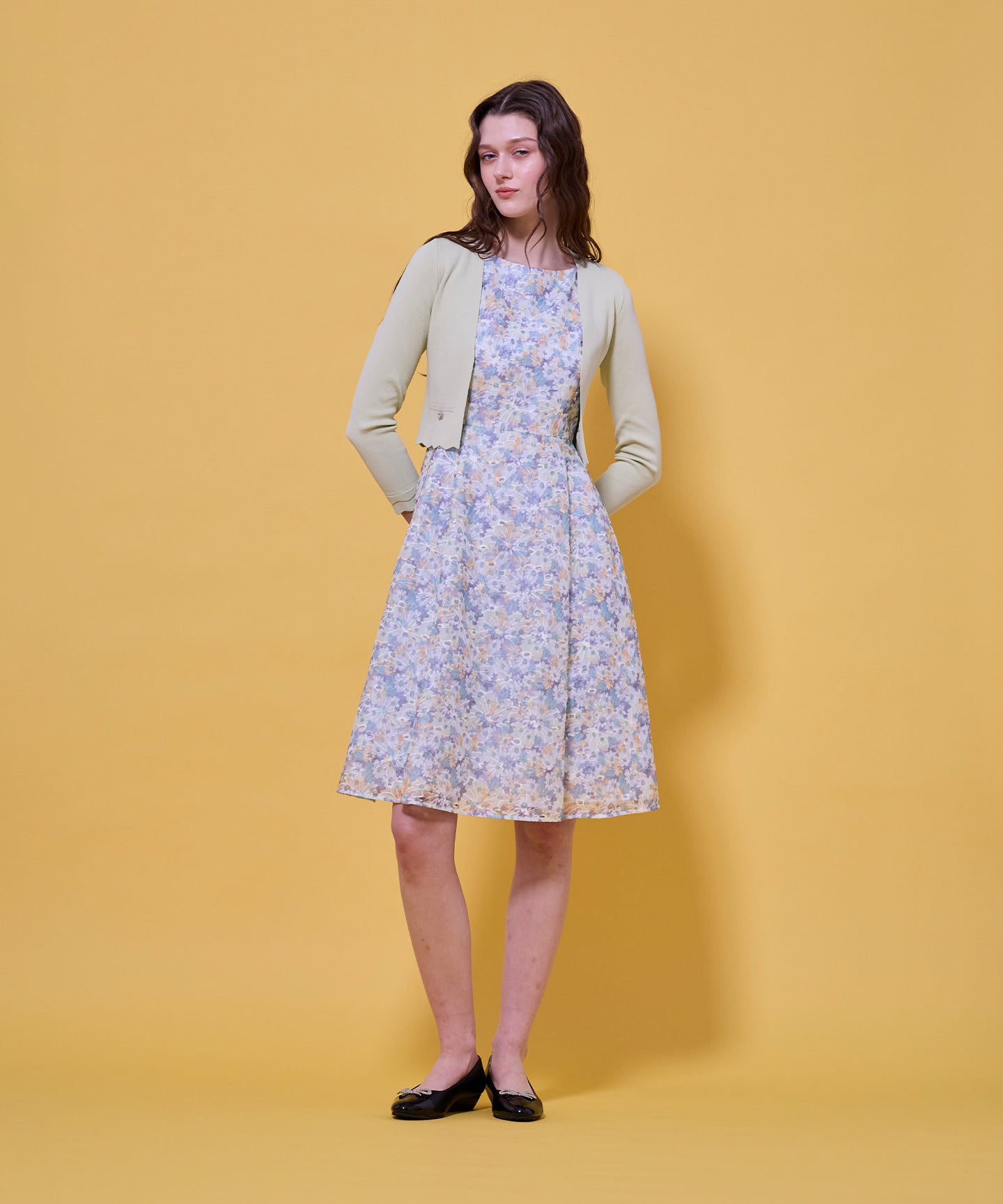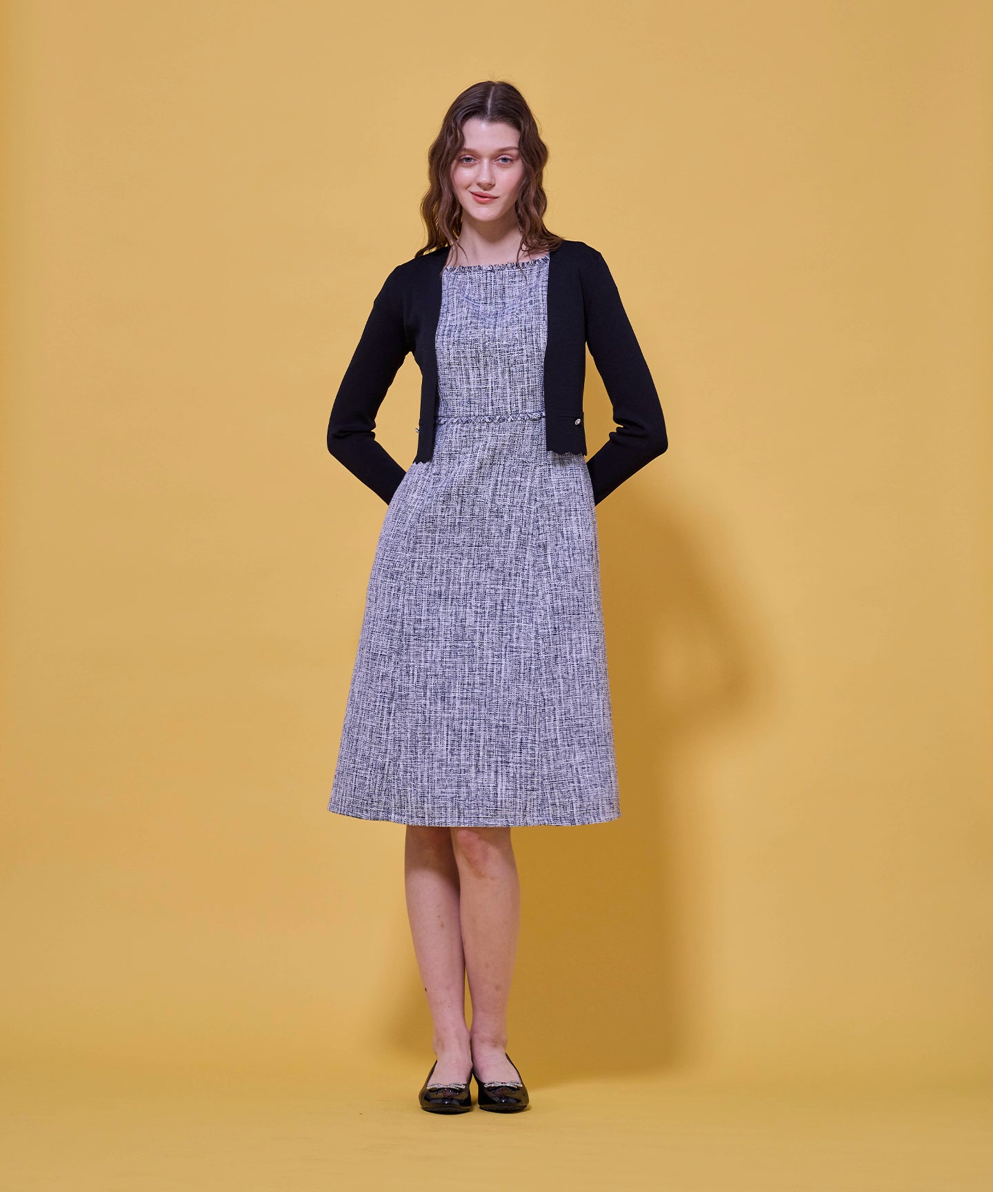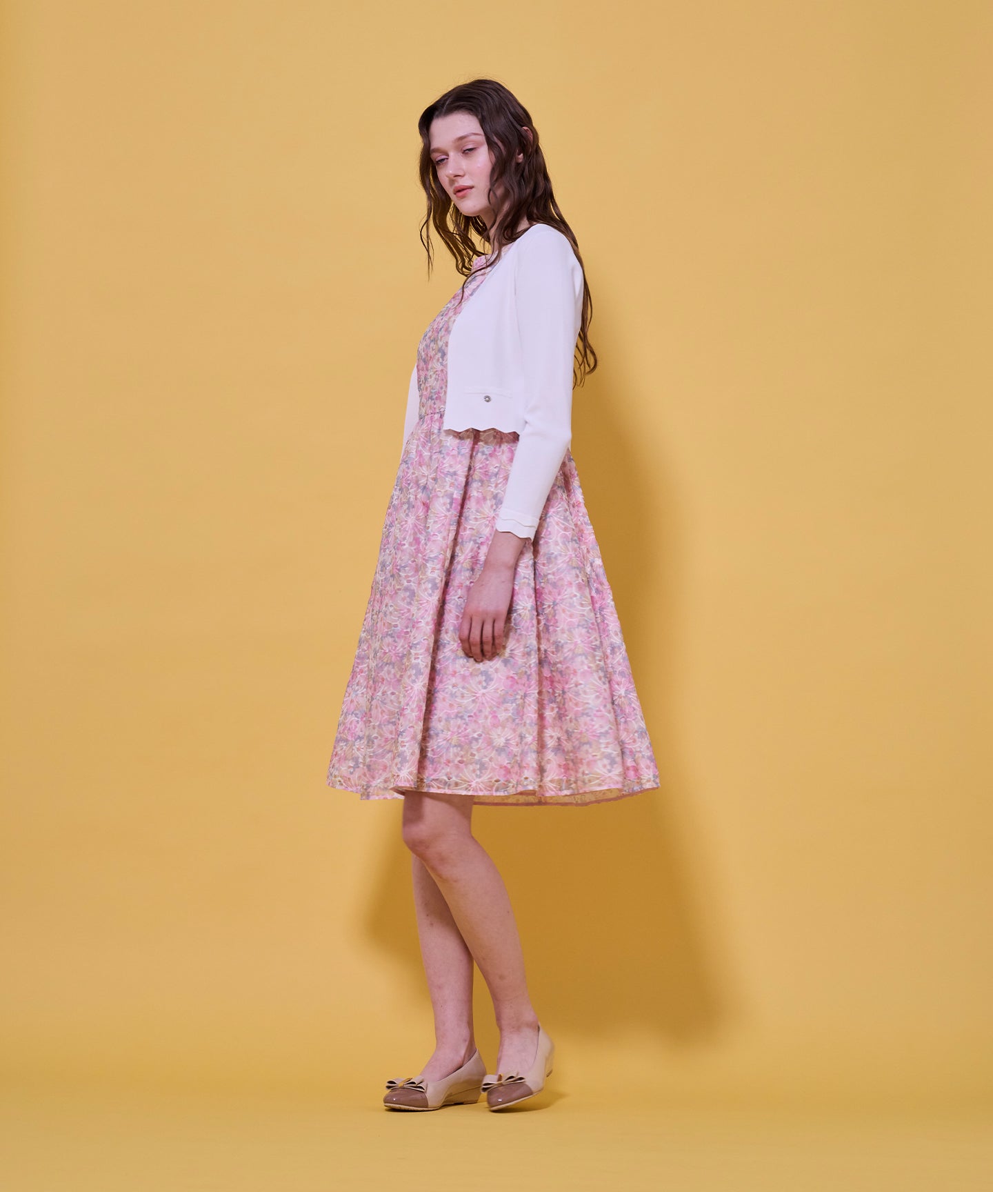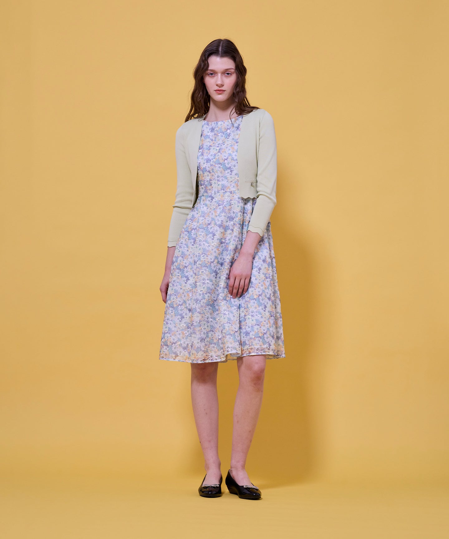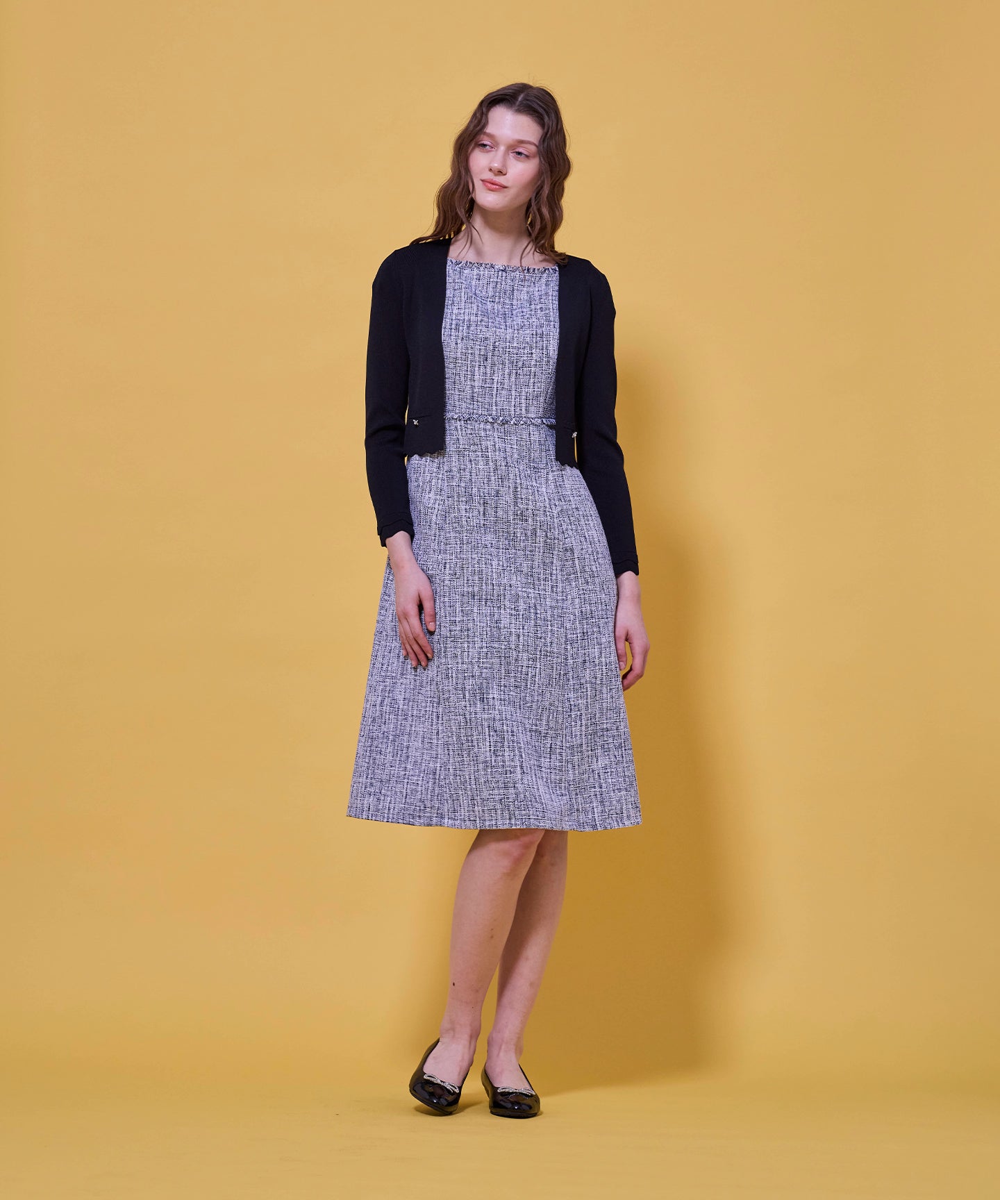 袖口と裾のスカラップデザインが上品さを引き立てるノーカラーボレロ。 コンパクトな丈感ですっきりとした印象に仕上げ、ワンピースやドレスに合わせてフォーマルな場にもふさわしい一枚。前立てのデザインは胸元を美しく見せ、アクセサリーとも相性抜群です。また、裾のカーブラインが自然とウエスト位置を高く見せるため、スタイルアップ効果も期待できます。
