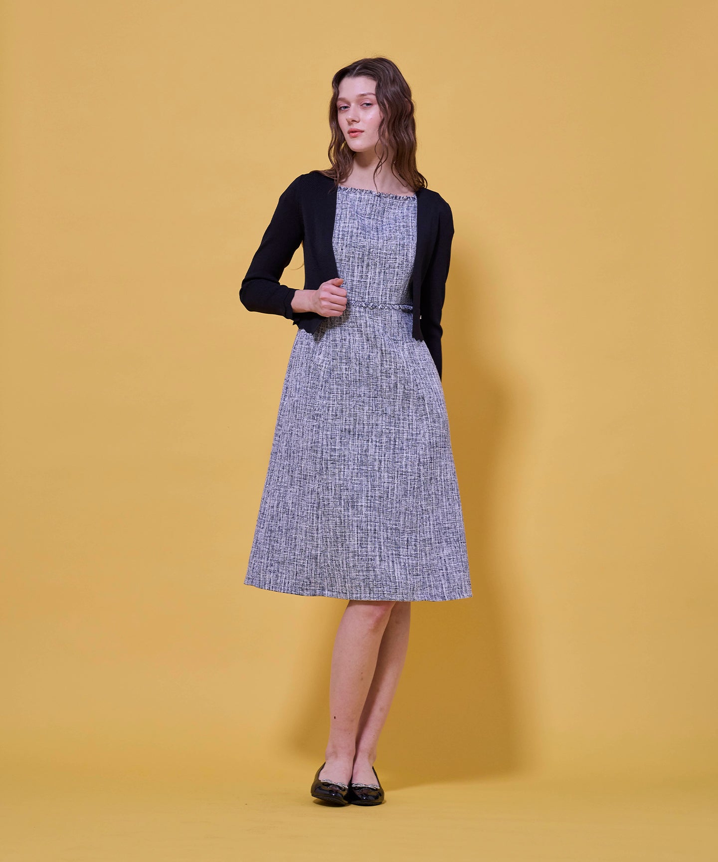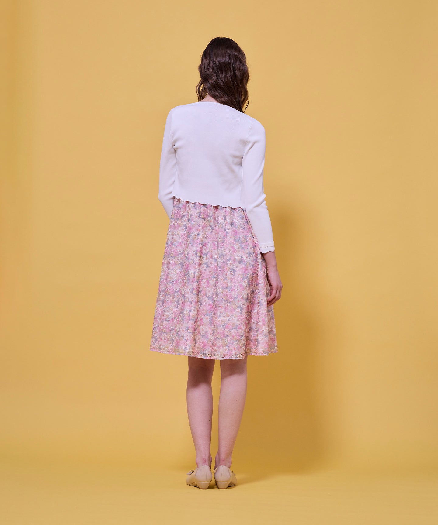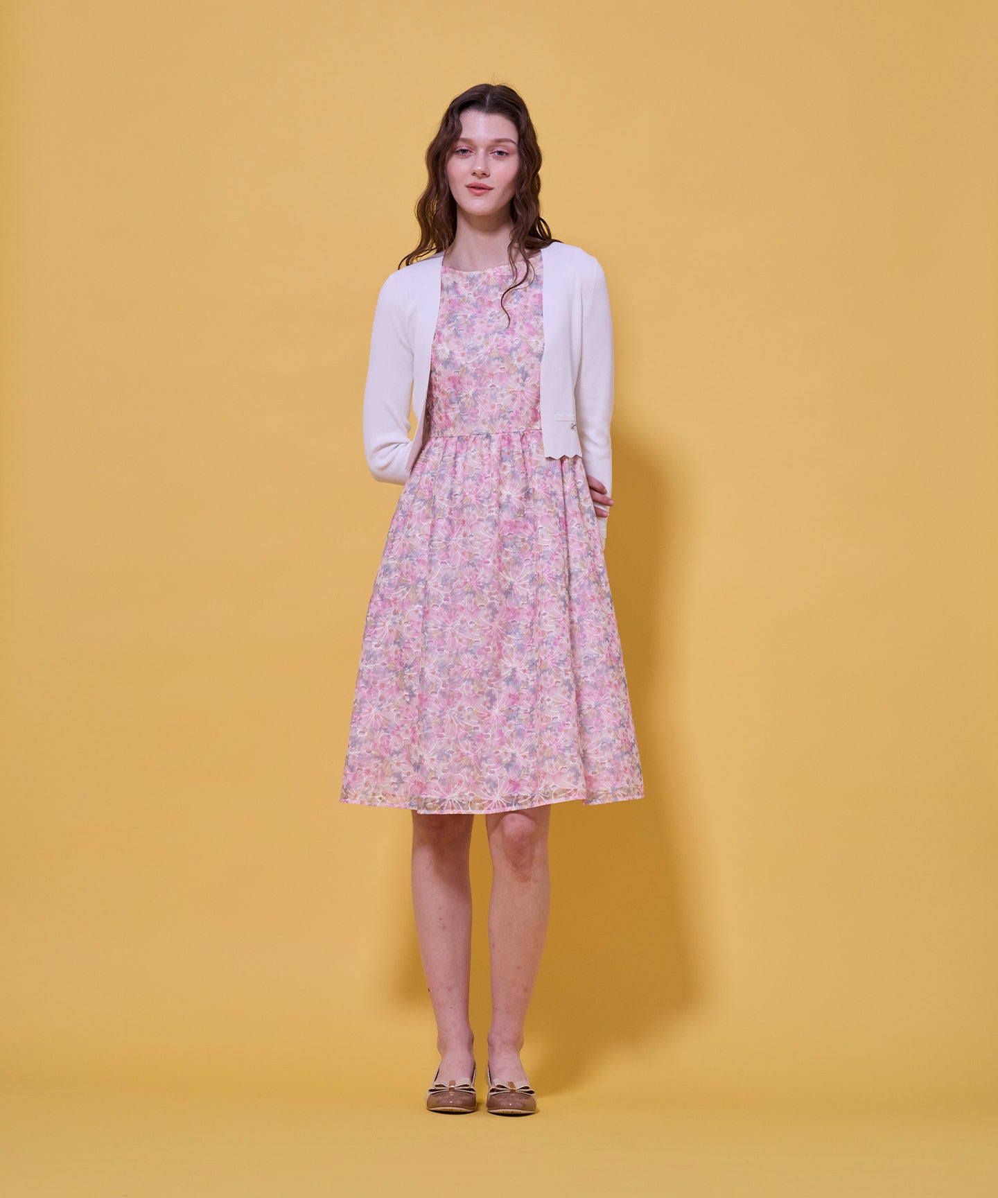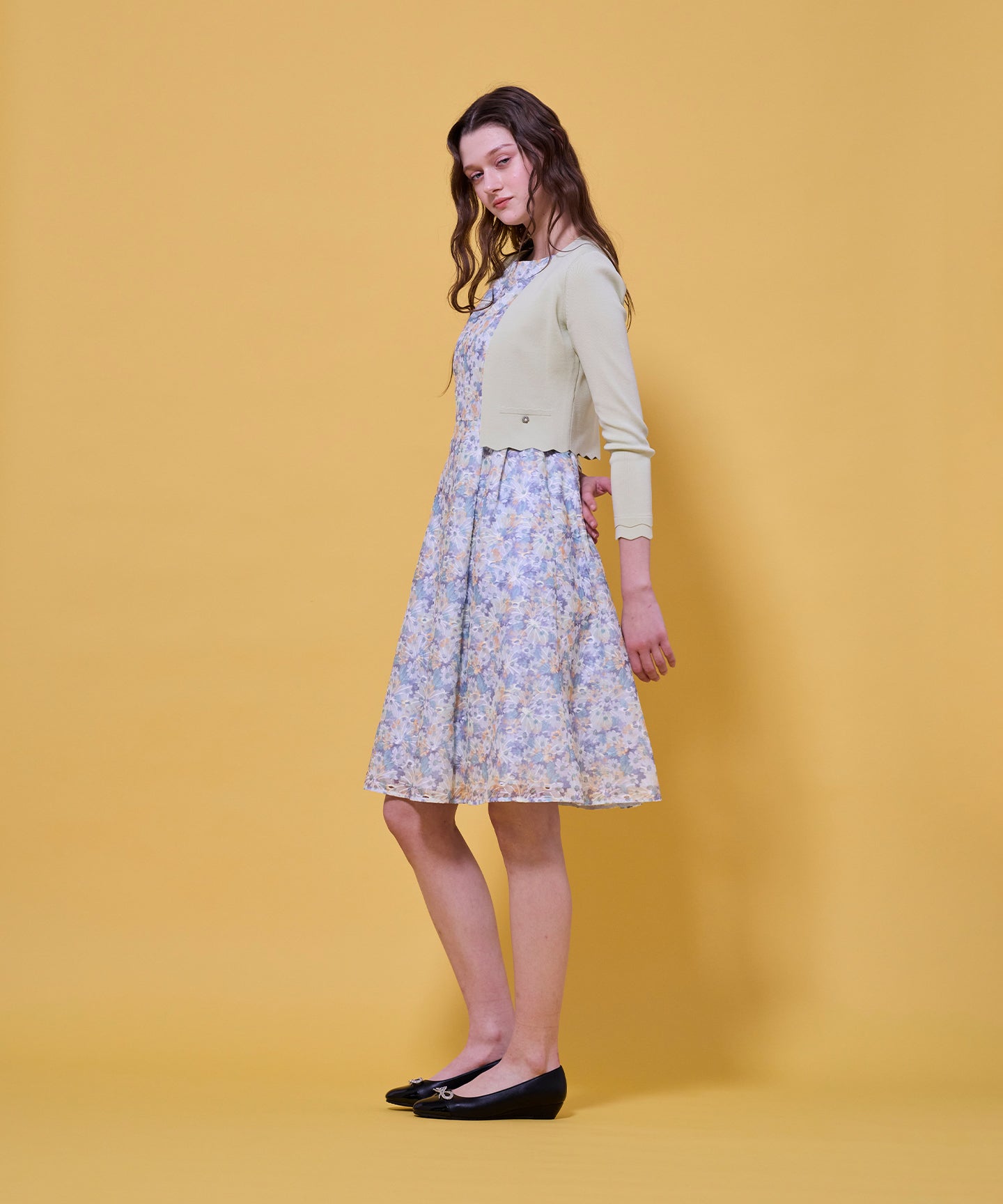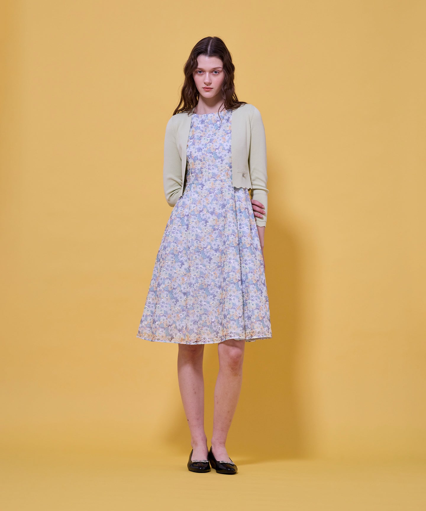 袖口と裾のスカラップデザインが上品さを引き立てるノーカラーボレロ。 コンパクトな丈感ですっきりとした印象に仕上げ、ワンピースやドレスに合わせてフォーマルな場にもふさわしい一枚。前立てのデザインは胸元を美しく見せ、アクセサリーとも相性抜群です。また、裾のカーブラインが自然とウエスト位置を高く見せるため、スタイルアップ効果も期待できます。