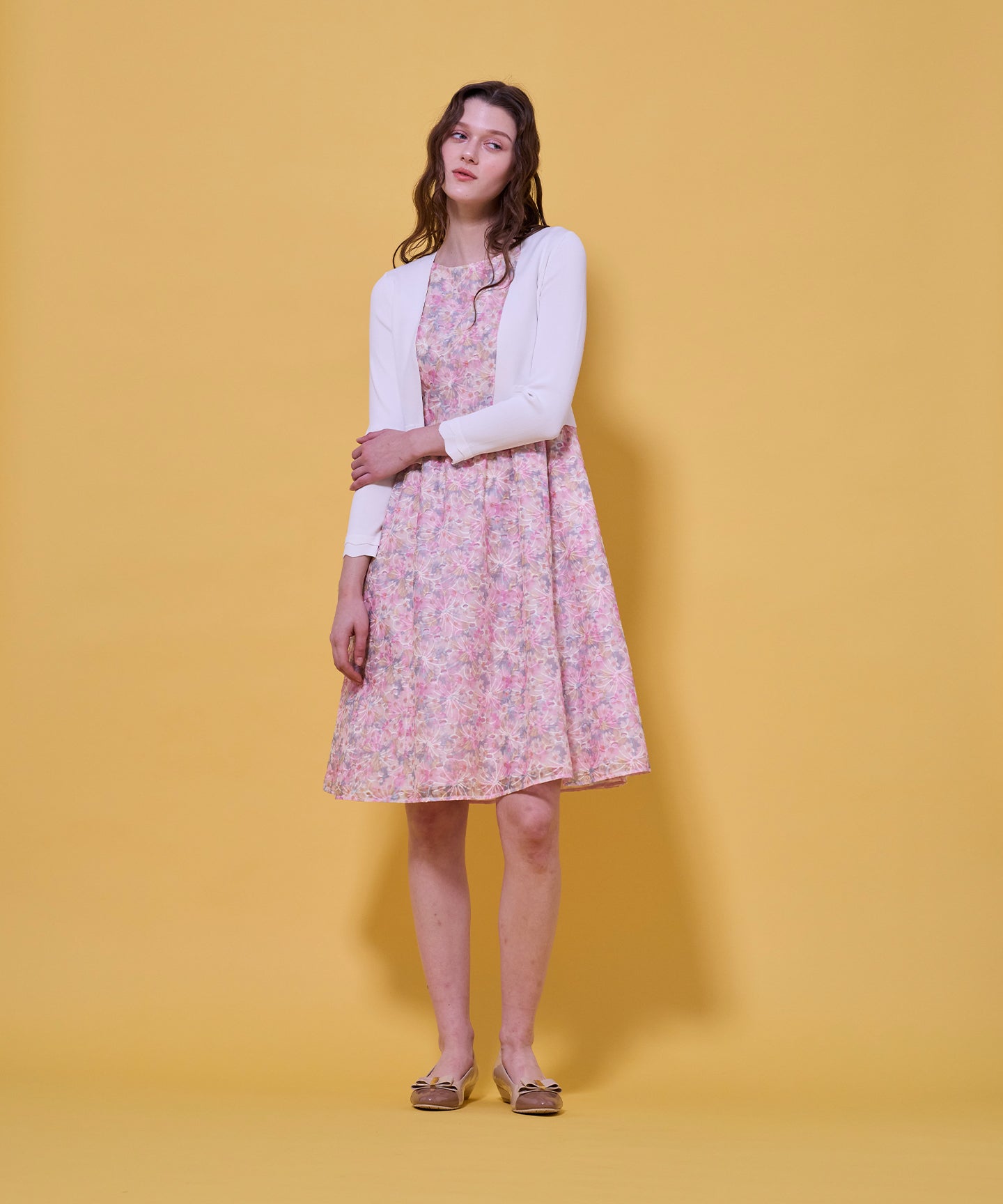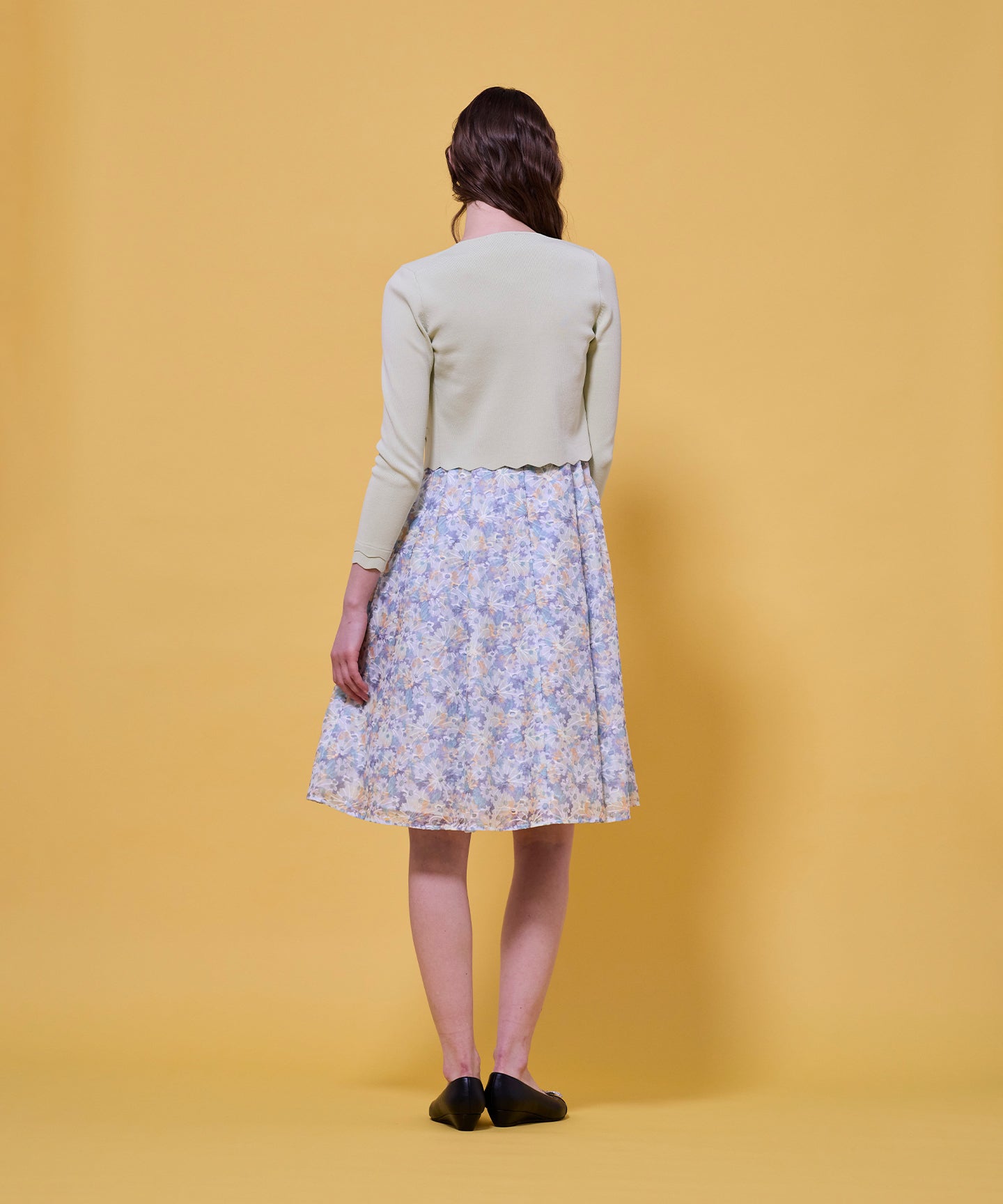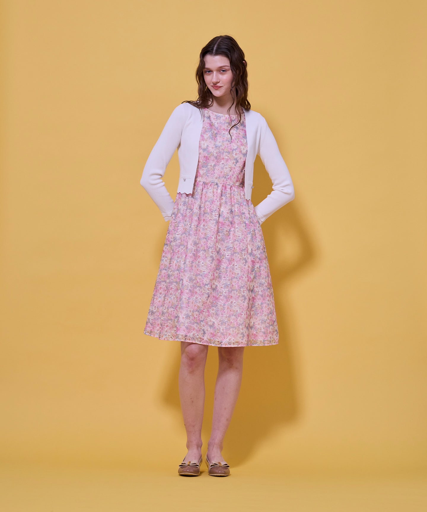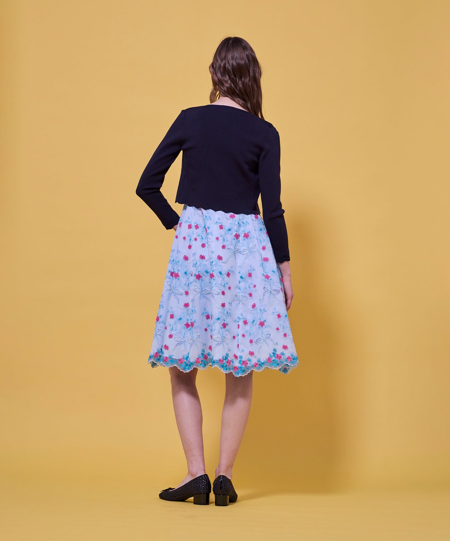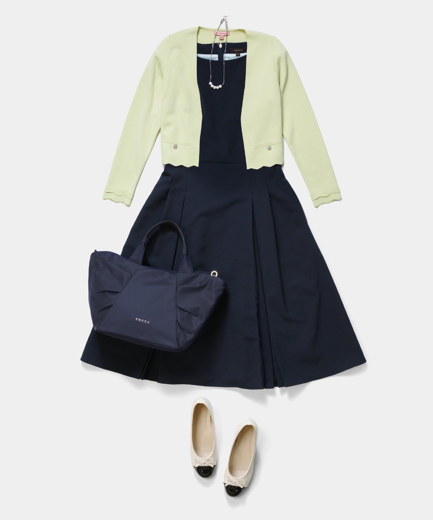 袖口と裾のスカラップデザインが上品さを引き立てるノーカラーボレロ。 コンパクトな丈感ですっきりとした印象に仕上げ、ワンピースやドレスに合わせてフォーマルな場にもふさわしい一枚。前立てのデザインは胸元を美しく見せ、アクセサリーとも相性抜群です。また、裾のカーブラインが自然とウエスト位置を高く見せるため、スタイルアップ効果も期待できます。
