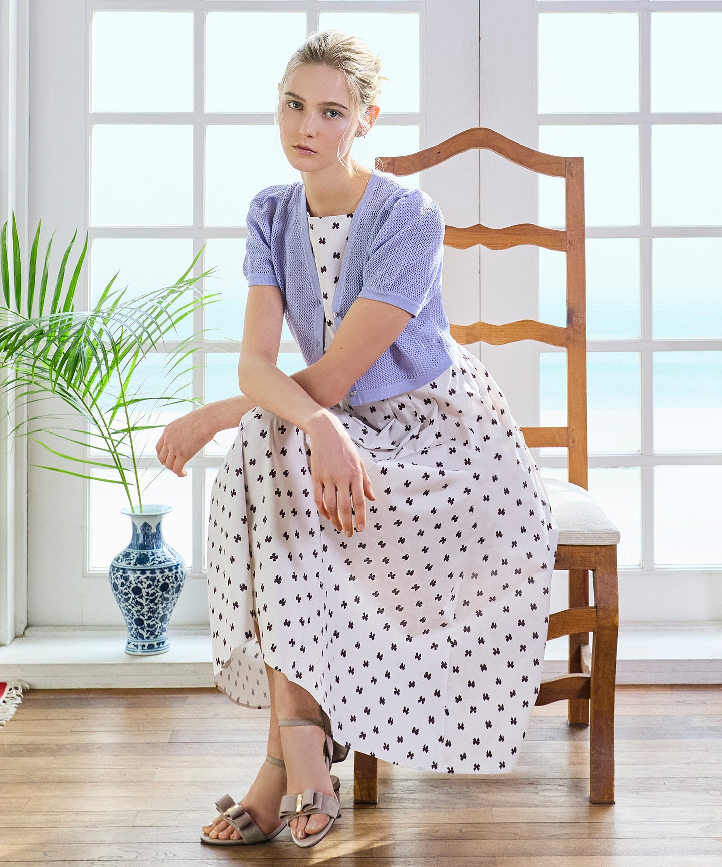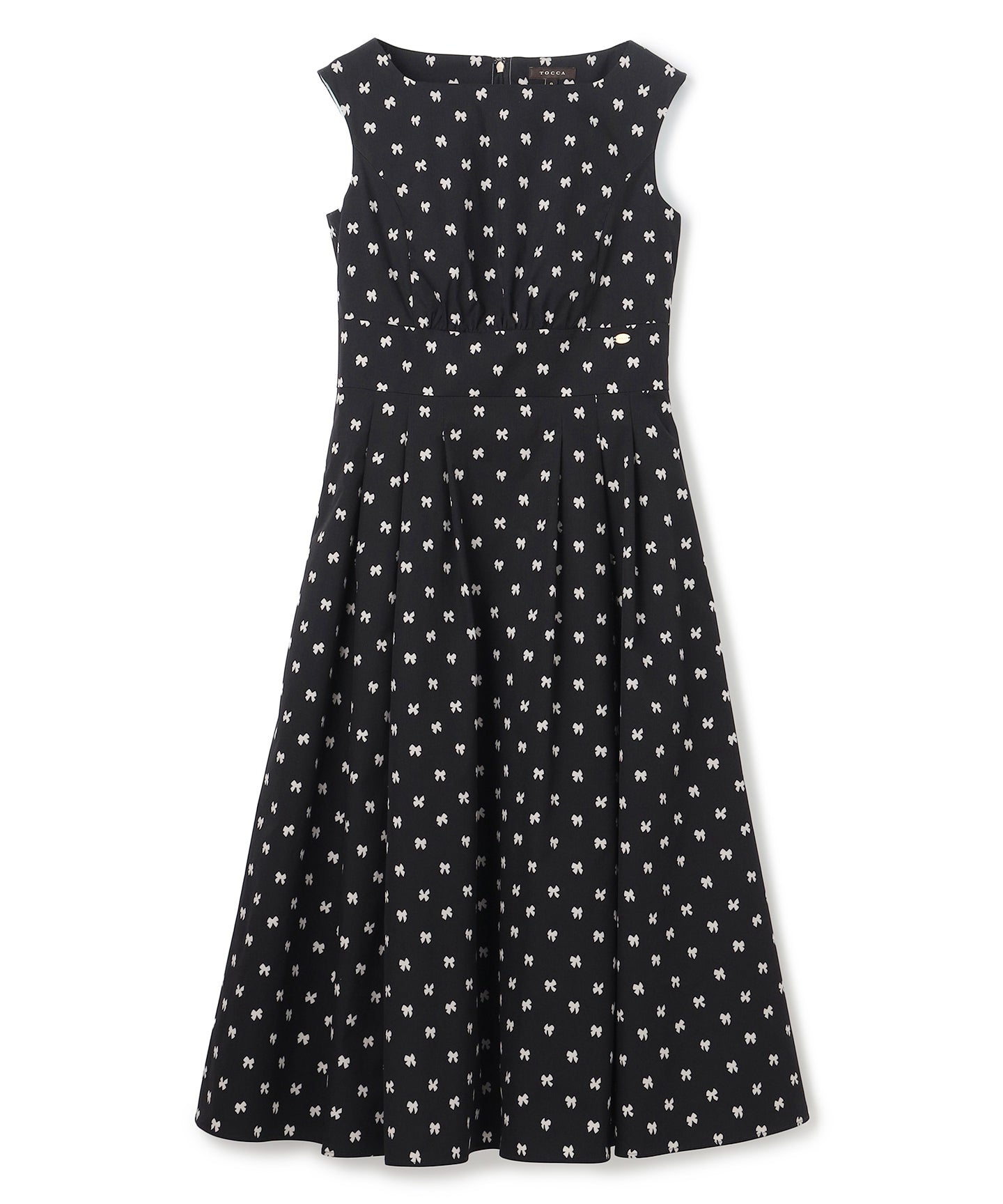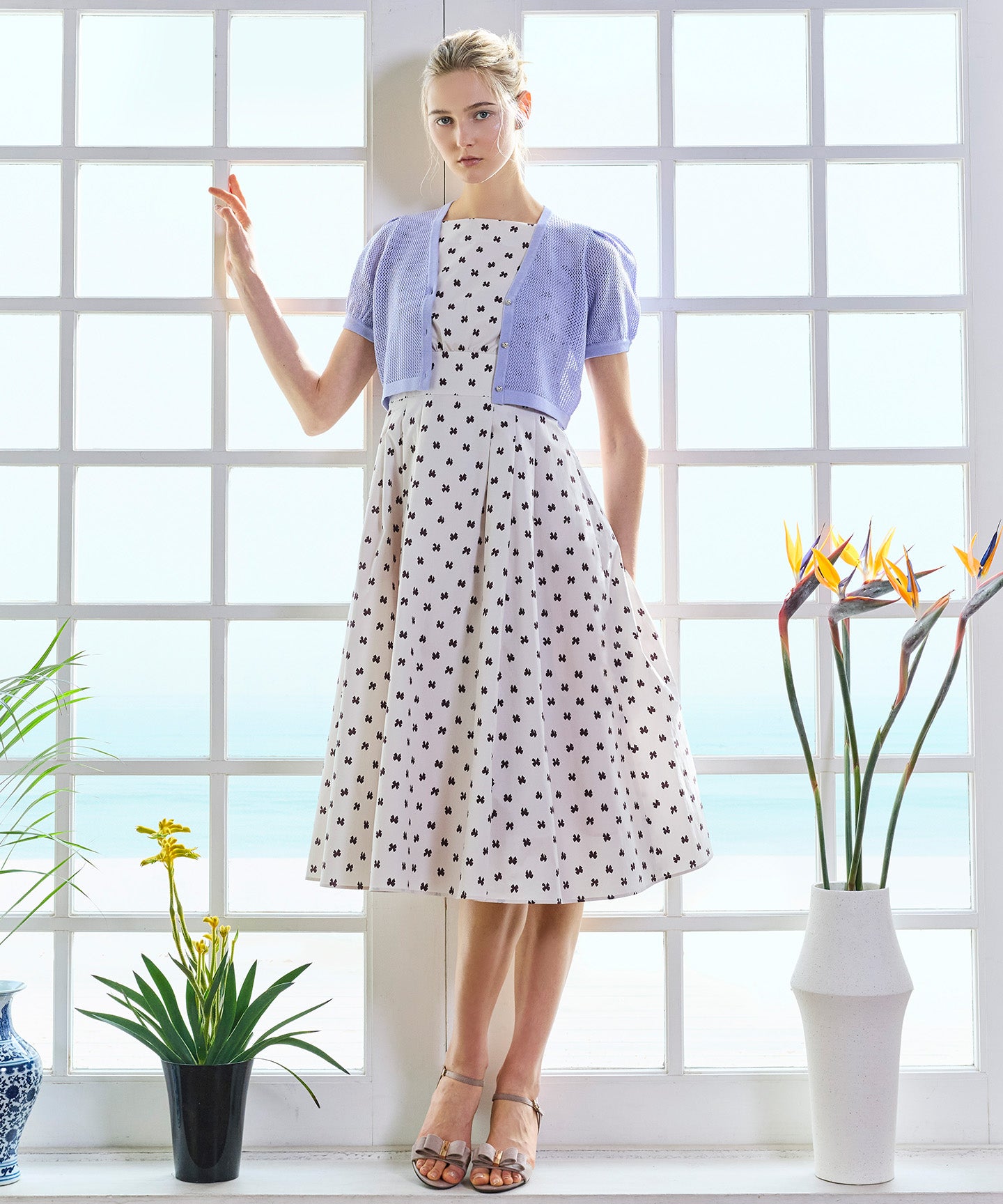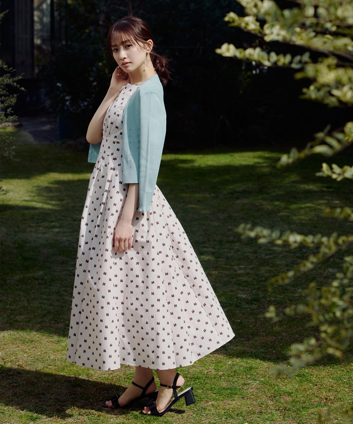 小さなリボン柄を散りばめ、可憐さと品の良さを併せ持つドレス。 甘くなりがちなモチーフも、落ち着いた配色と程よい分量感で大人の女性に似合う表情に仕上げました。 上半身はすっきりと、スカート部分はふんわりと広がるシルエットで、自然なメリハリを演出。動くたびに軽やかに揺れ、女性らしさを引き立てます。 一枚で着映えするのはもちろん、ボレロやカーディガンを合わせればきちんと感のあるスタイリングにも対応。 デイリーからお出かけ、ちょっとしたお食事シーンまで幅広く活躍する一着です。