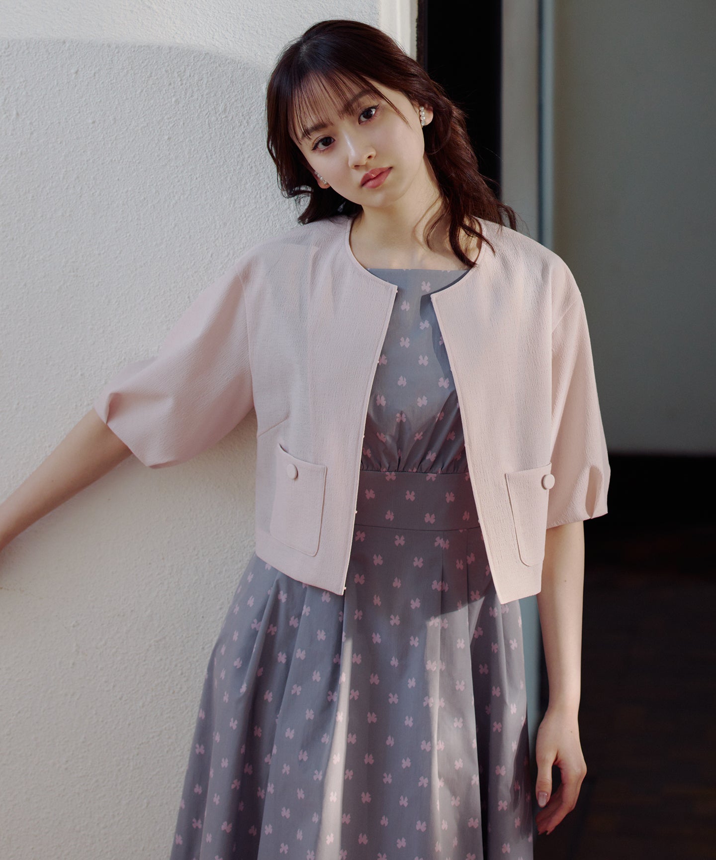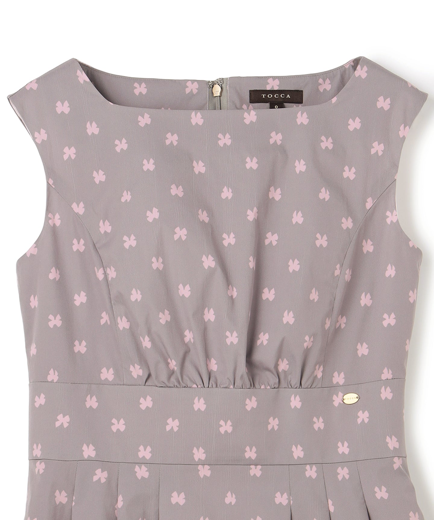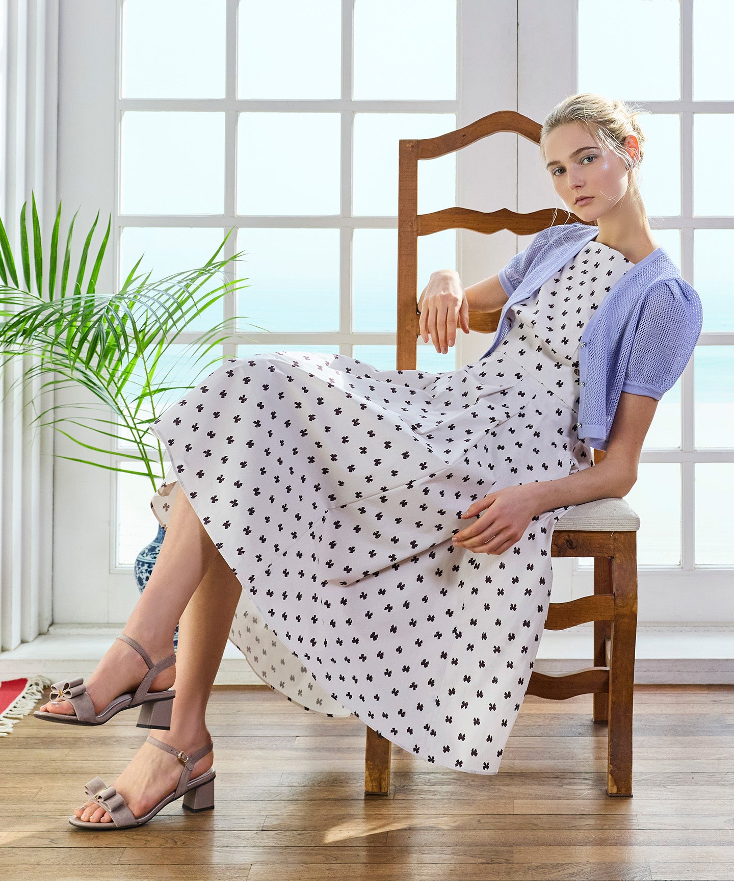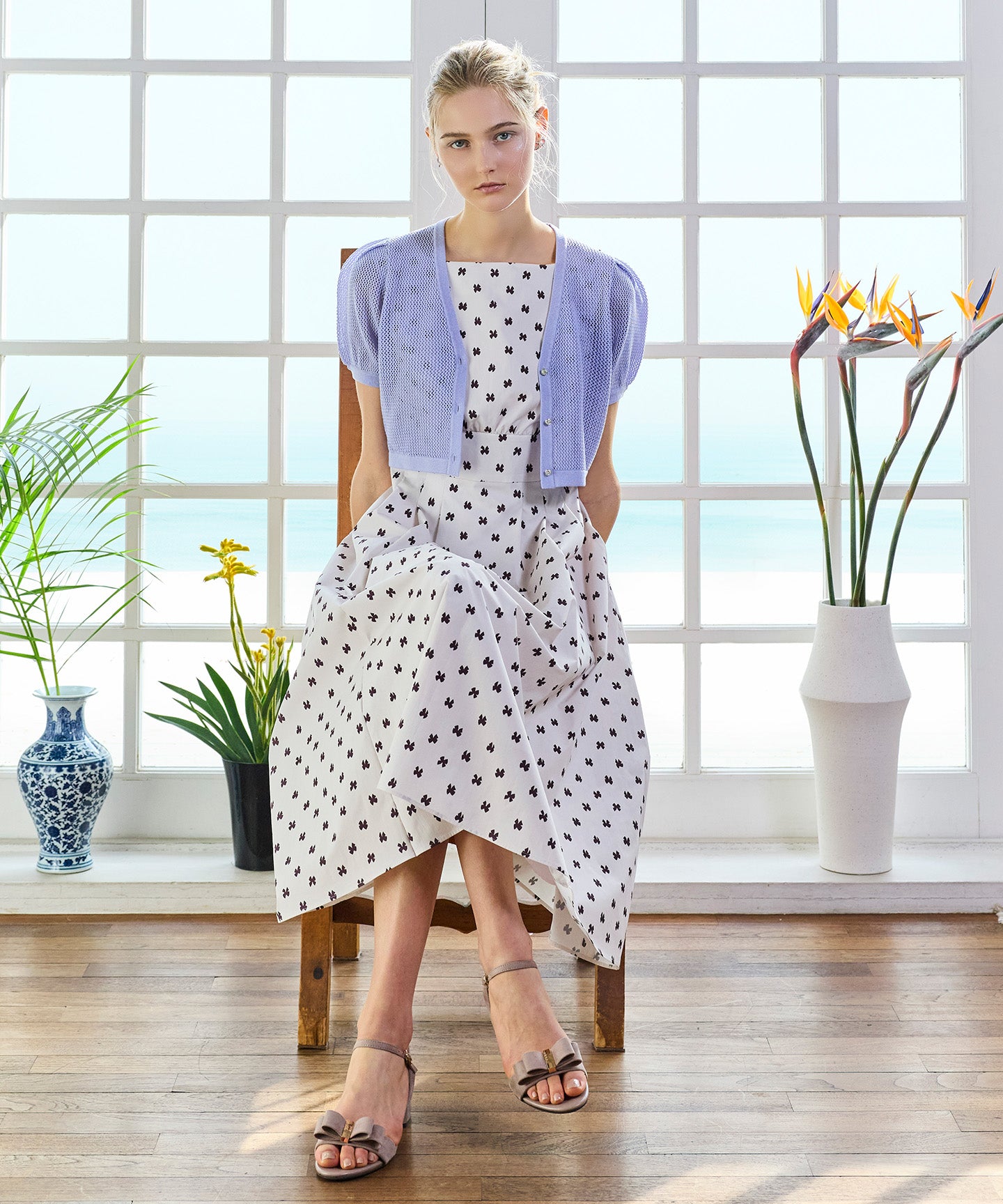 小さなリボン柄を散りばめ、可憐さと品の良さを併せ持つドレス。 甘くなりがちなモチーフも、落ち着いた配色と程よい分量感で大人の女性に似合う表情に仕上げました。 上半身はすっきりと、スカート部分はふんわりと広がるシルエットで、自然なメリハリを演出。動くたびに軽やかに揺れ、女性らしさを引き立てます。 一枚で着映えするのはもちろん、ボレロやカーディガンを合わせればきちんと感のあるスタイリングにも対応。 デイリーからお出かけ、ちょっとしたお食事シーンまで幅広く活躍する一着です。