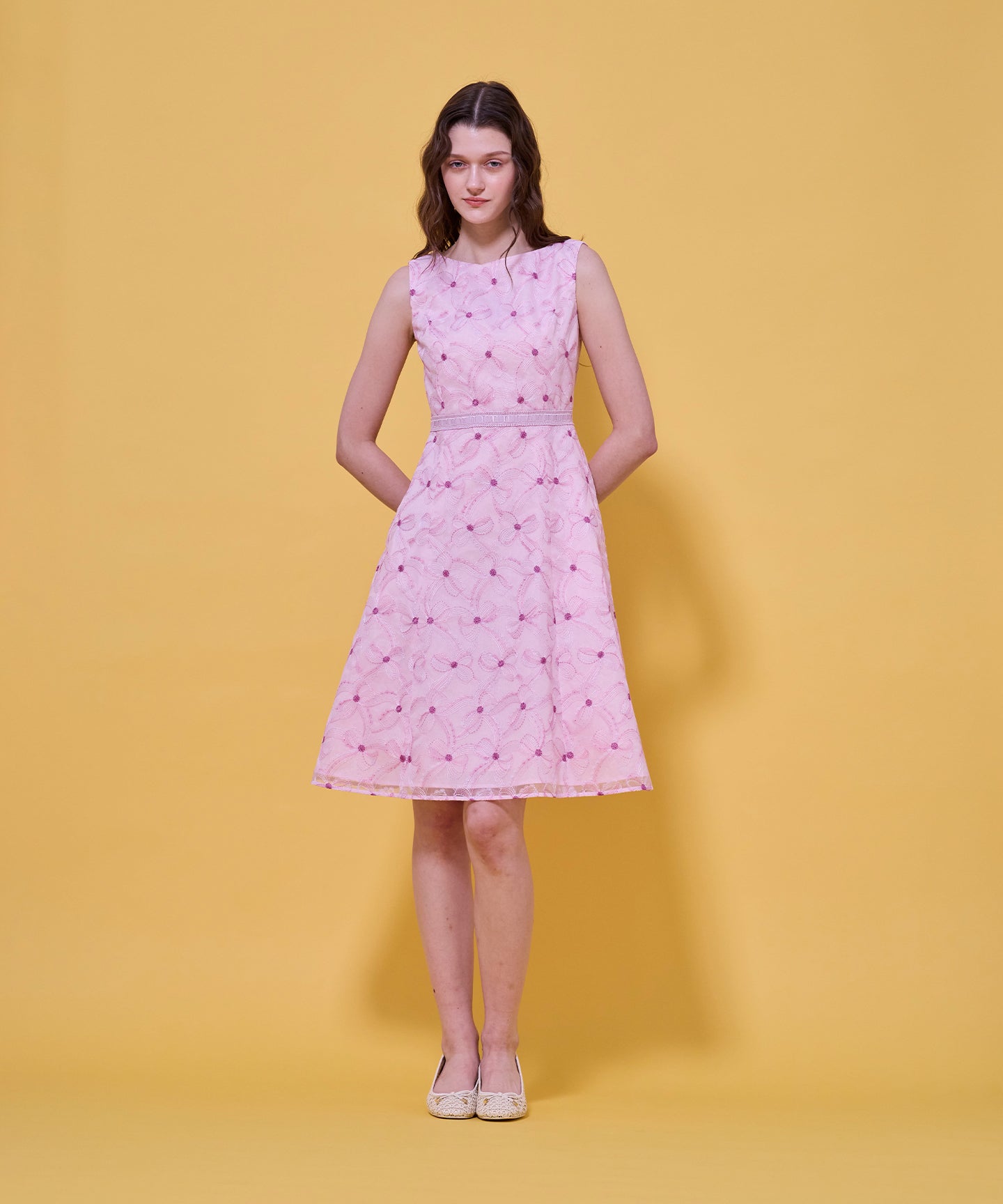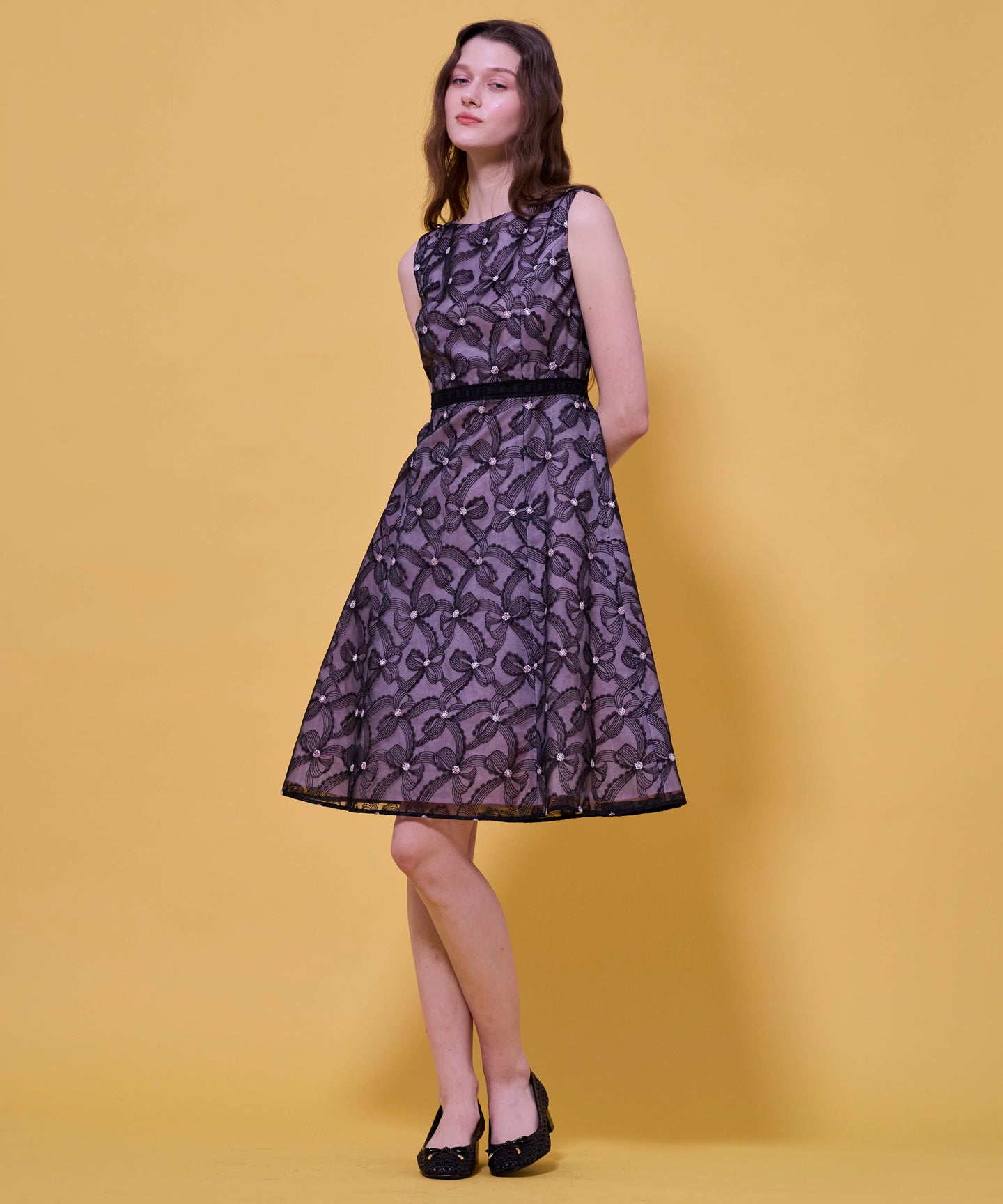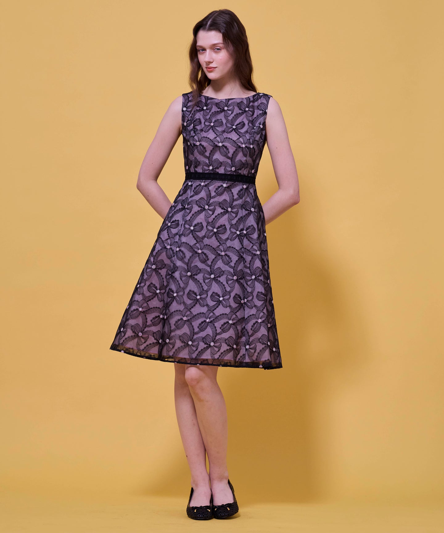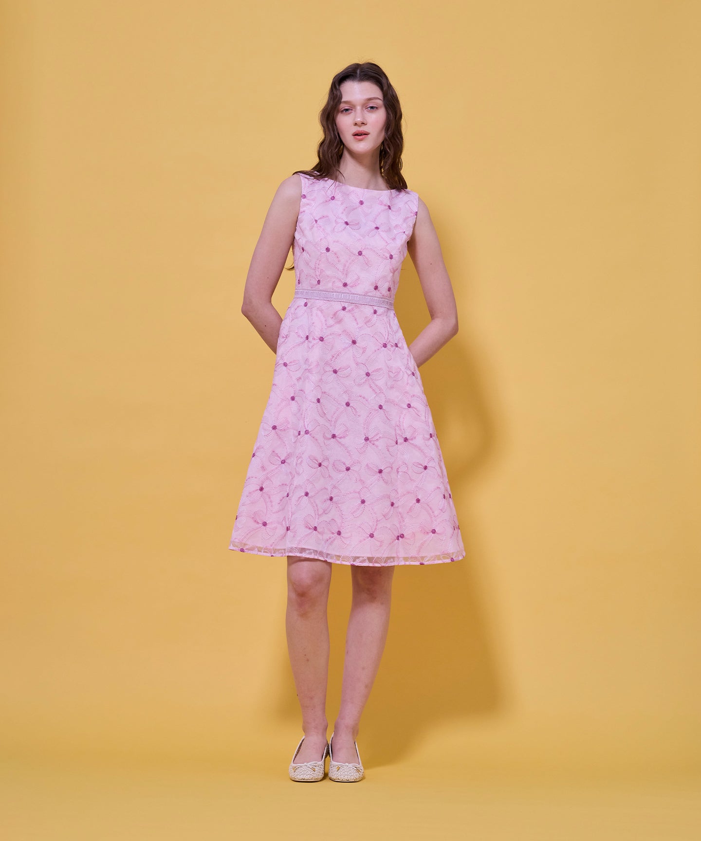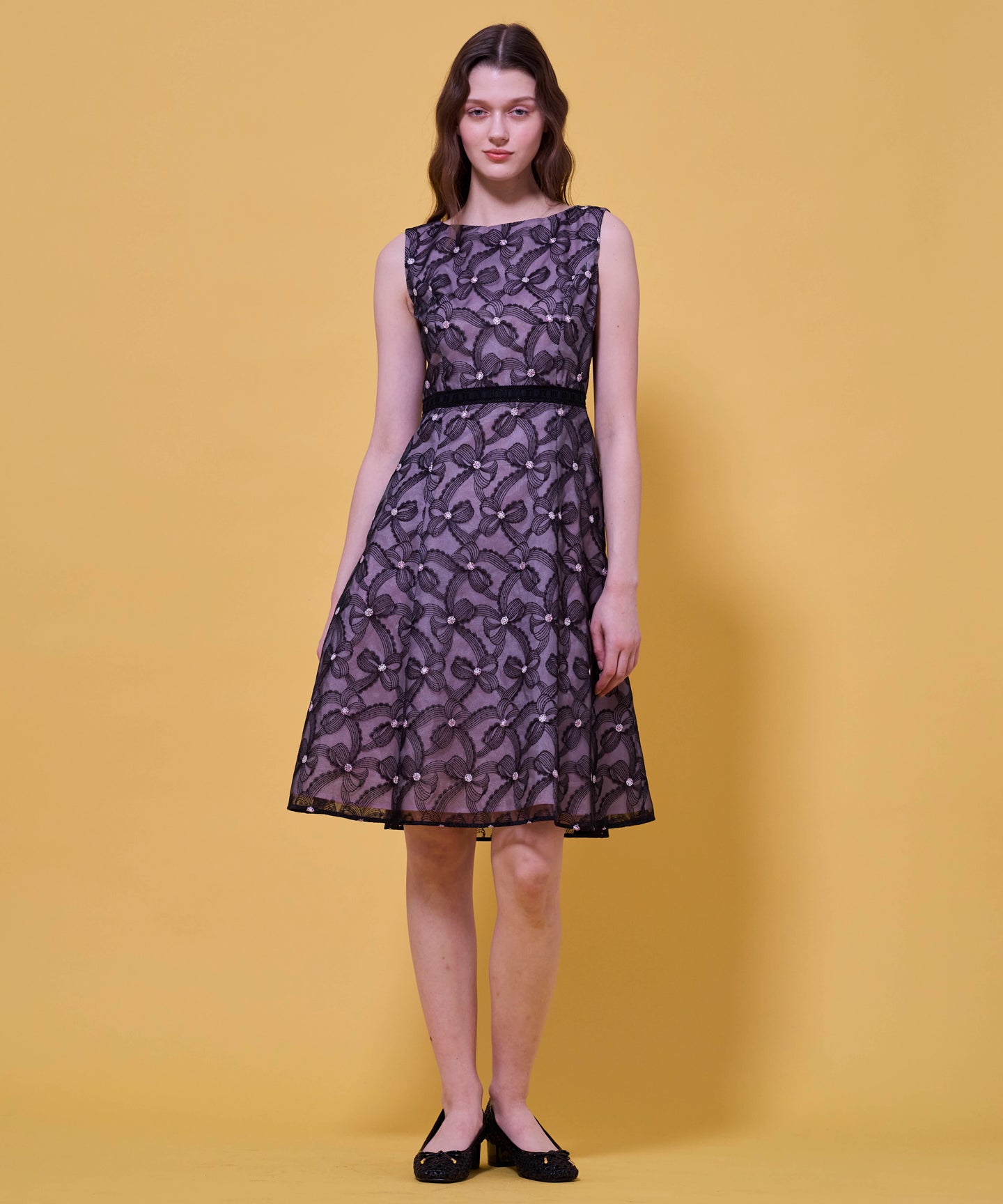 華やかなリボン柄の刺繍が目を惹くフェミニンなドレス。 リボンが手をつないでいるかのような立体感のある繊細な刺繍が華やかさと上品さを兼ね備えた印象を与えてくれます。 ウエストにはベルトを配し、シルエットにメリハリをプラス。スタイルアップ効果も叶え,特別なお出かけや華やかなシーンに彩りを与える素敵な一着です。