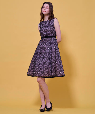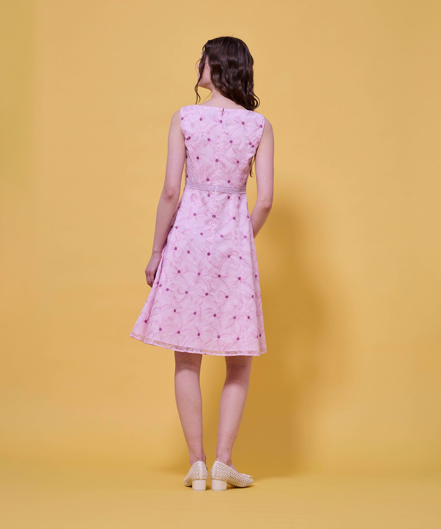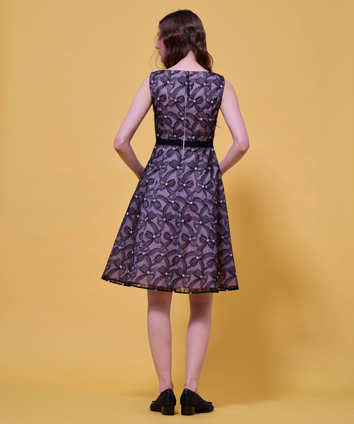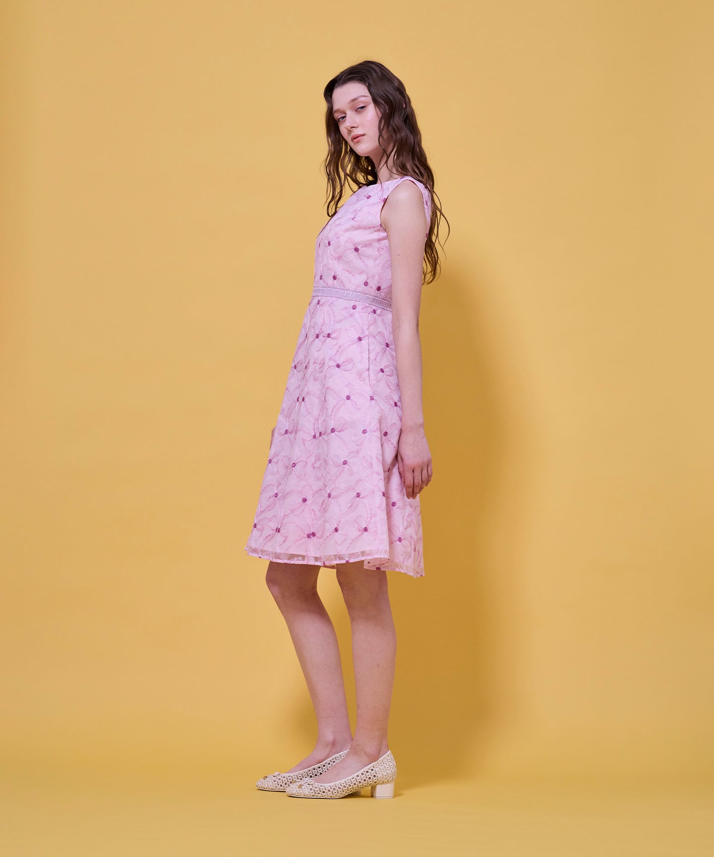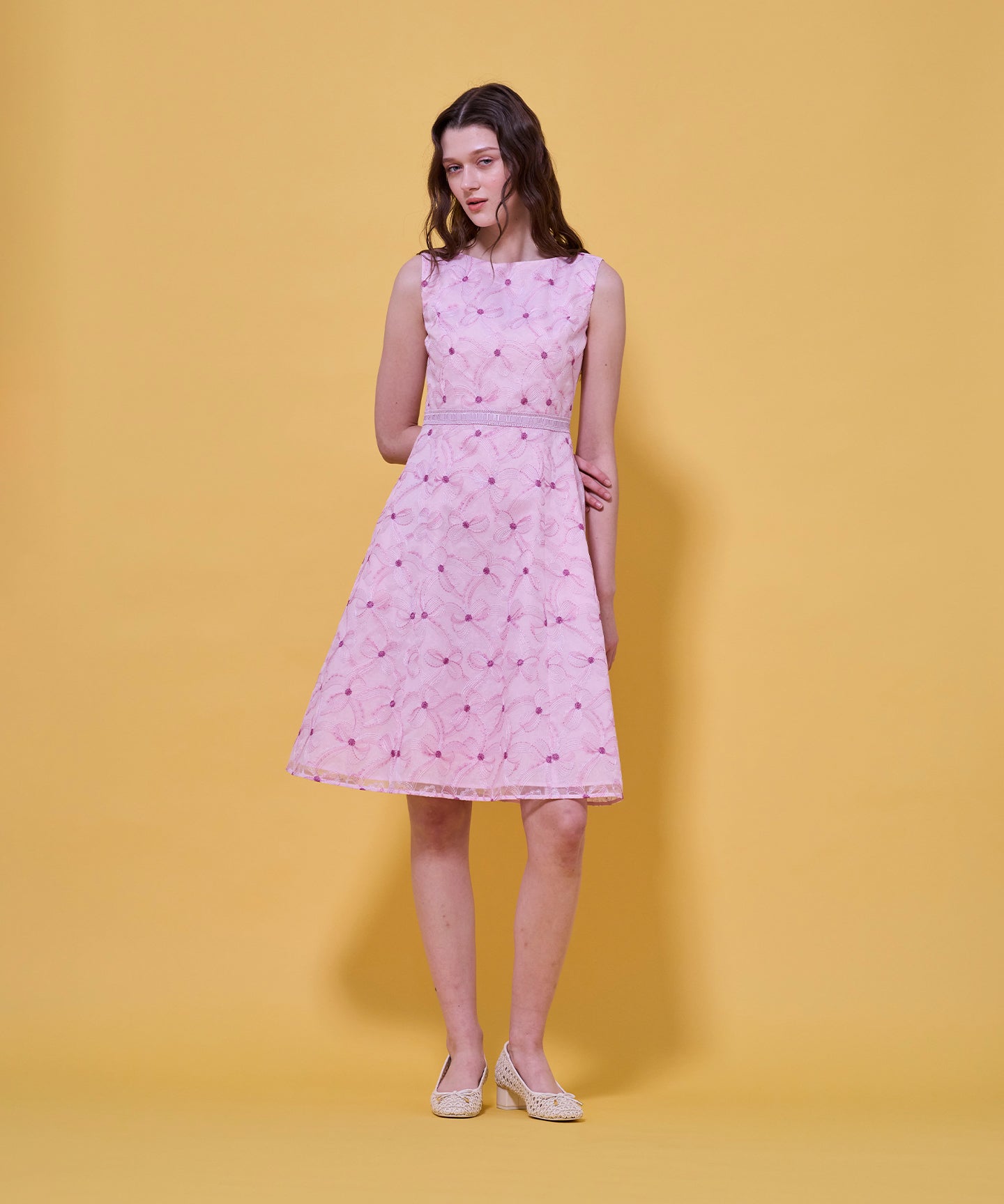 華やかなリボン柄の刺繍が目を惹くフェミニンなドレス。 リボンが手をつないでいるかのような立体感のある繊細な刺繍が華やかさと上品さを兼ね備えた印象を与えてくれます。 ウエストにはベルトを配し、シルエットにメリハリをプラス。スタイルアップ効果も叶え,特別なお出かけや華やかなシーンに彩りを与える素敵な一着です。