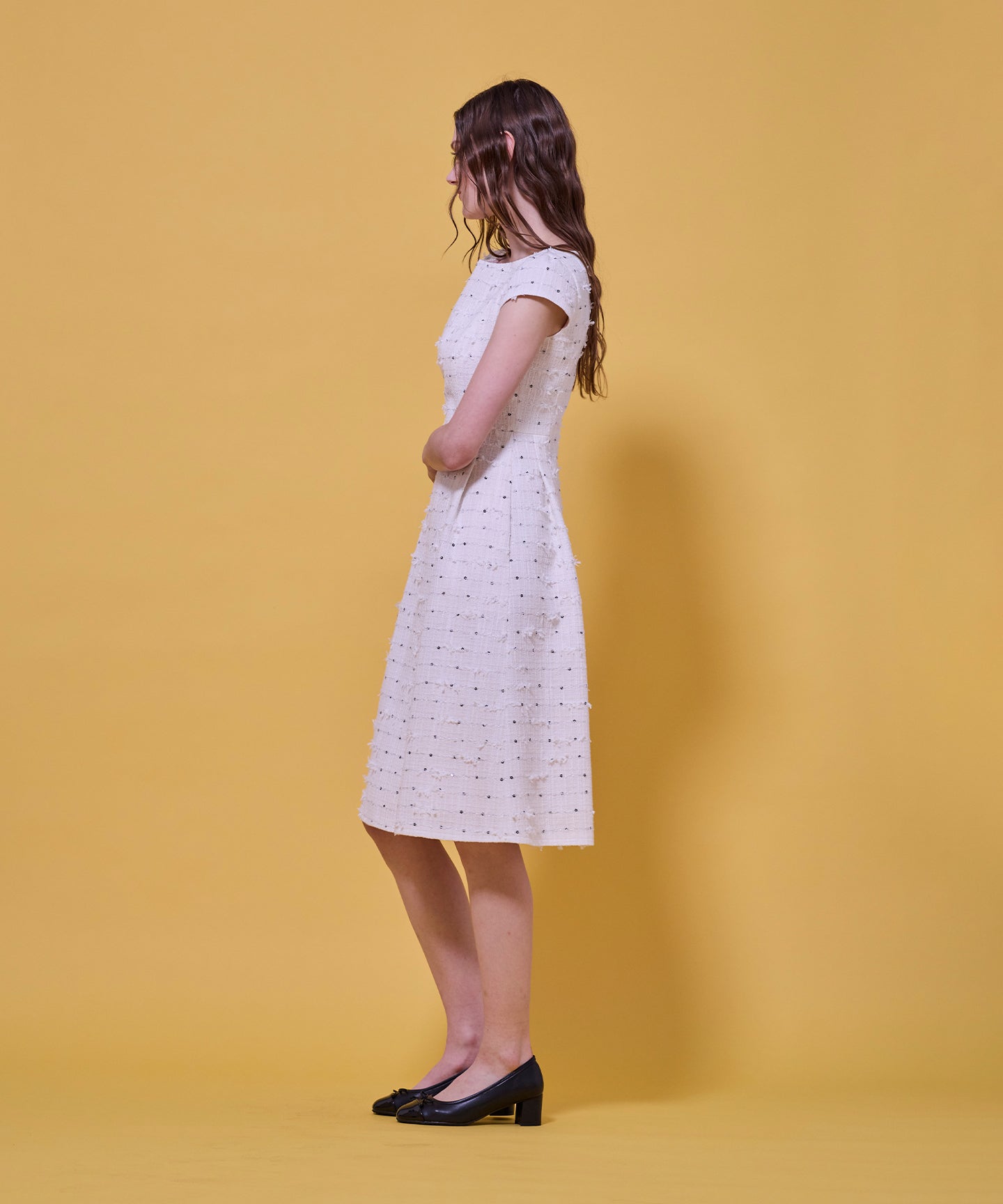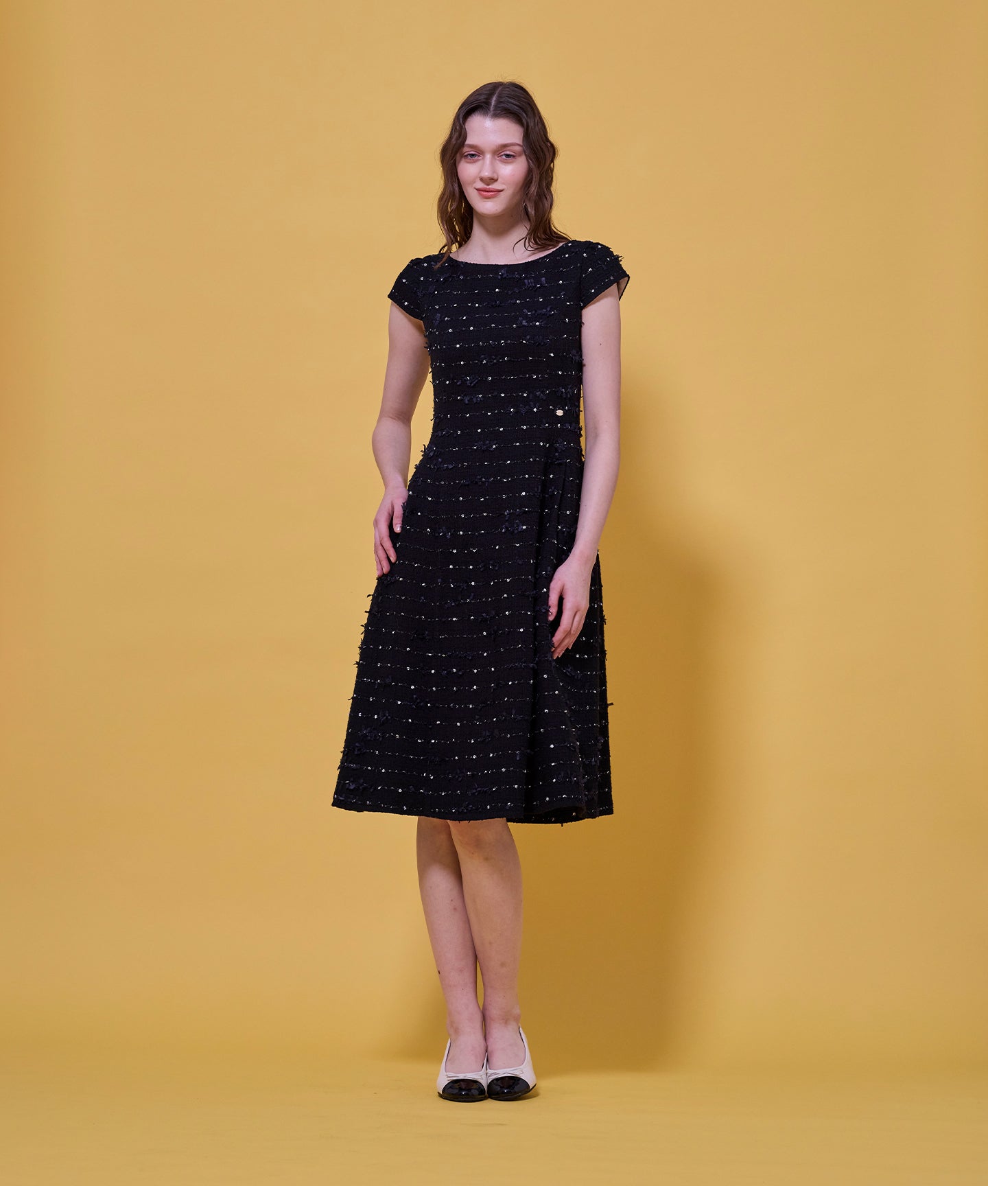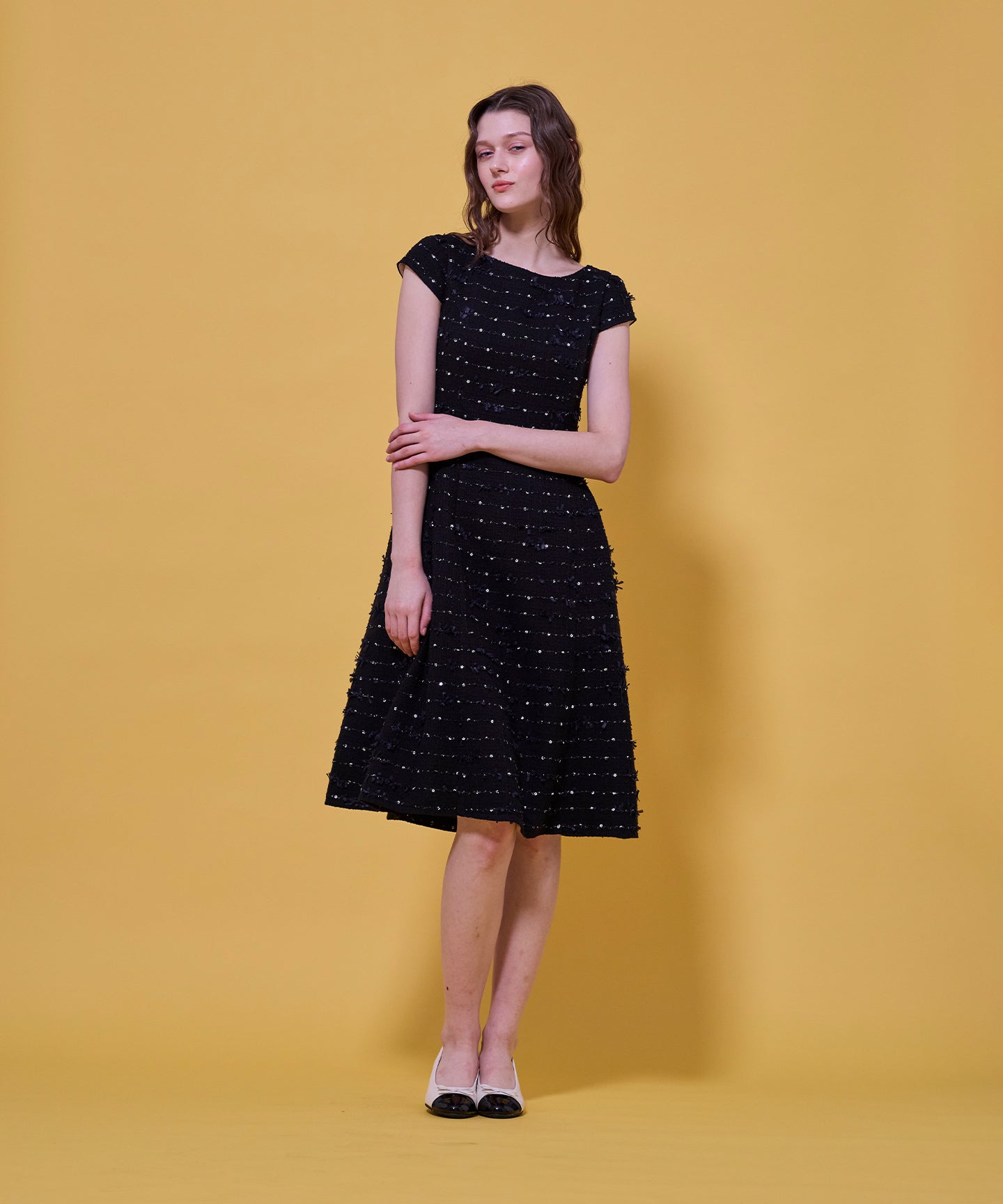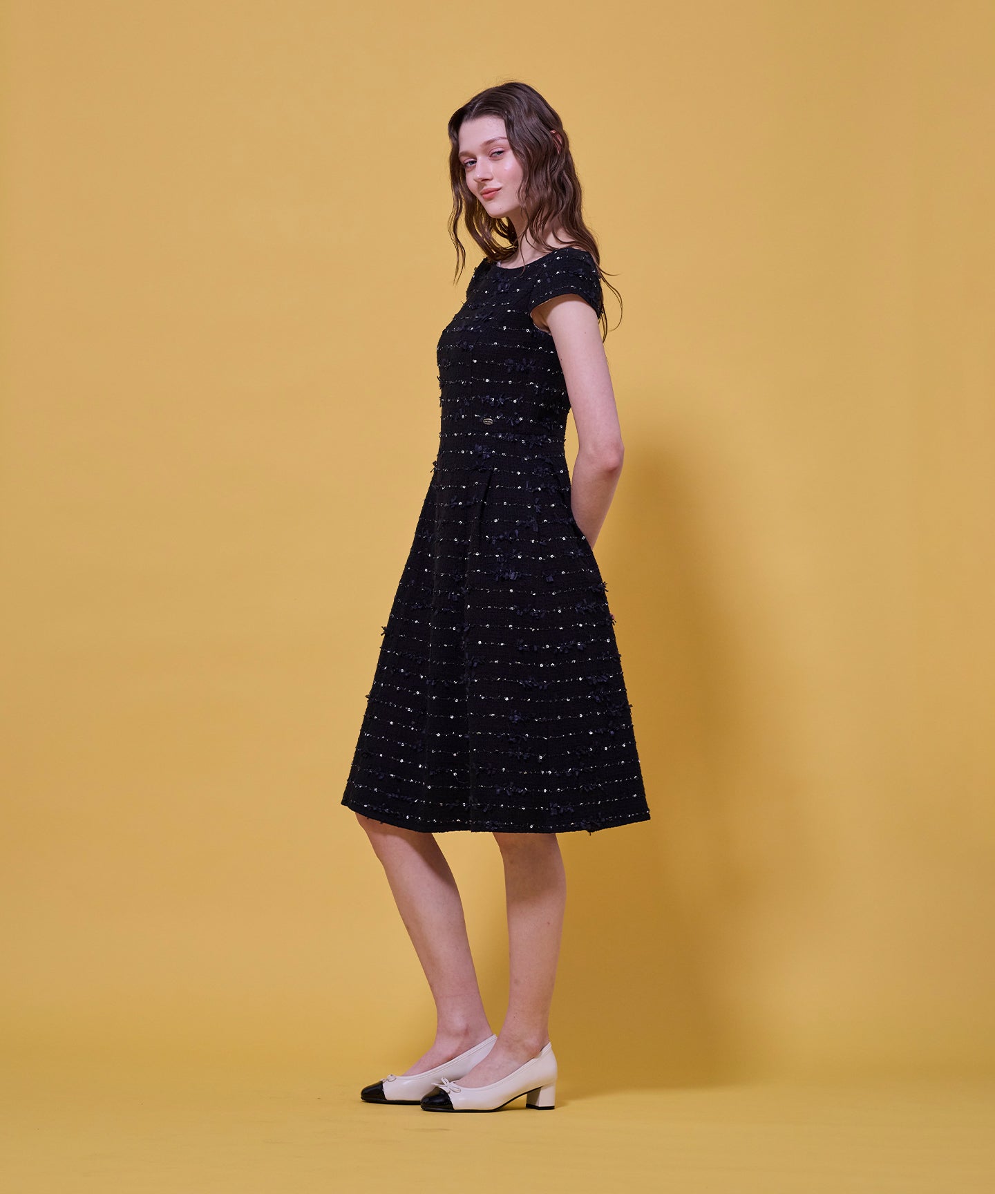 小さな花の形のスパンコールを贅沢に散りばめた、華やかで特別感のあるドレス。 生地全体にきらめくモチーフは、動くたびに光を受けて繊細な表情を生み出し、奥行きと上品な華やぎを添えています。 シルエットは、ウエストをすっきりと引き締めながらも、スカート部分に程よいフレアを持たせたフィット&フレアライン。女性らしい曲線を美しく引き立てつつ、スタイルアップを叶えてくれるデザインです。華やかなシーンにはもちろん、シンプルなアクセサリーと合わせてデイリーにも取り入れやすい、上質で洗練された大人のための一着です。