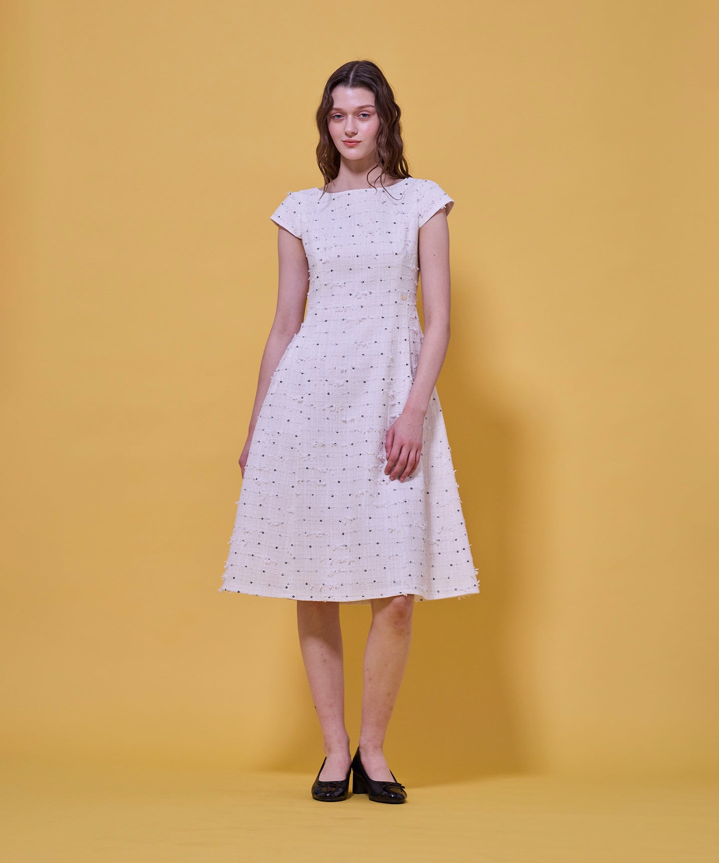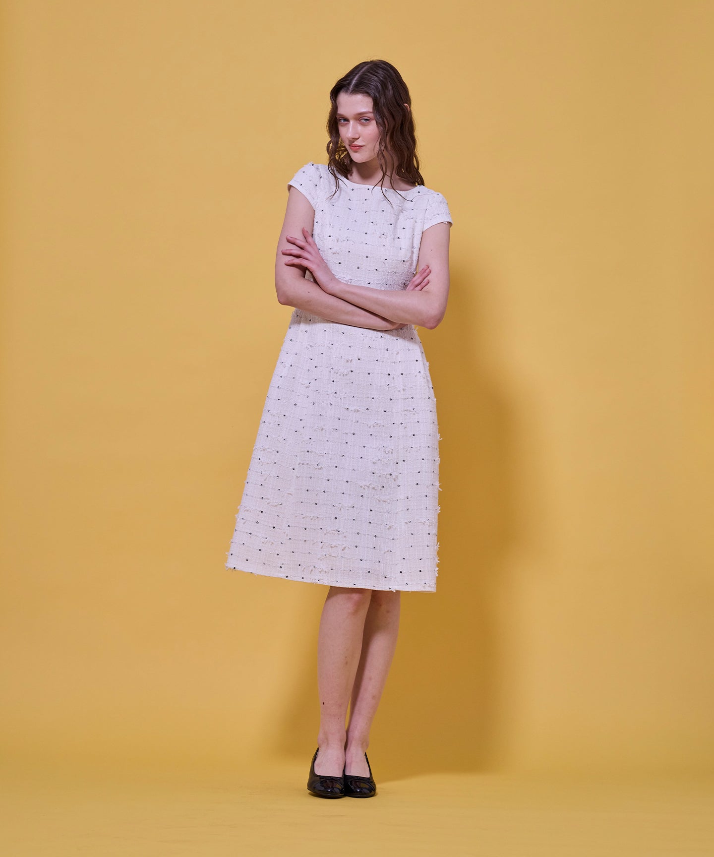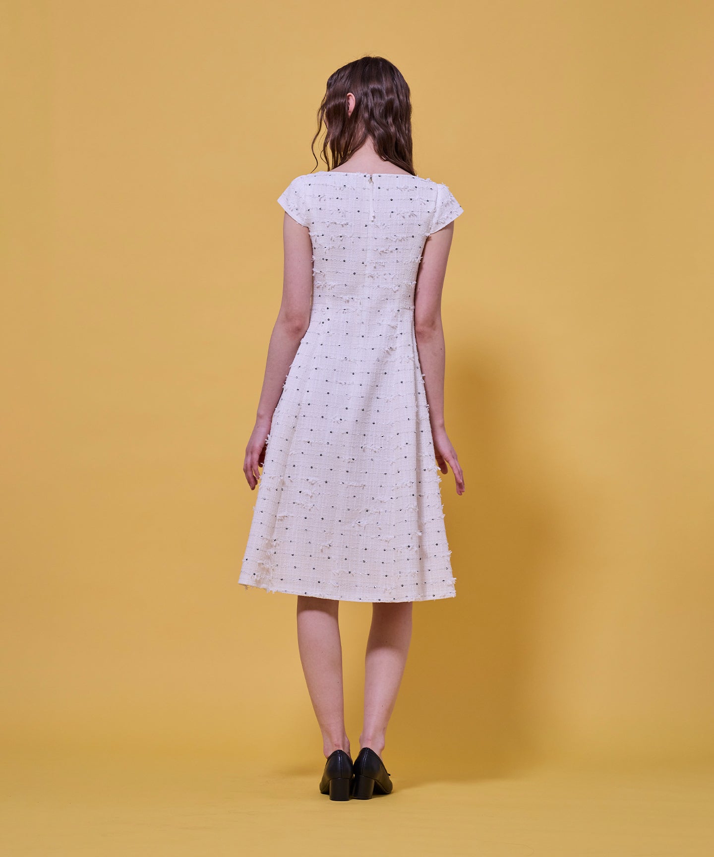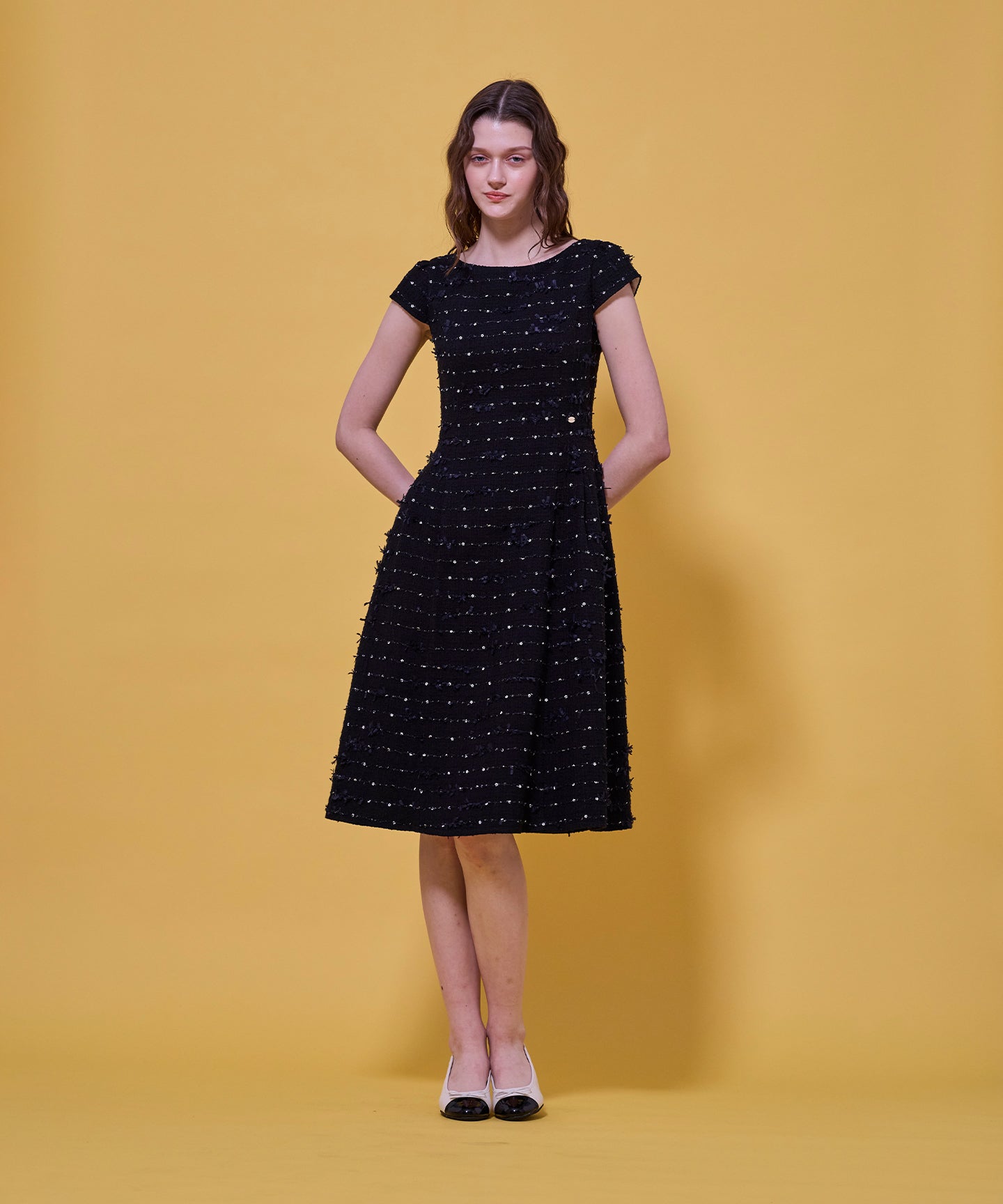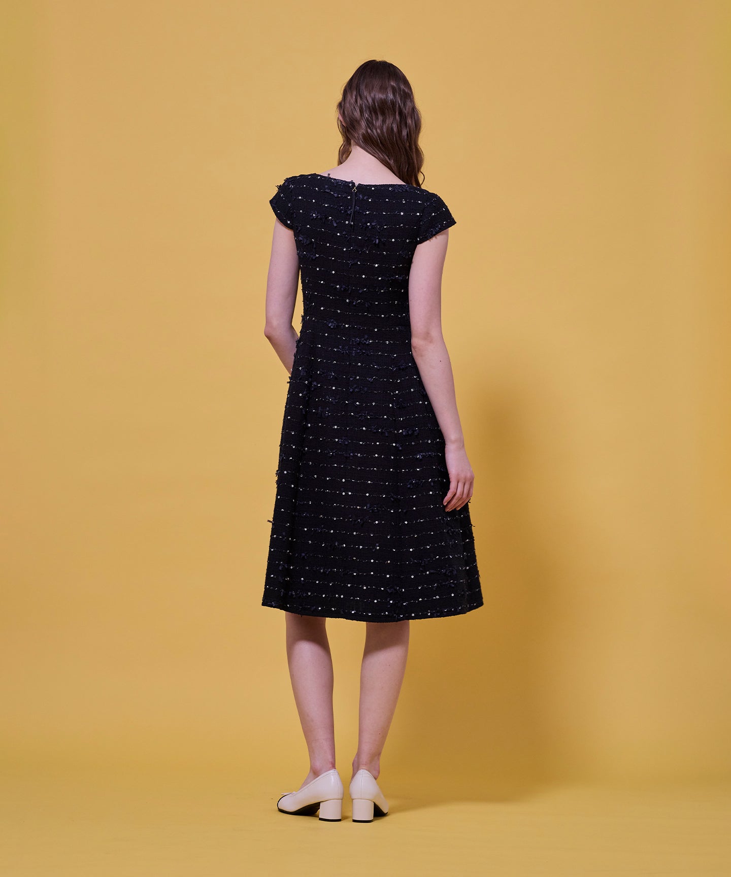 小さな花の形のスパンコールを贅沢に散りばめた、華やかで特別感のあるドレス。 生地全体にきらめくモチーフは、動くたびに光を受けて繊細な表情を生み出し、奥行きと上品な華やぎを添えています。 シルエットは、ウエストをすっきりと引き締めながらも、スカート部分に程よいフレアを持たせたフィット&フレアライン。女性らしい曲線を美しく引き立てつつ、スタイルアップを叶えてくれるデザインです。華やかなシーンにはもちろん、シンプルなアクセサリーと合わせてデイリーにも取り入れやすい、上質で洗練された大人のための一着です。
