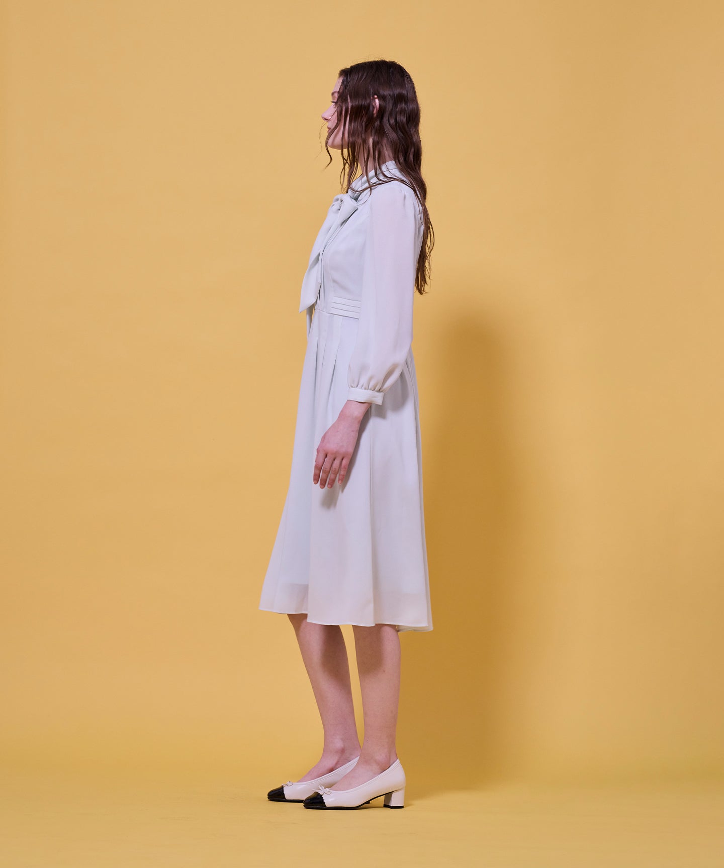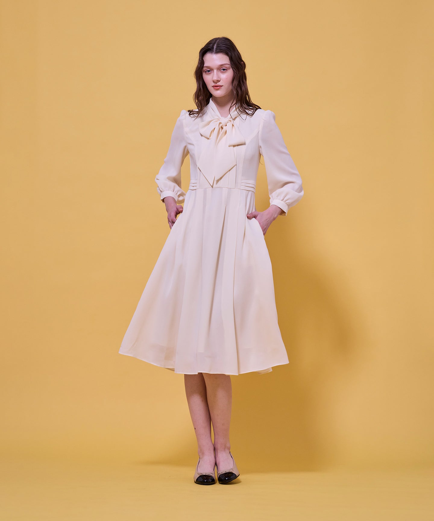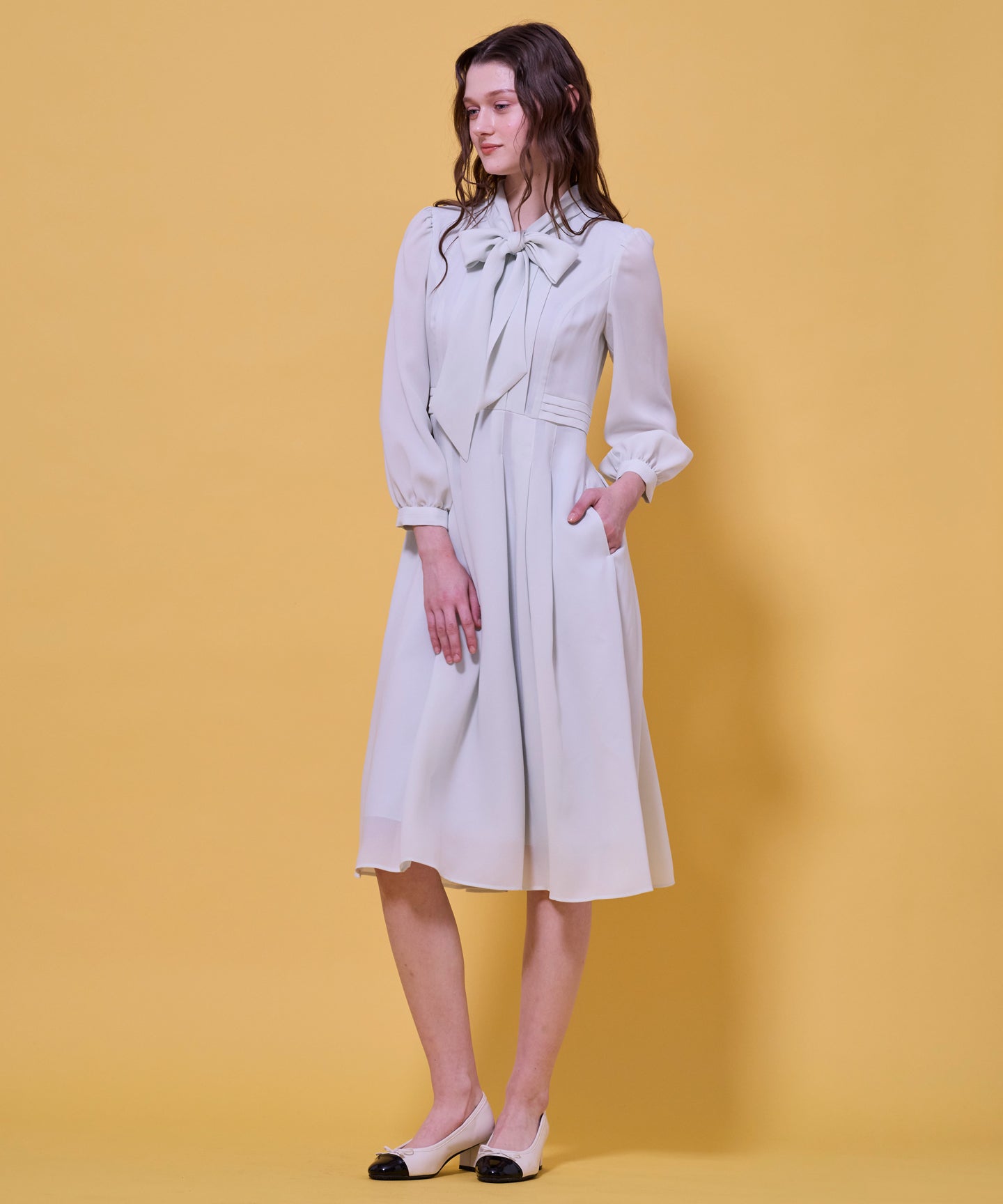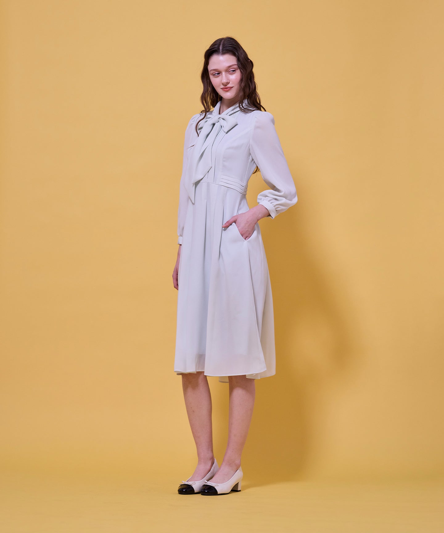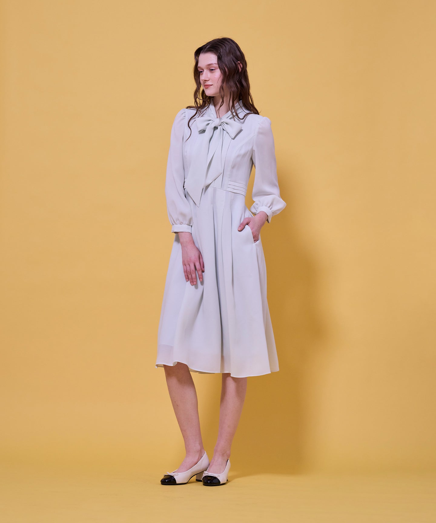 パウダリーな質感が女性らしい軽やかなシャツドレス。定番カラーのネイビーに加えて、今年は新色のミントとクリームイエローが登場。 ボウタイで華やかな印象を演出してくれます。フィット&フレア、タックやギャザーのディティールがTOCCAらしく可憐な印象です。 透け感の少ない素材なので、セレモニーや、オケージョンシーンにも上品に着こなせます。1枚での着用はもちろん、ジャケットやカーディガンとのコーディネートもお楽しみください。同素材でお作りしたブラウスもございます。