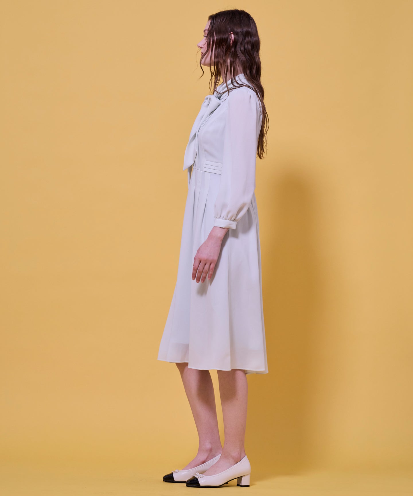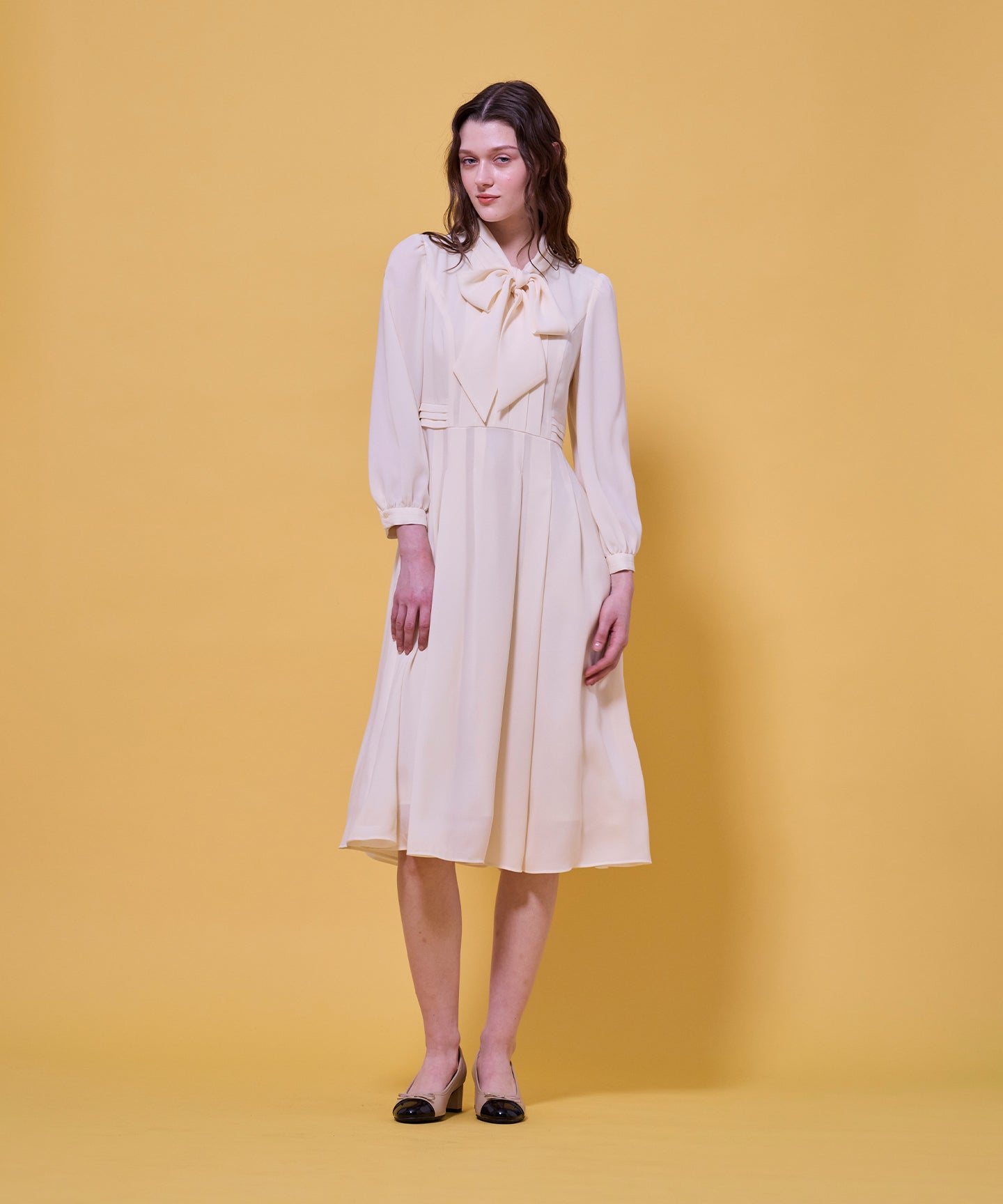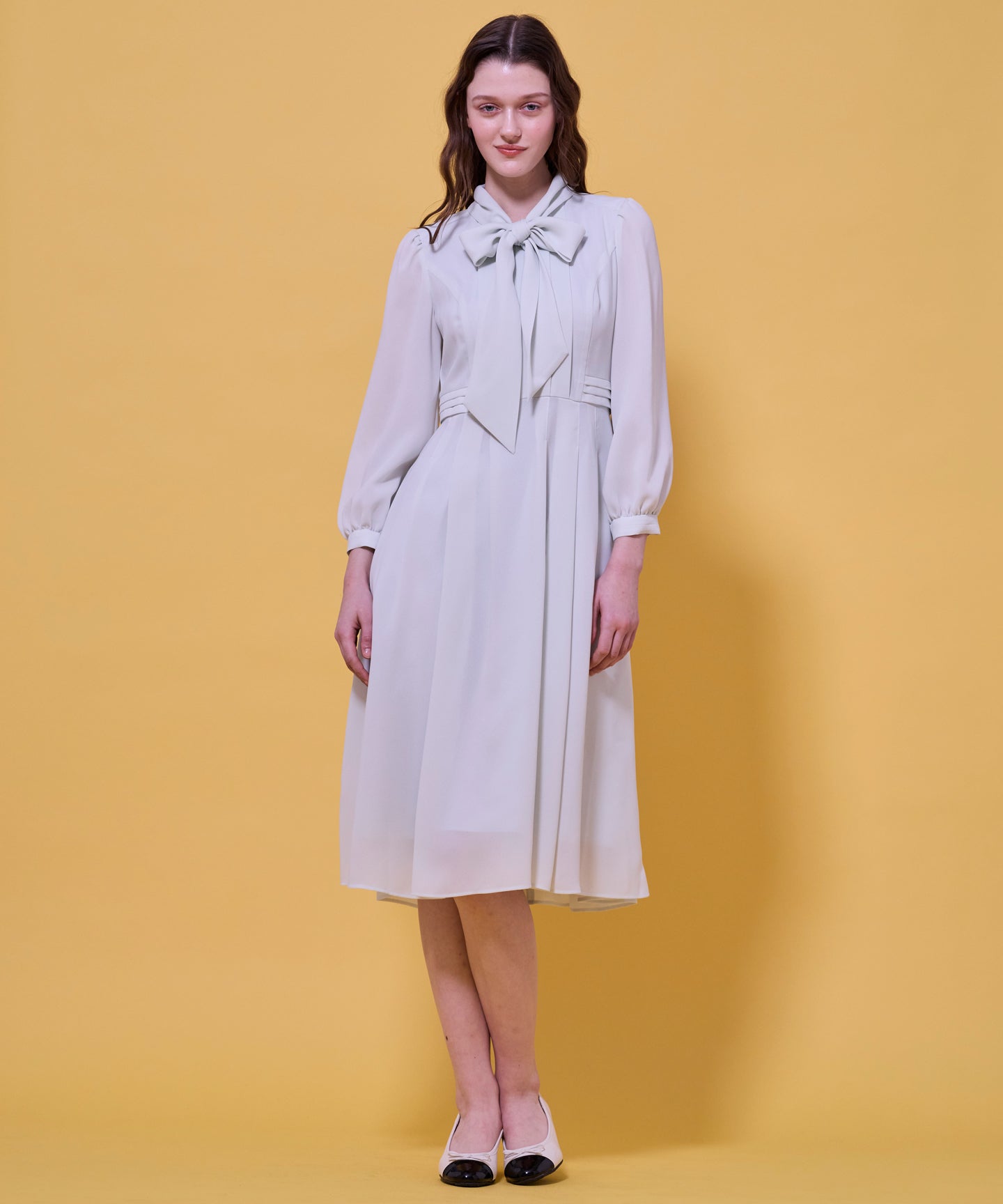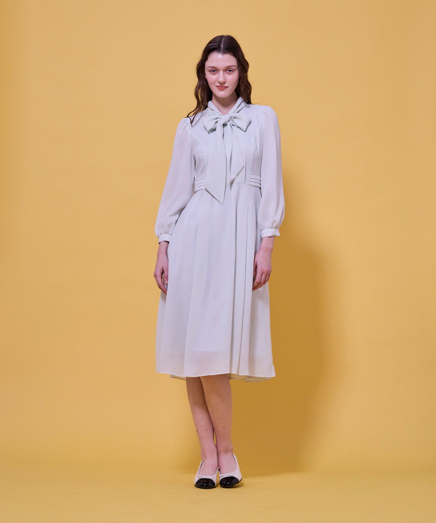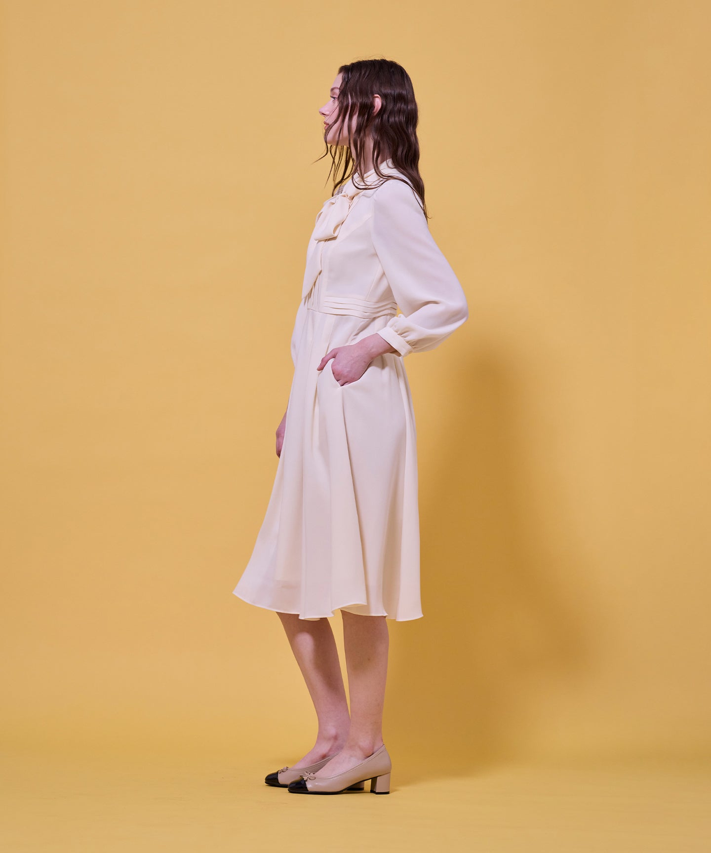 パウダリーな質感が女性らしい軽やかなシャツドレス。定番カラーのネイビーに加えて、今年は新色のミントとクリームイエローが登場。 ボウタイで華やかな印象を演出してくれます。フィット&フレア、タックやギャザーのディティールがTOCCAらしく可憐な印象です。 透け感の少ない素材なので、セレモニーや、オケージョンシーンにも上品に着こなせます。1枚での着用はもちろん、ジャケットやカーディガンとのコーディネートもお楽しみください。同素材でお作りしたブラウスもございます。