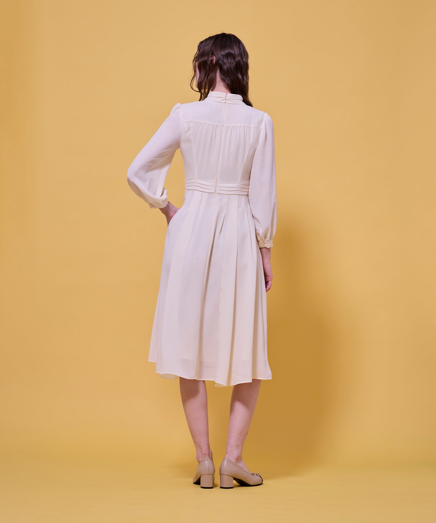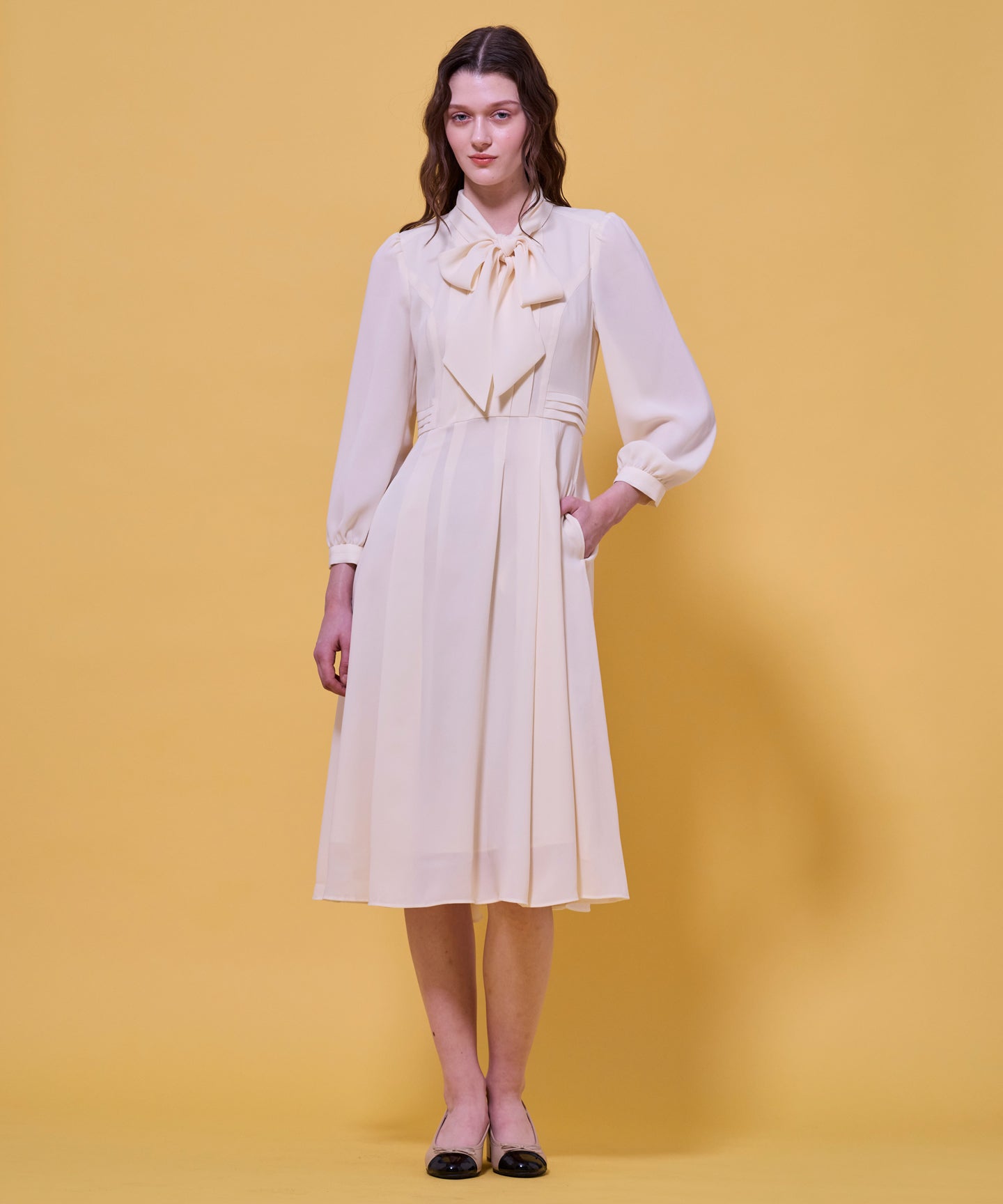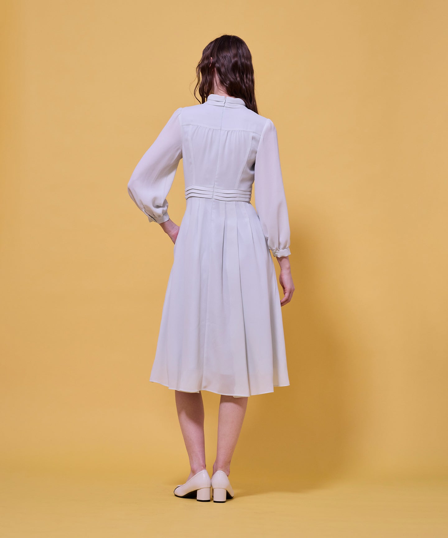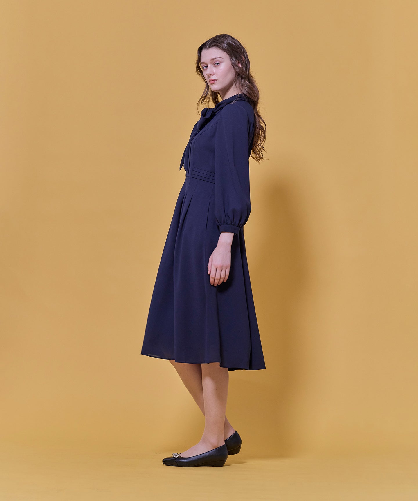 パウダリーな質感が女性らしい軽やかなシャツドレス。定番カラーのネイビーに加えて、今年は新色のミントとクリームイエローが登場。 ボウタイで華やかな印象を演出してくれます。フィット&フレア、タックやギャザーのディティールがTOCCAらしく可憐な印象です。 透け感の少ない素材なので、セレモニーや、オケージョンシーンにも上品に着こなせます。1枚での着用はもちろん、ジャケットやカーディガンとのコーディネートもお楽しみください。同素材でお作りしたブラウスもございます。