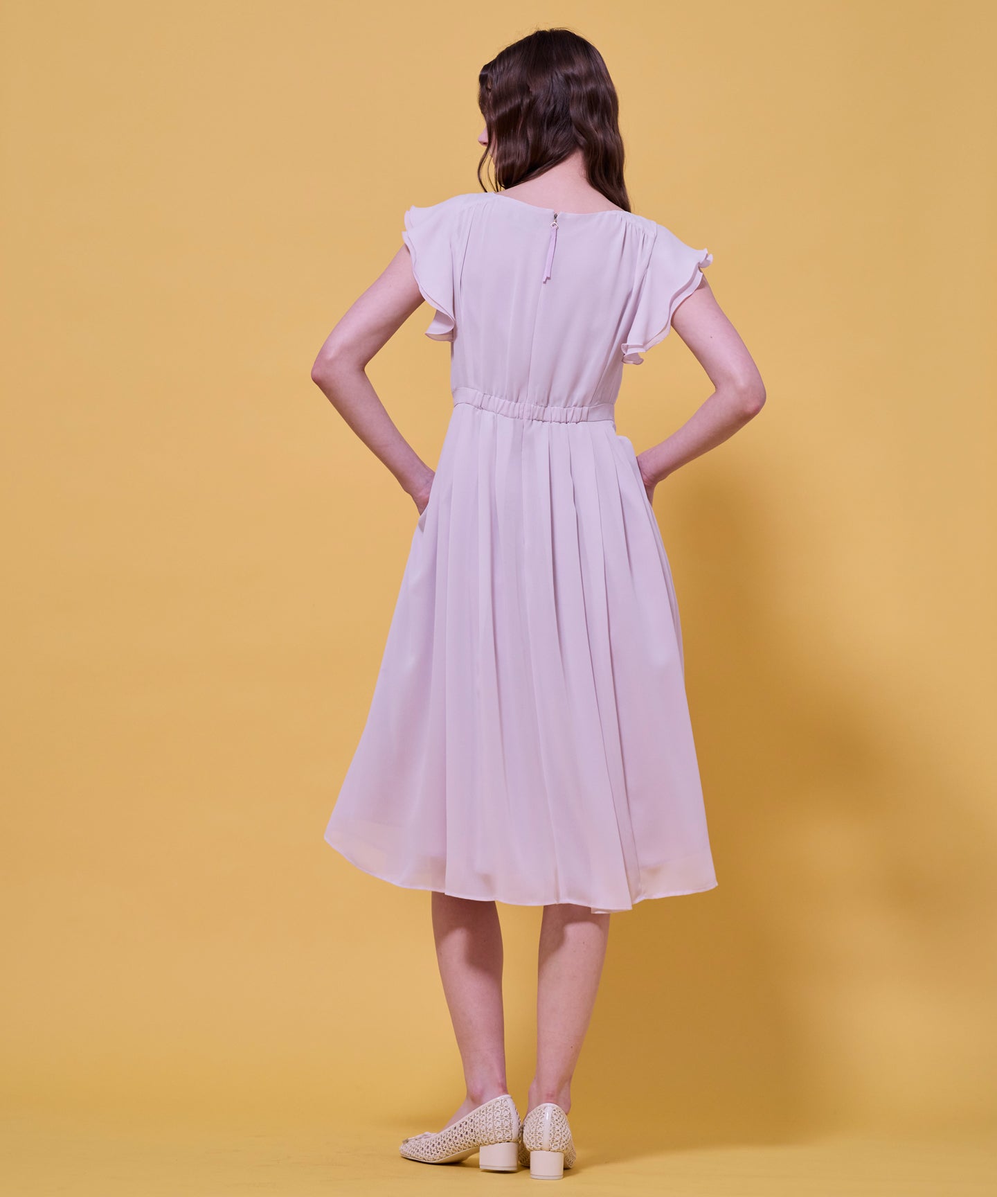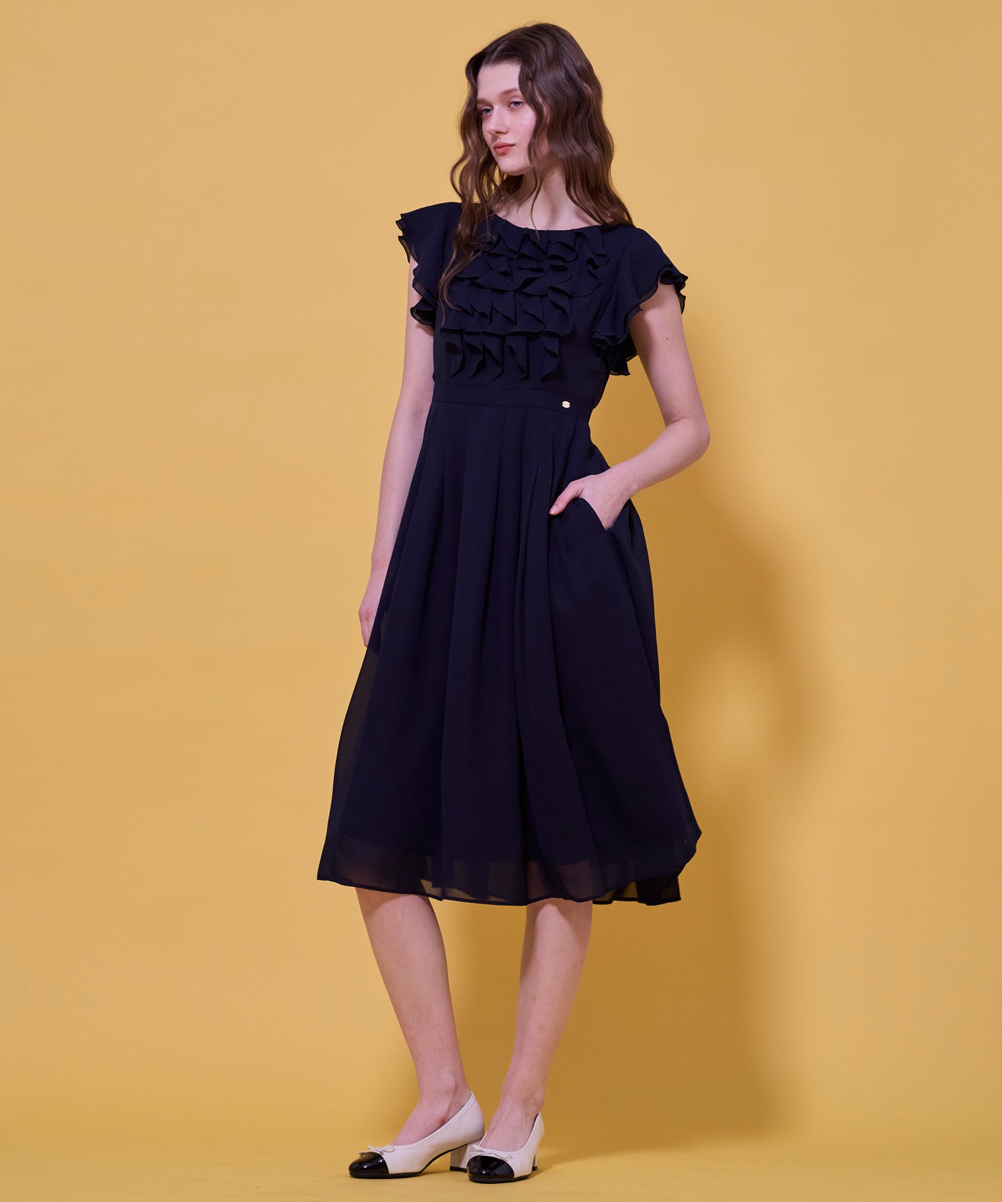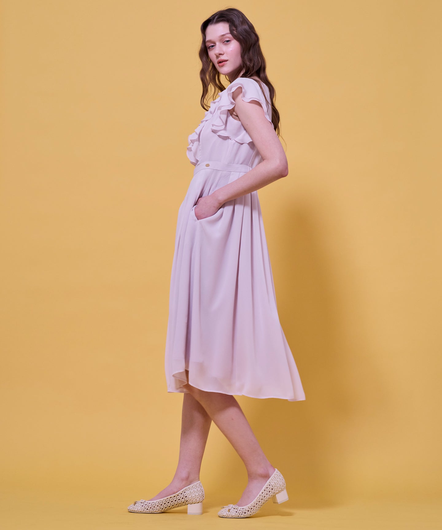 立体的なフリルが印象的な、華やかでフェミニンなドレス。 さらりとした軽やかな風合いと程よい透け感があり、動くたびにふんわりと揺れる上品なシルエットを生み出し、肩から流れるようなフリルスリーブが二の腕をさりげなくカバーしつつ、軽やかで女性らしい雰囲気を演出します。 ウエストはすっきりと切り替えを入れ、スカート部分にはゆったりとしたプリーツを施すことで、美しいドレープと動きを楽しめるデザインに。 特別なお出かけや華やかなシーンにぴったりなドレスです。