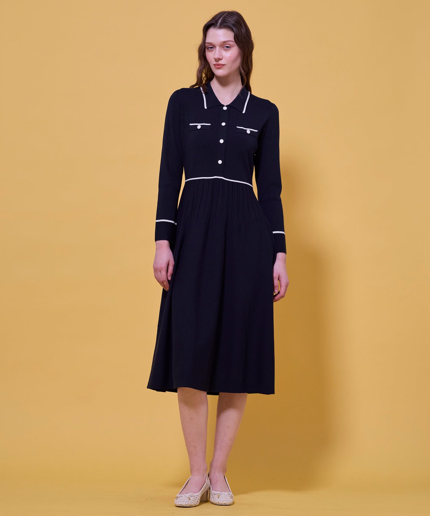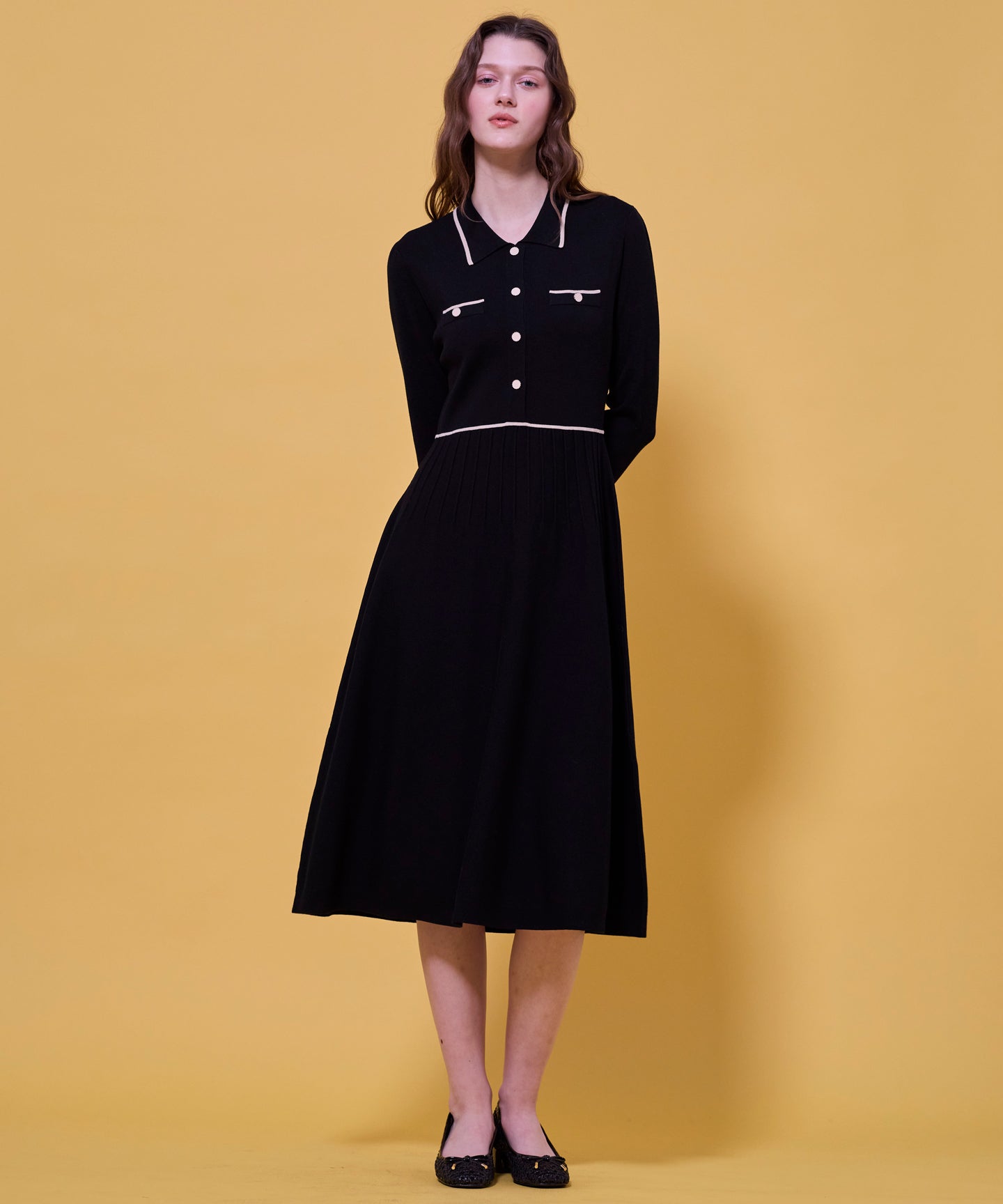 バイカラーデザインが印象的なニットドレス。柔らかなニット素材を使用しているため、着心地が良く、ほど良いフィット感で女性らしいシルエットを叶えてくれるのが魅力。襟やポケット口、ウエスト、袖口に施されたラインが全体を引き締め、上品でクラシカルな雰囲気を演出します。フロントのボタンデザインがアクセントになり、きちんと感をプラスしてくれます。