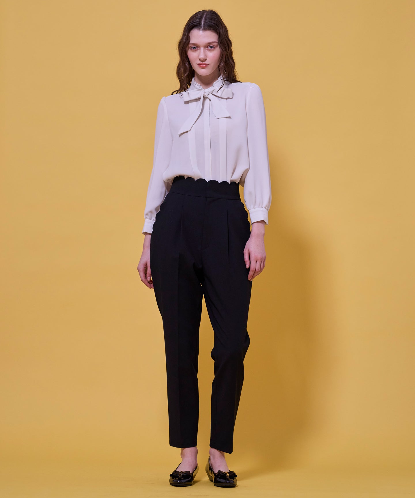 ウエストとポケット部分にスカラップカットを施した、フェミニンな表情のハイウエストパンツ。
