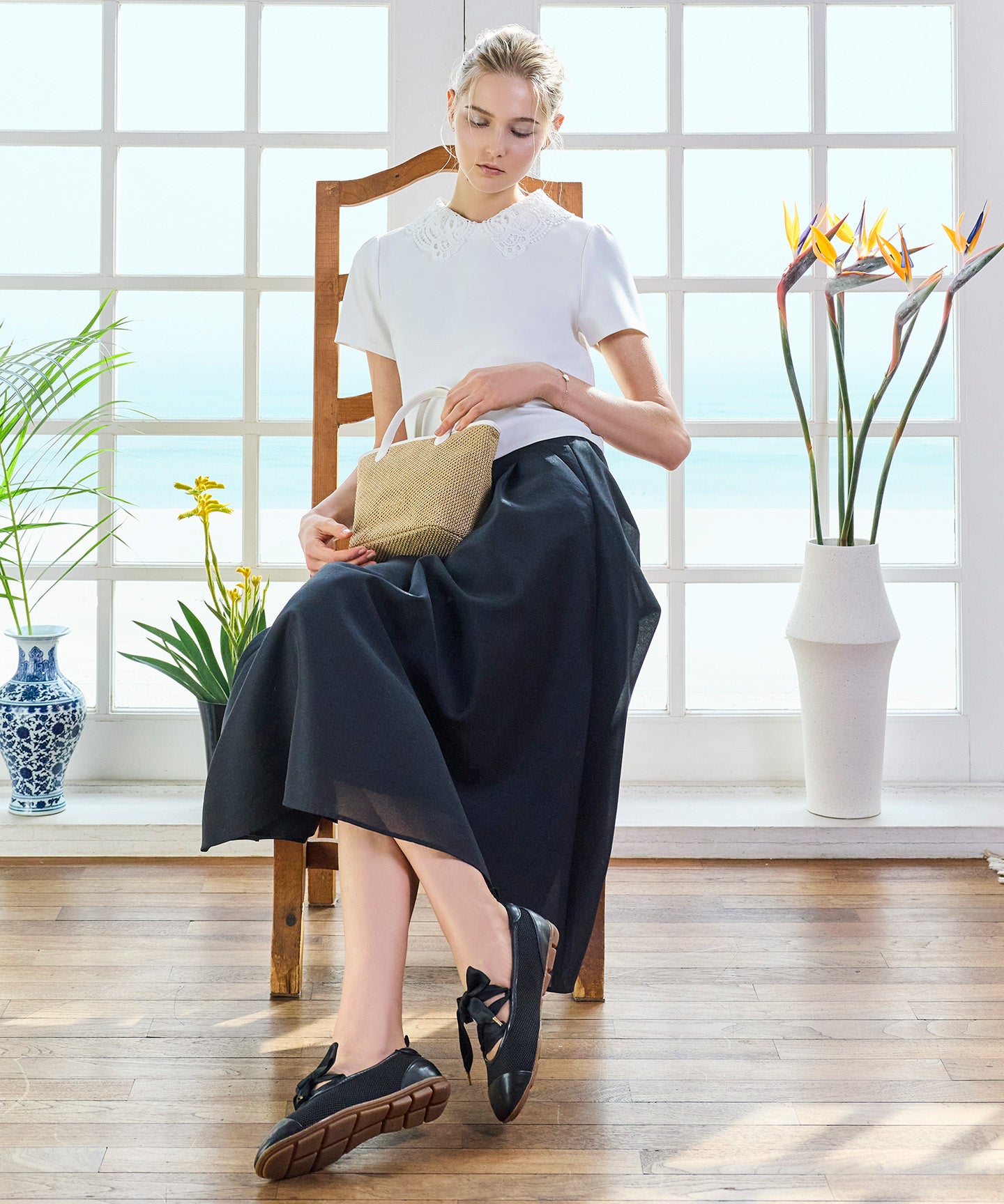 ベースには通気性の高いニット素材を使用していて、軽くて屈曲が良く履き心地が快適。履き口が浅めでトゥシューズのようなロマンティックなムードのアッパーにドライビングソールを組み合わせ、ほどよいスポーティーなエッセンス・安定感の良さを兼ね備えます。 シューレースはマットな光沢感が大人っぽいワイド幅のサテンリボンと通常のシンプルタイプの2本をセットに。お好みやスタイリングにより雰囲気を変えてお楽しみいただけます。