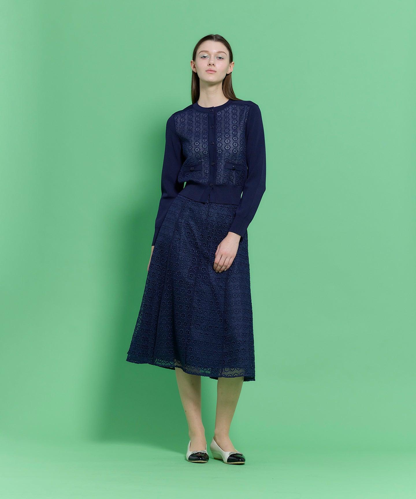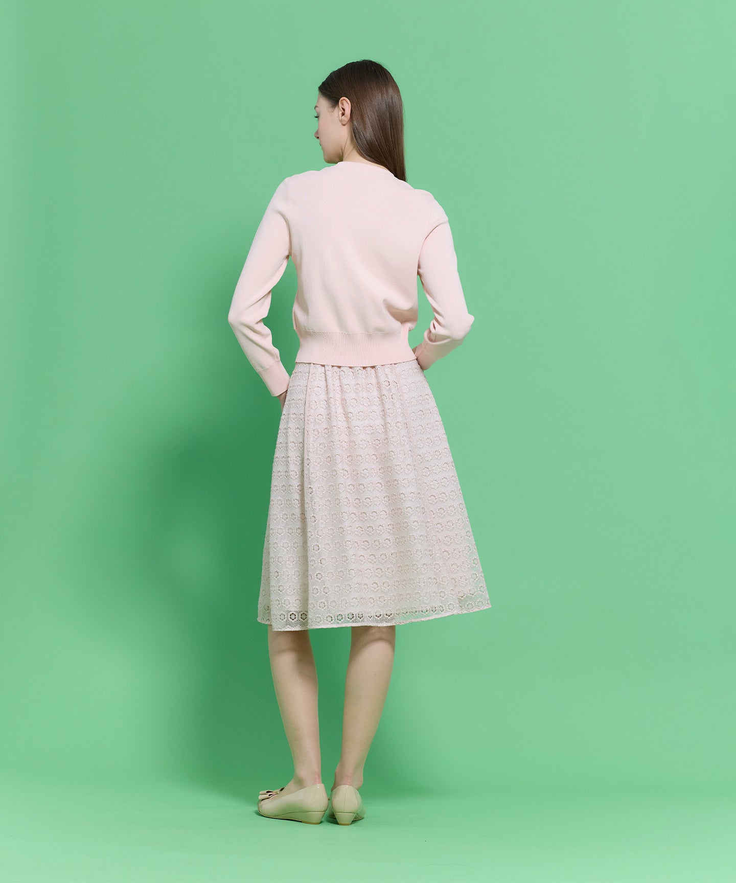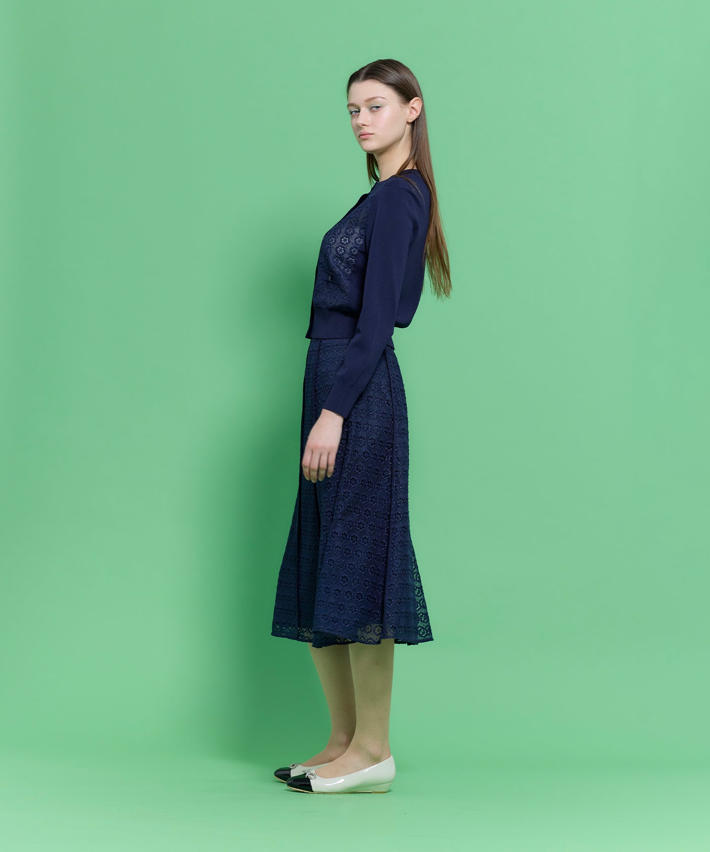 通勤やお食事など幅広いシーンに活躍する、繊細な総レース素材を贅沢に使用したエレガントなスカート。 透け感のある軽やかなレースをすとんと落ちるシルエットに仕立てることで、華美になりすぎず、大人の洗練を感じさせる一枚に仕上げました。程よい抜け感とフェミニンさをプラスしてくれる、万能な一枚です。