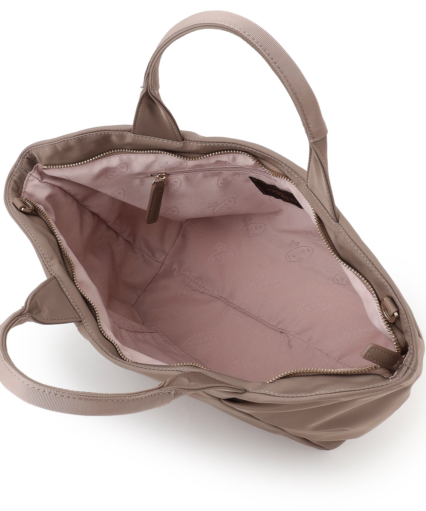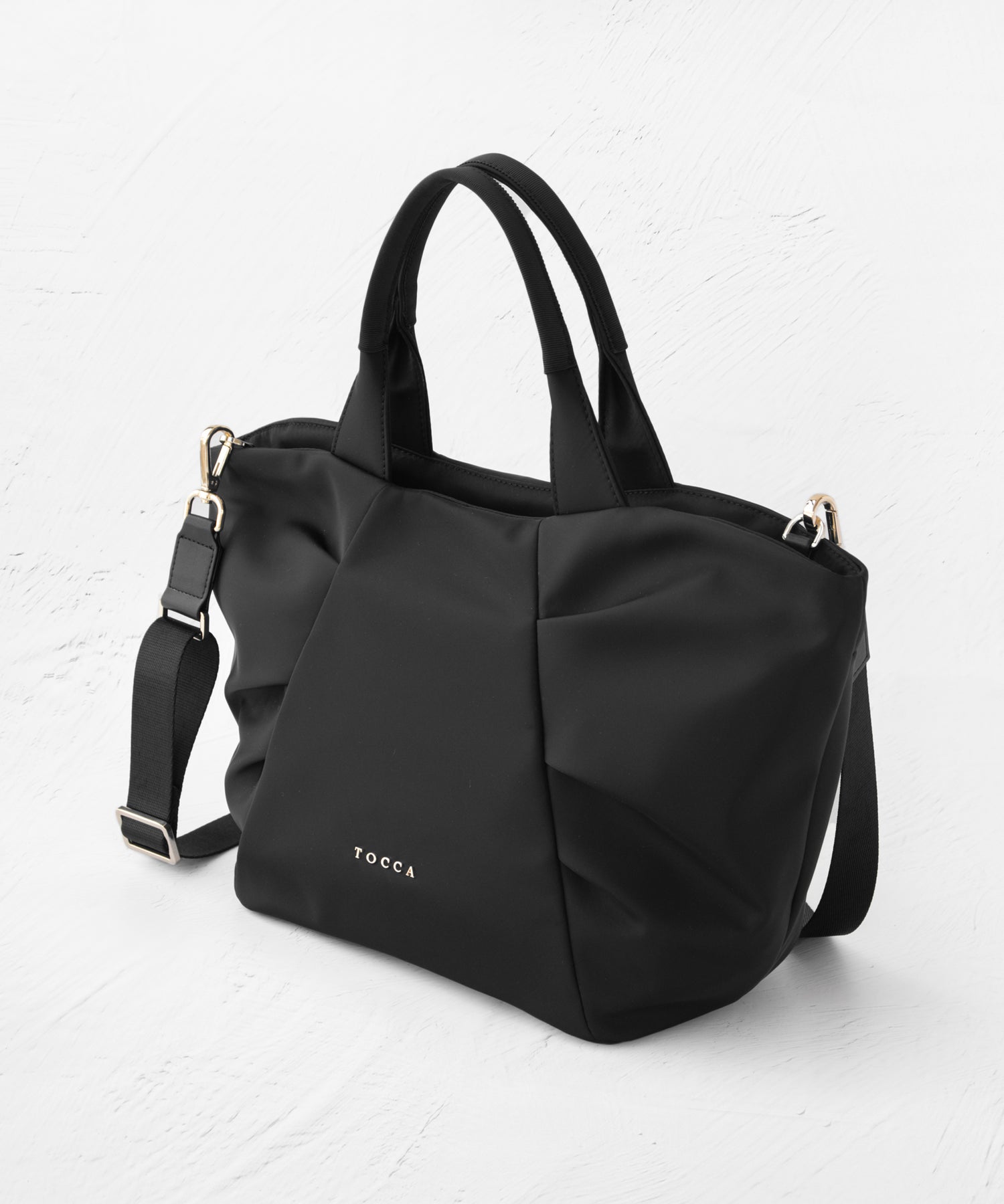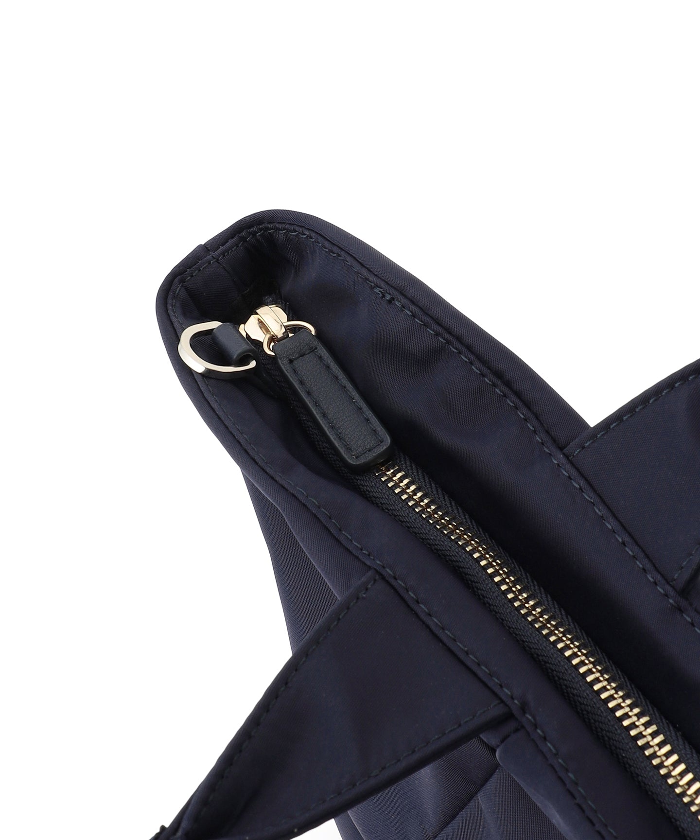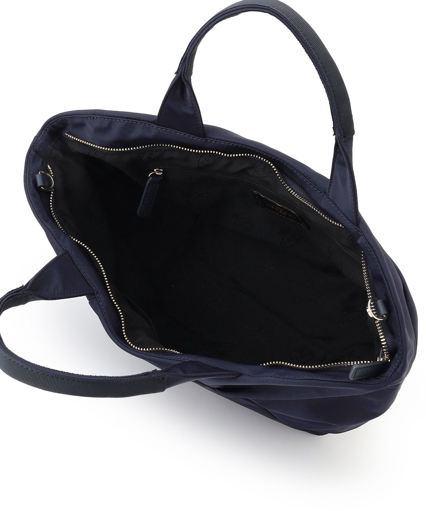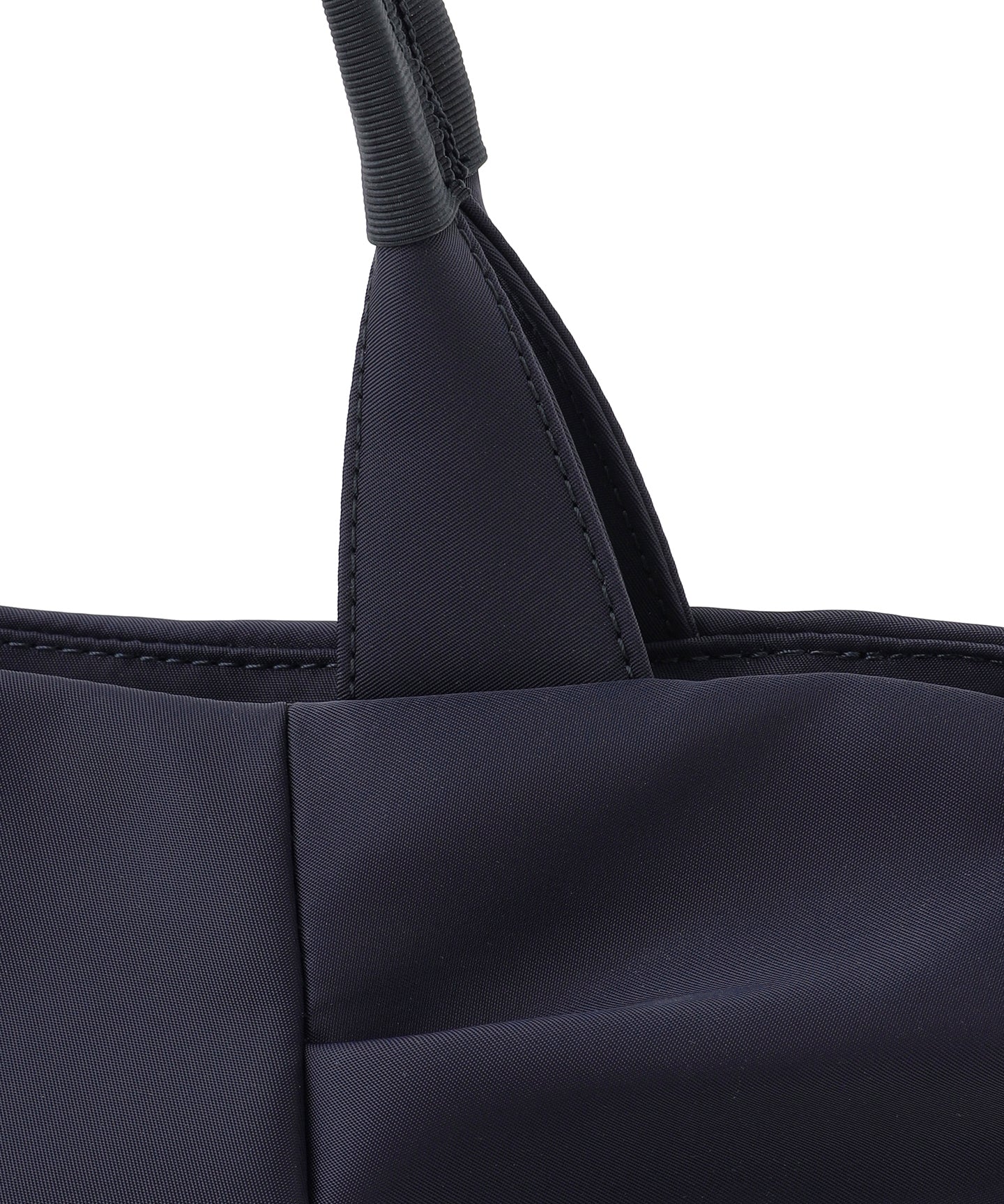 フォルムがさりげなくリボン見えする、程よいサイズのナイロントート。フロントのタックや口元のやわらかいカーブが、優しいフェミニンなリボンのムードを映し出します。 メインコンパートメントにはトップファスナーが付いていて、背胴側には開閉が楽なマグホックポケットを装備。取り外し可能なショルダーストラップでハンズフリースタイリングも叶う2WAY仕様で、見た目だけではなく使いやすさにもこだわっています。「絆」を意味するリボンからインスパイアされたデザインには、バッグを手にする方に縁を招き心に癒しをもたらすように、とのメッセージが込められています。【対応しているもの】・長財布(約10cm×20cm)・ペットボトル縦/横向き(500ml)【仕様】・内ポケット:2(オープン・ジップ)・外ポケット:1(マグネット)
