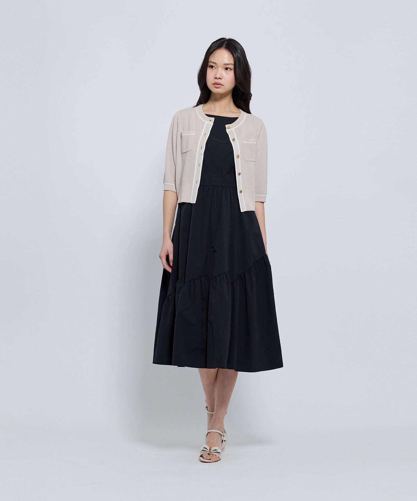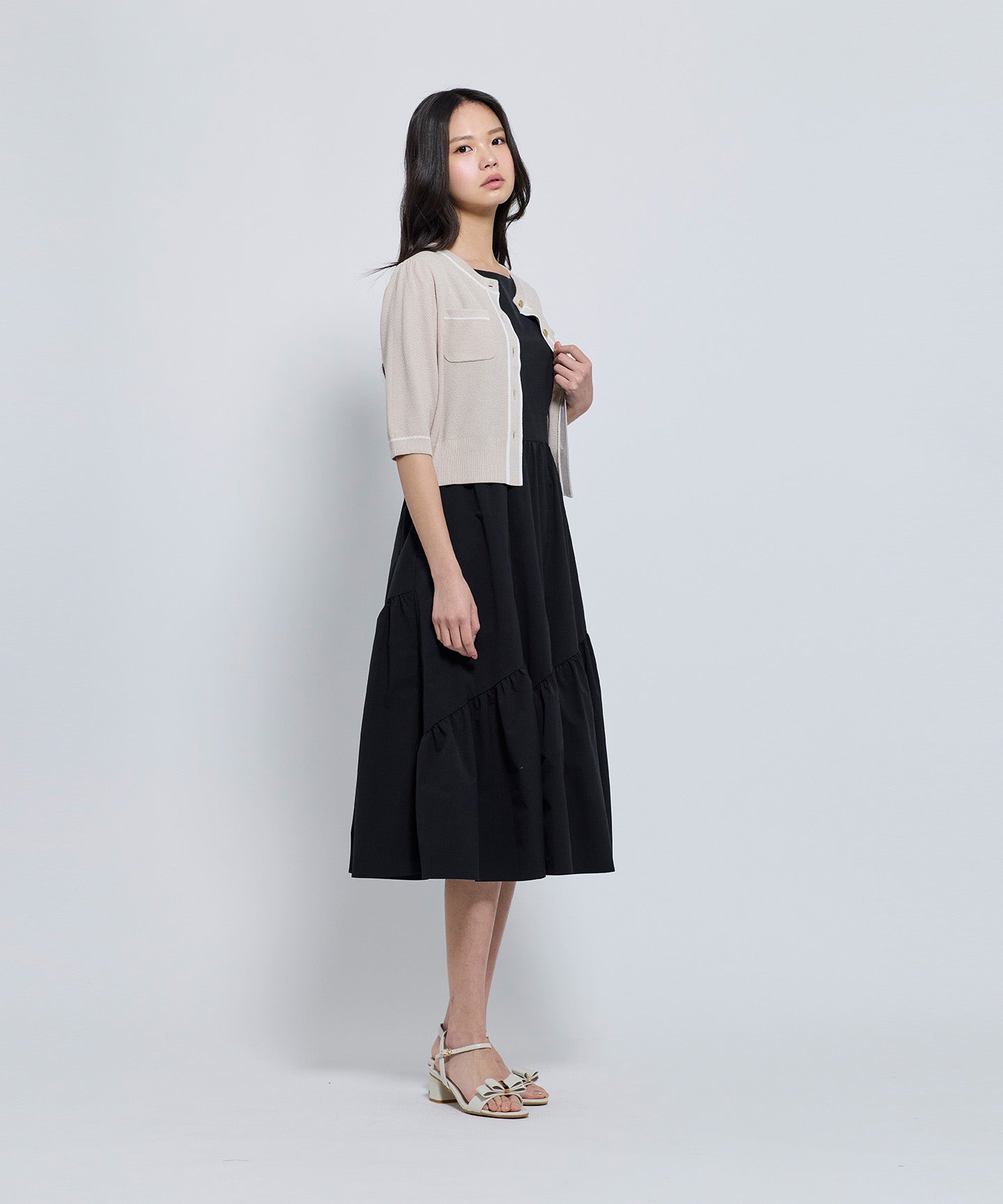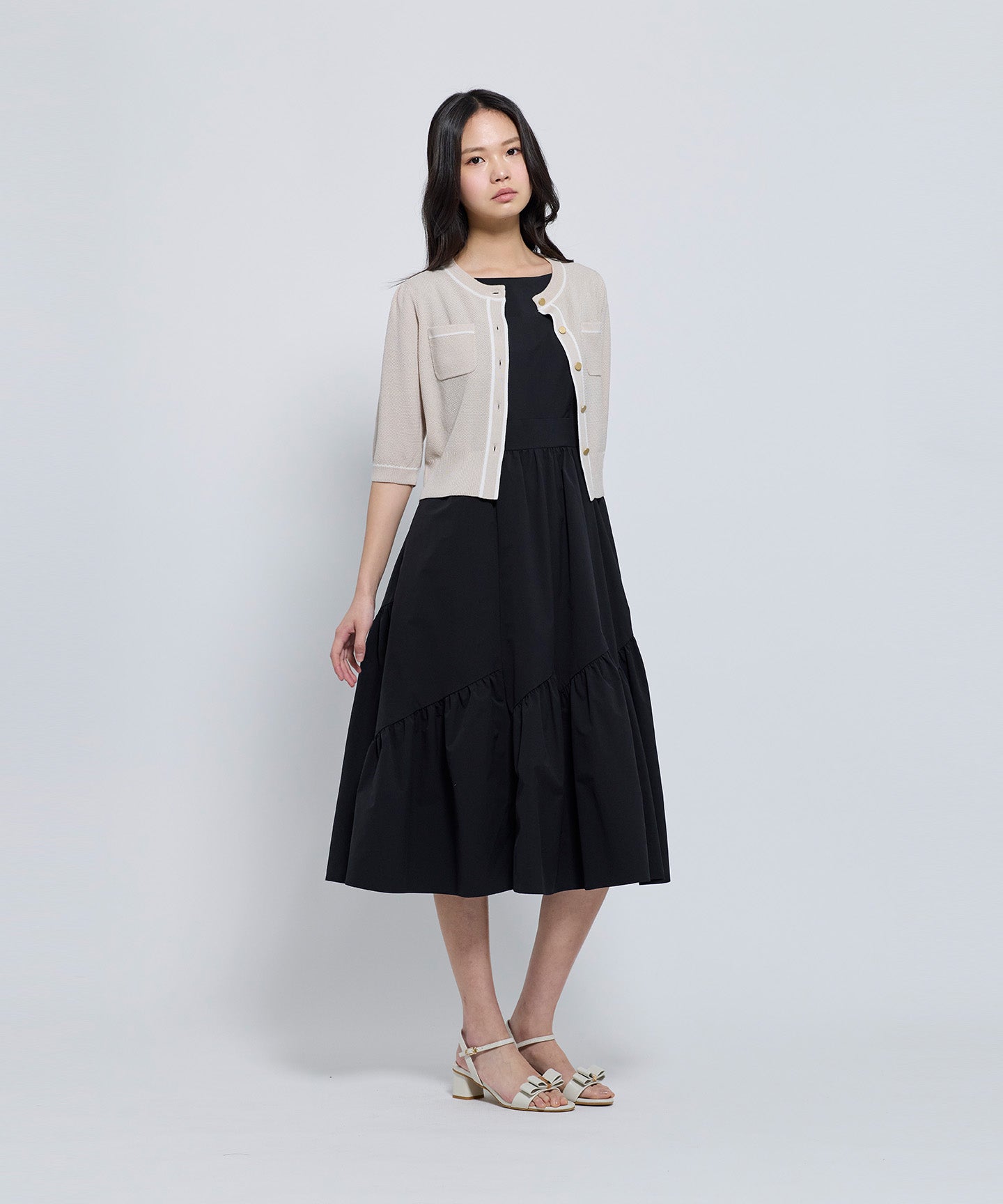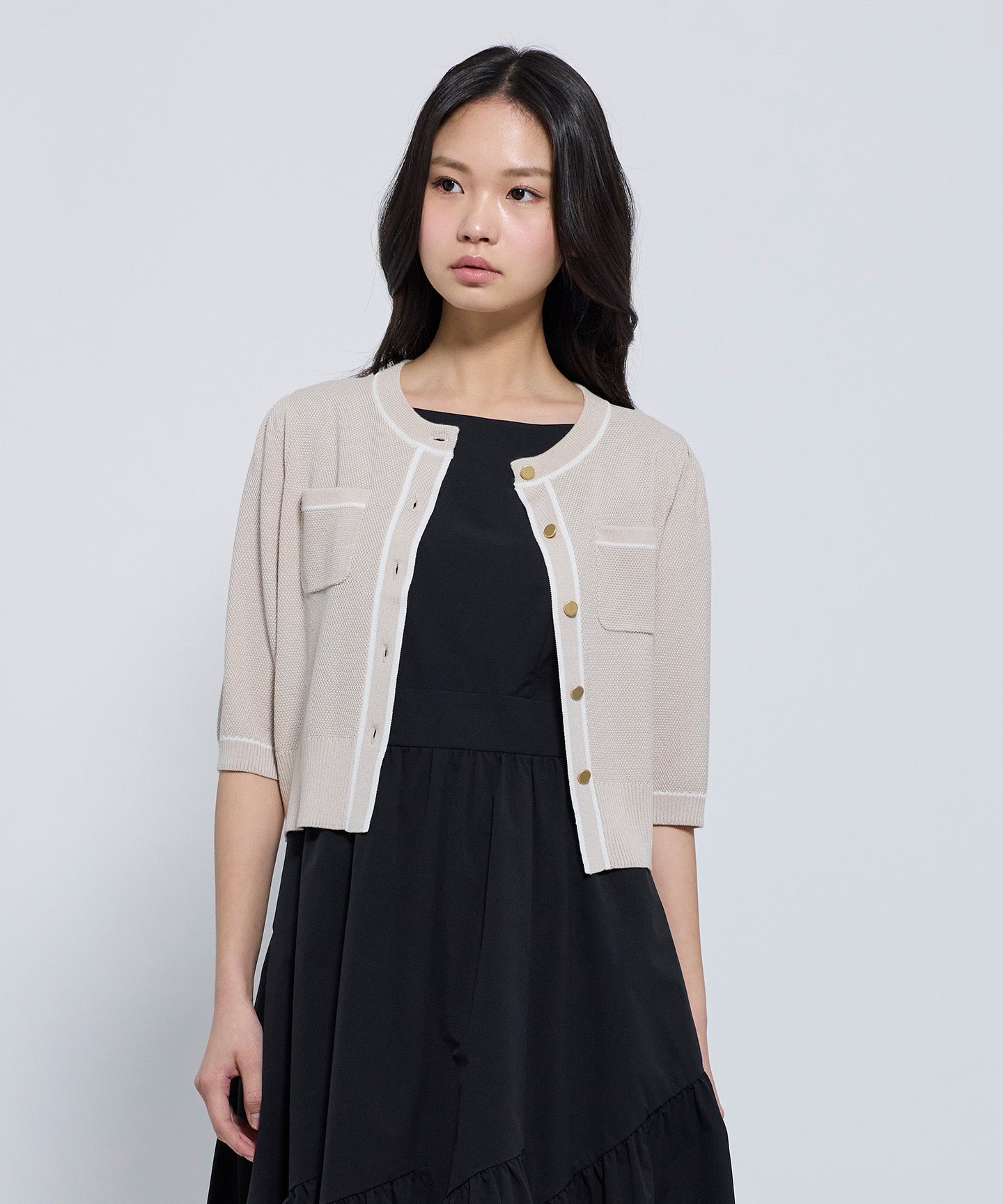 フロントとポケット部分には配色のトリミングを施し、きちんと感とデザイン性をプラスしています。コンパクトなシルエットと七分袖で、羽織りとしてもトップス感覚でも着用可能。きれいめからフェミニン、オフィスカジュアルまで幅広いシーンで活躍する1枚。