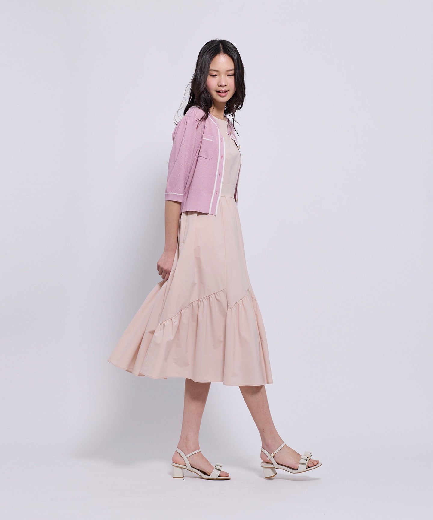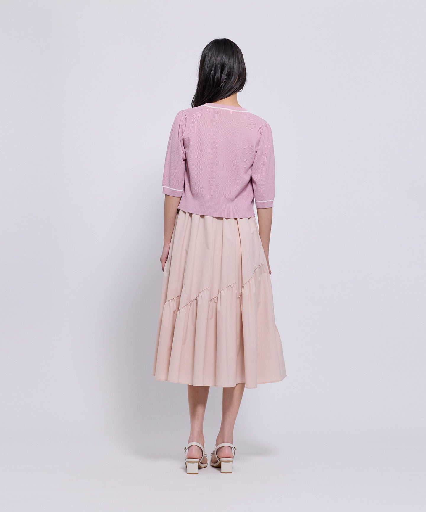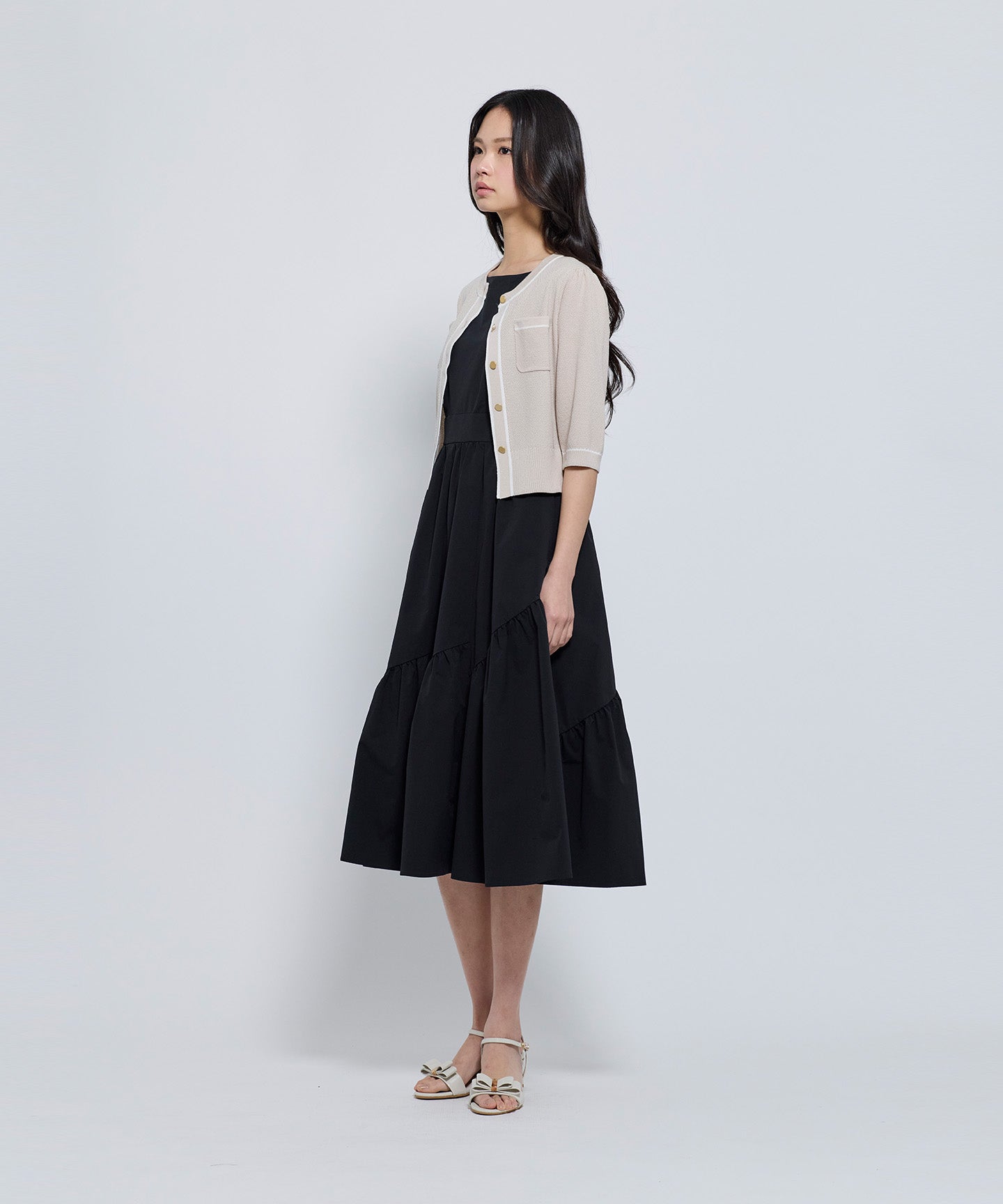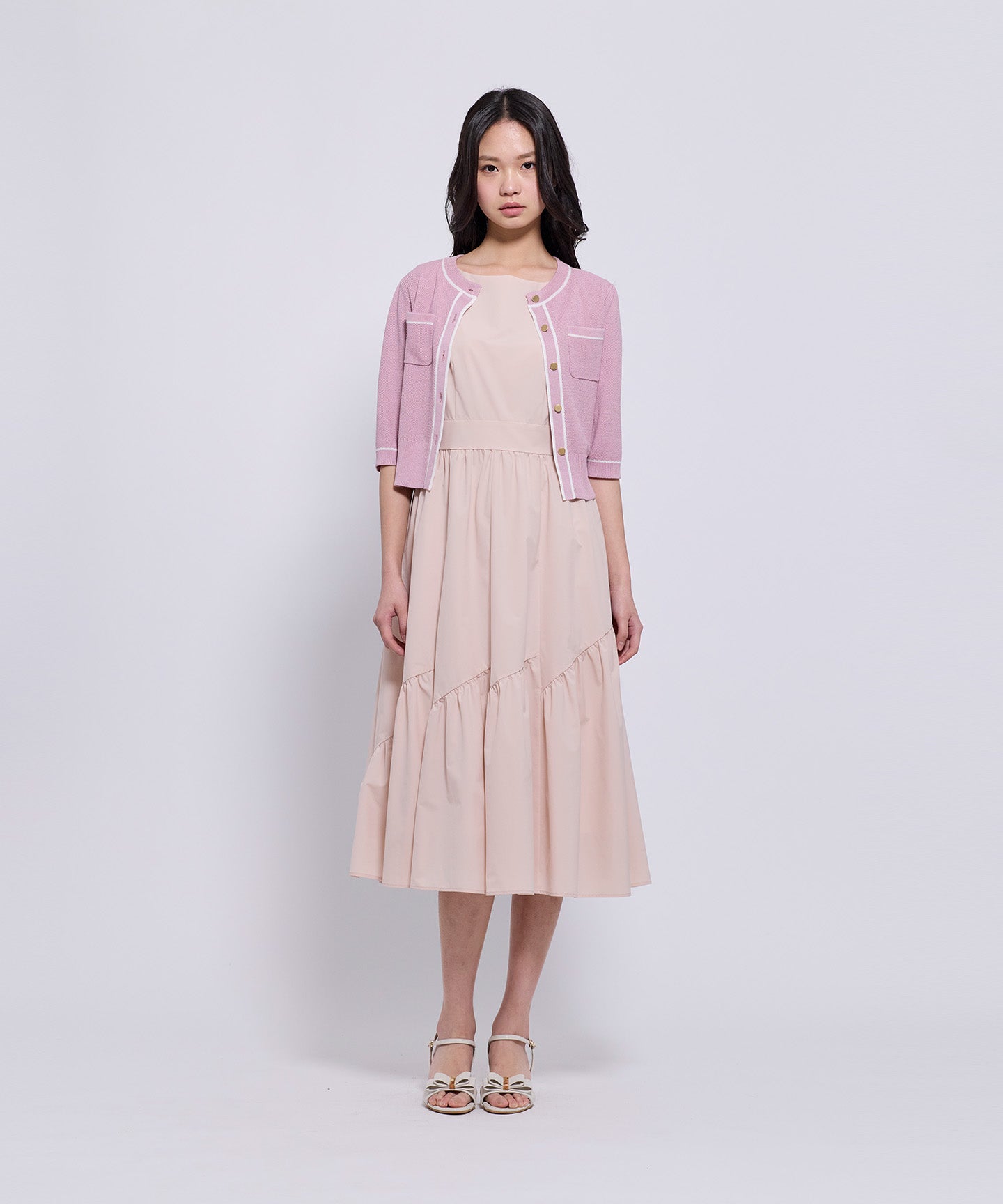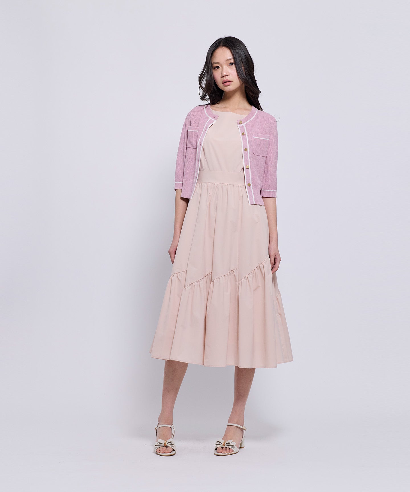 フロントとポケット部分には配色のトリミングを施し、きちんと感とデザイン性をプラスしています。コンパクトなシルエットと七分袖で、羽織りとしてもトップス感覚でも着用可能。きれいめからフェミニン、オフィスカジュアルまで幅広いシーンで活躍する1枚。