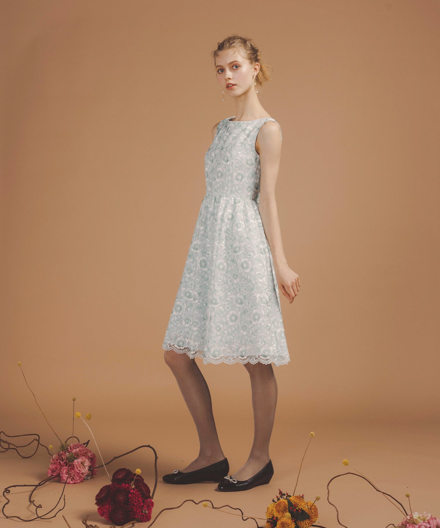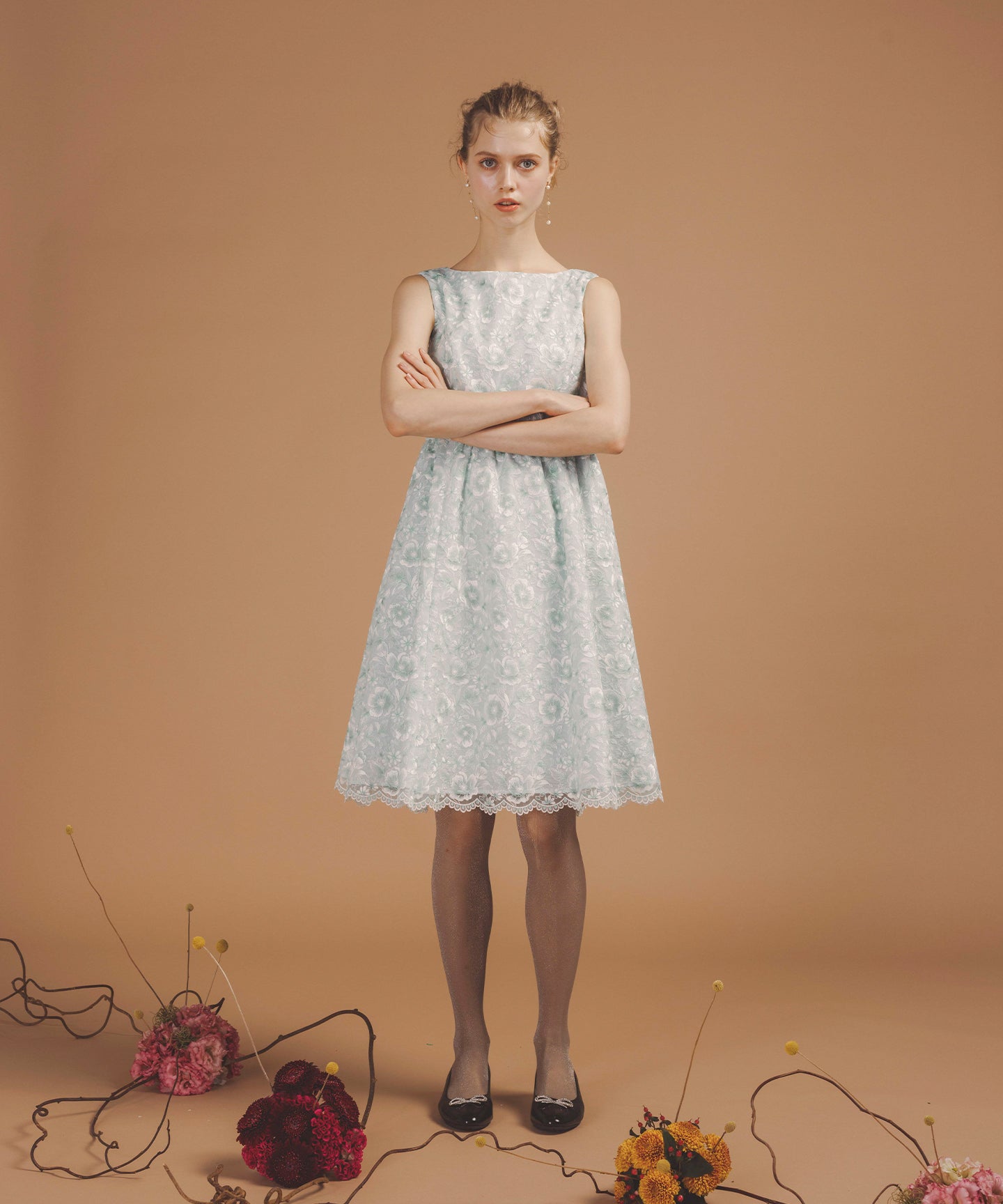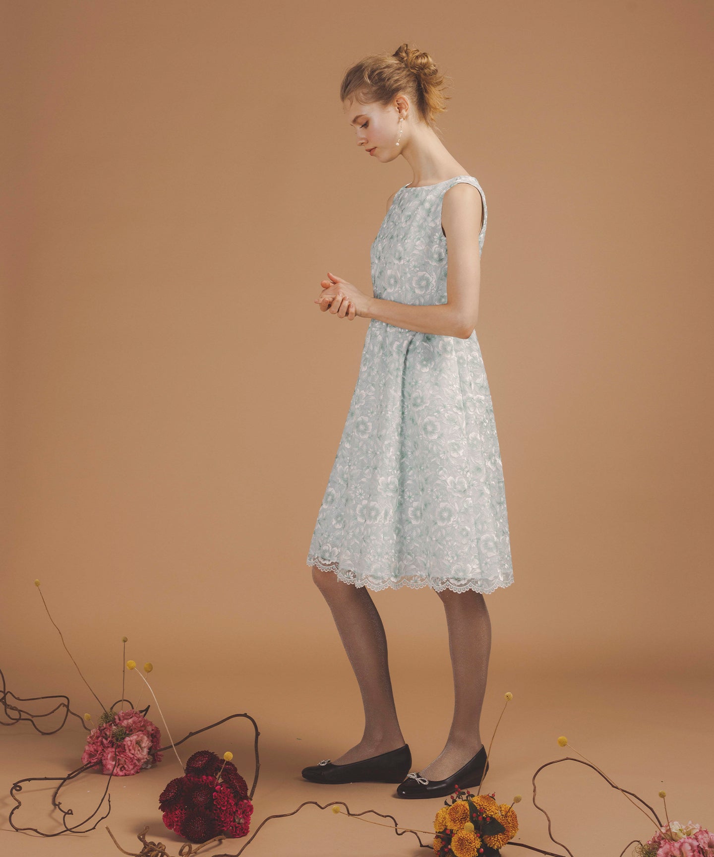 繊細なフラワー刺繍が華やぐ、フィット&フレアのオーガンジードレスです。透明感のあるオーガンジーに淡いピンクとミントの刺繍を施し、軽やかで可憐な雰囲気を纏います。ウエストラインを美しく見せるフィット&フレアのシルエットで、女性らしさを際立たせながらも上品な印象に仕上げました。特別な日を彩る一着としておすすめです。
